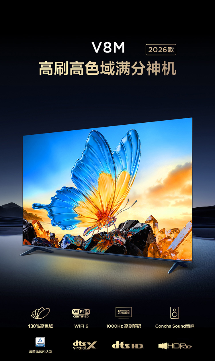 【2026款】TCL电视 65V8M 65英寸 144Hz 万元级高色域 MEMC防抖 WiFi6 2GB+32GB大内存电视