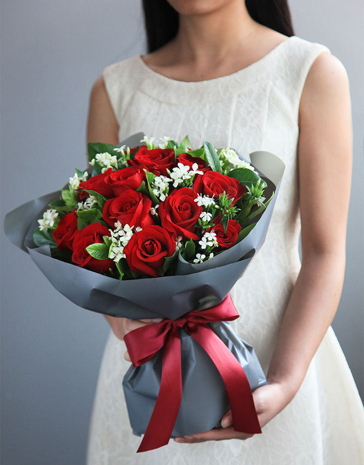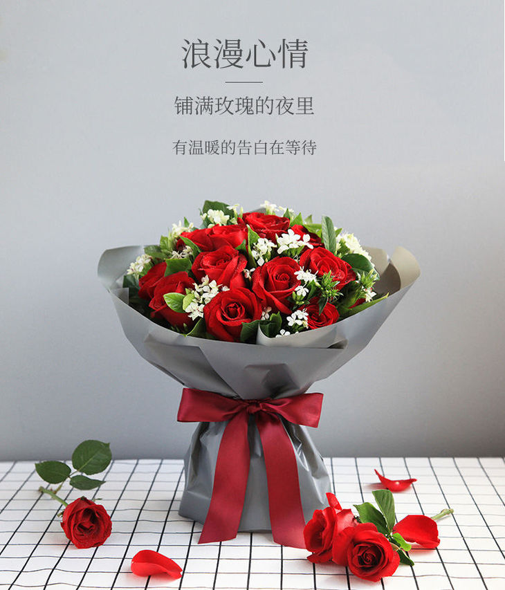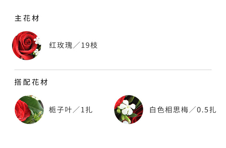 红玫瑰19枝,白色相思梅0.5扎(或满天星),栀子叶1扎