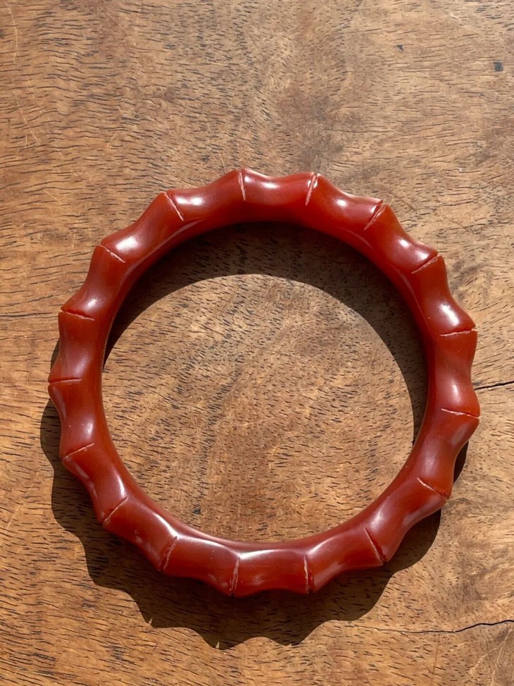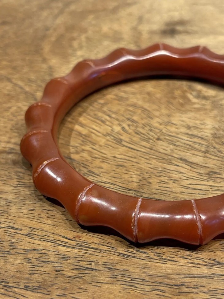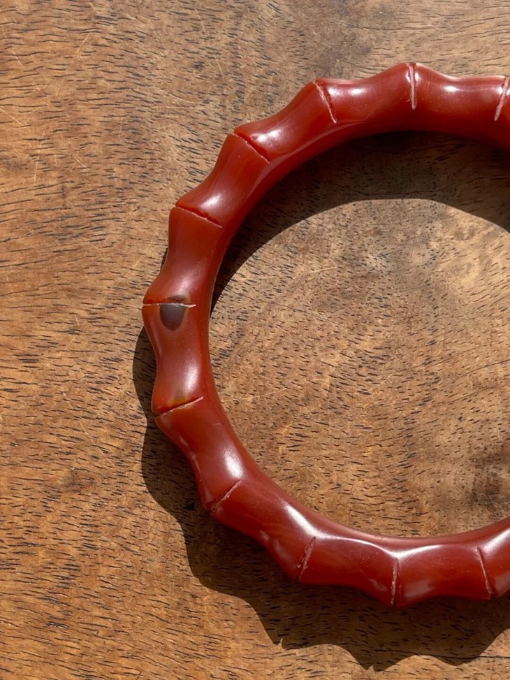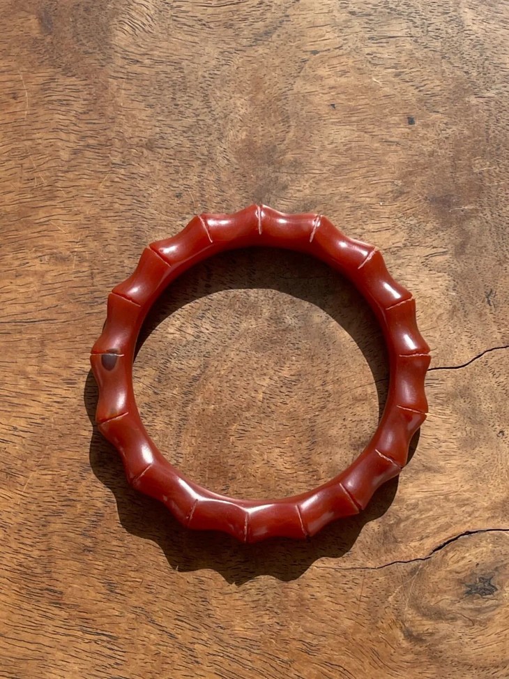 此一天然艳红玛瑙雕琢竹节纹手镯,入手可即刻佩戴,红玛瑙的质感与色泽有如凝结的红酒冻略泛荧光,雕琢弧线精美,表面老皮壳油润如玉、清新脱俗,色彩艳红时髦,绝无其它材质之老旧淤腐气,是不可多得可搭配时尚服的艳丽手镯。此艳红瑪瑙竹节纹手镯除凸棱处有细微磕碰痕,内侧有一处浅裂痕,除此以外,基本保存完好。
