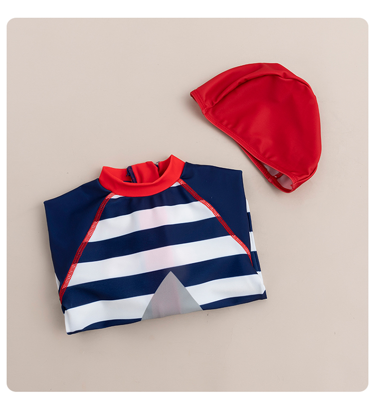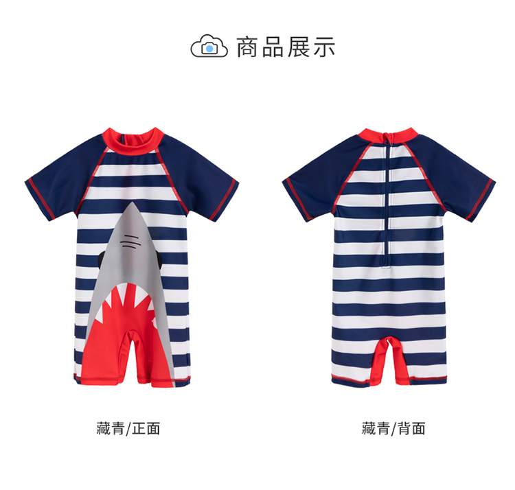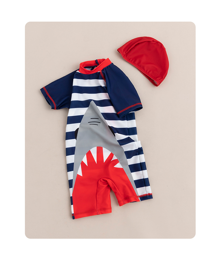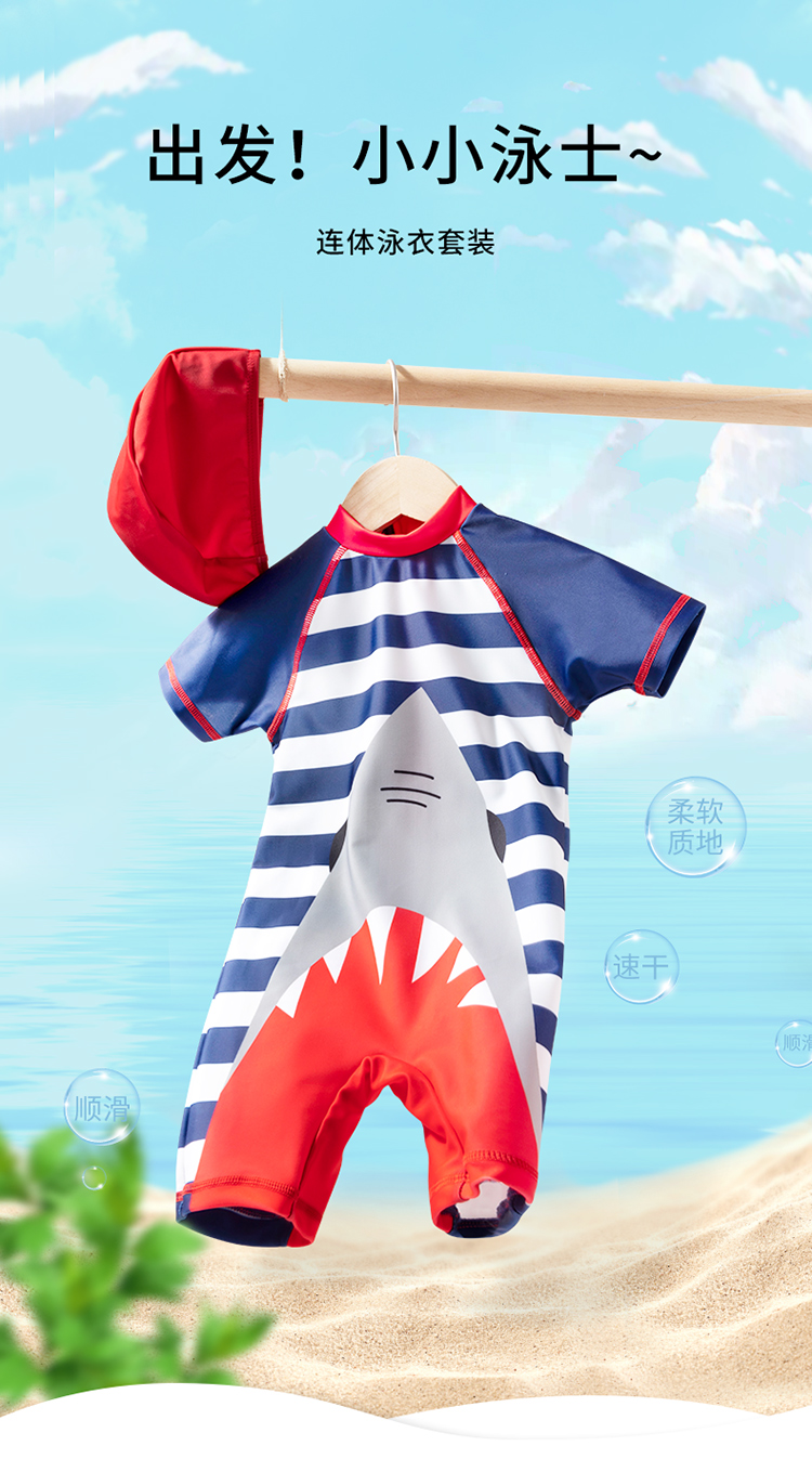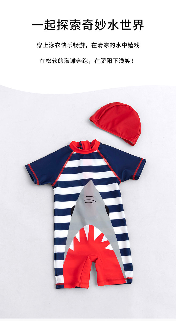 贝贝怡儿童泳衣连体短袖泳装男孩速干清爽游泳衣泳帽套装男童夏季222P2446