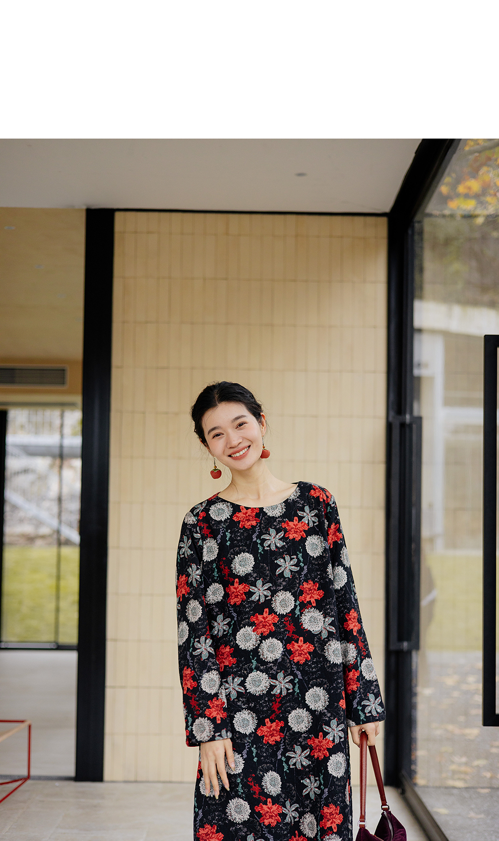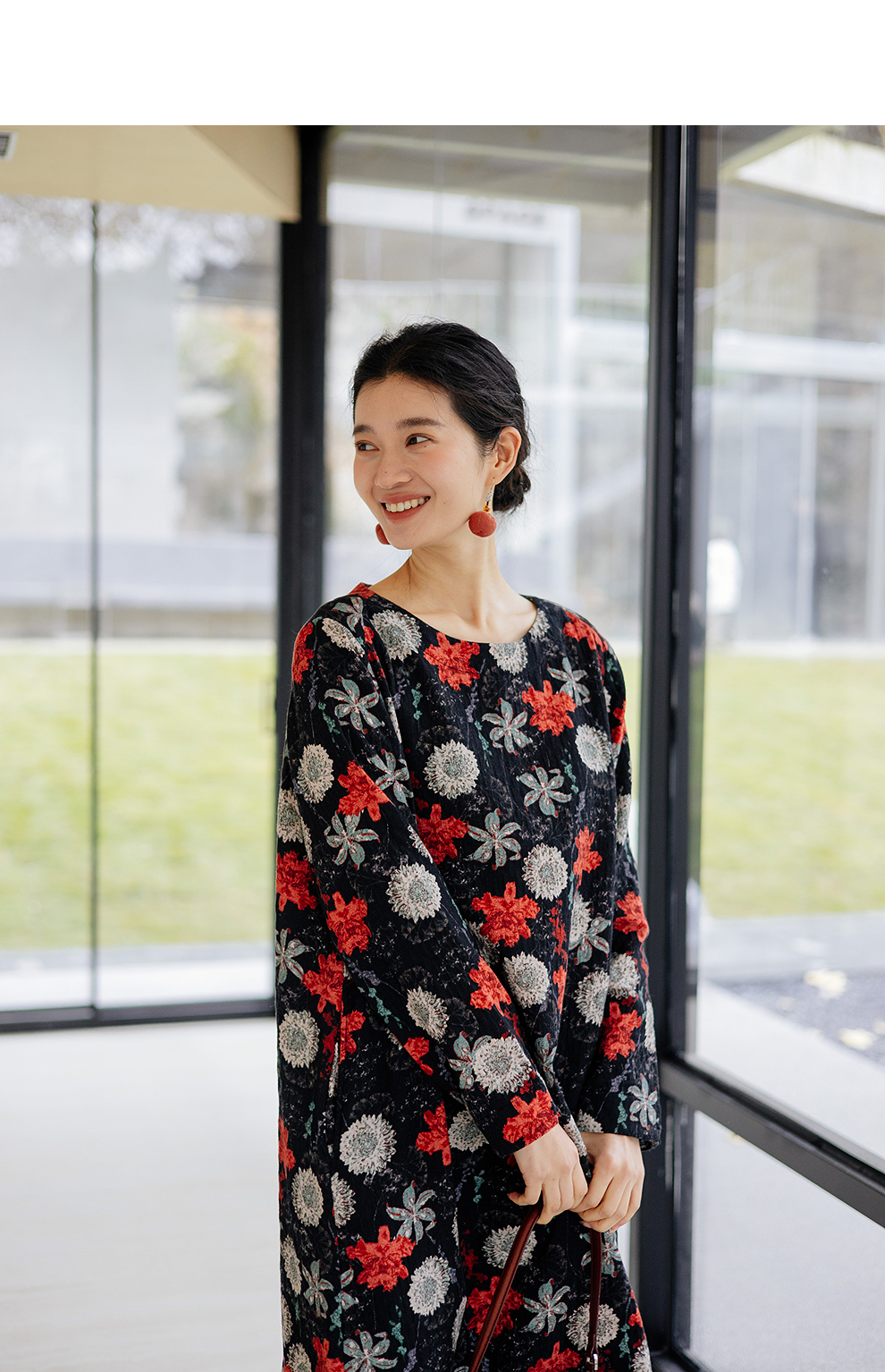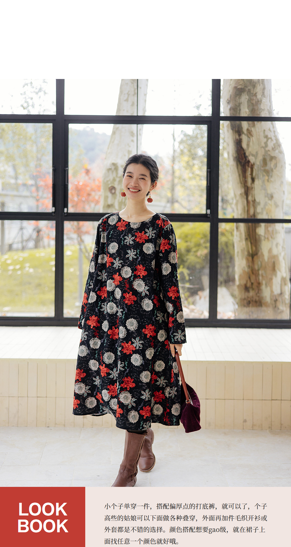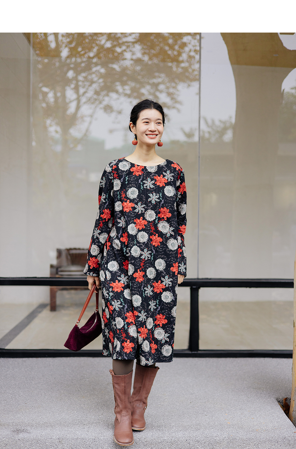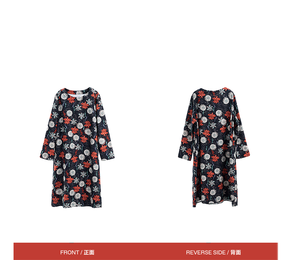 绽放旅行女装006朵/双层复合纯棉印花圆领正常肩长袖中长款连衣裙