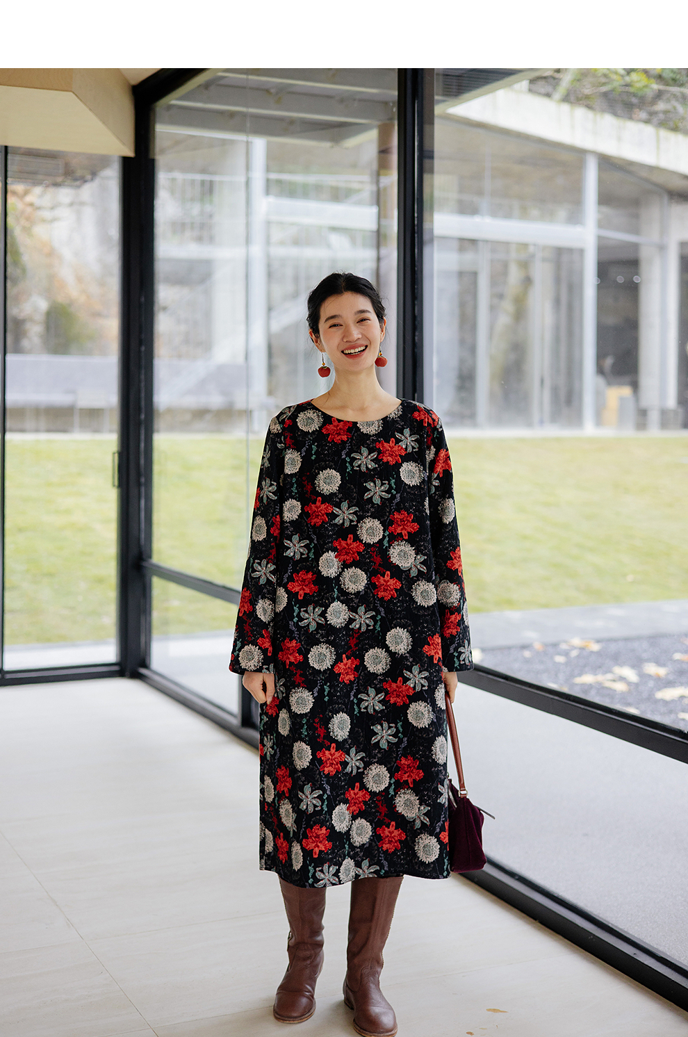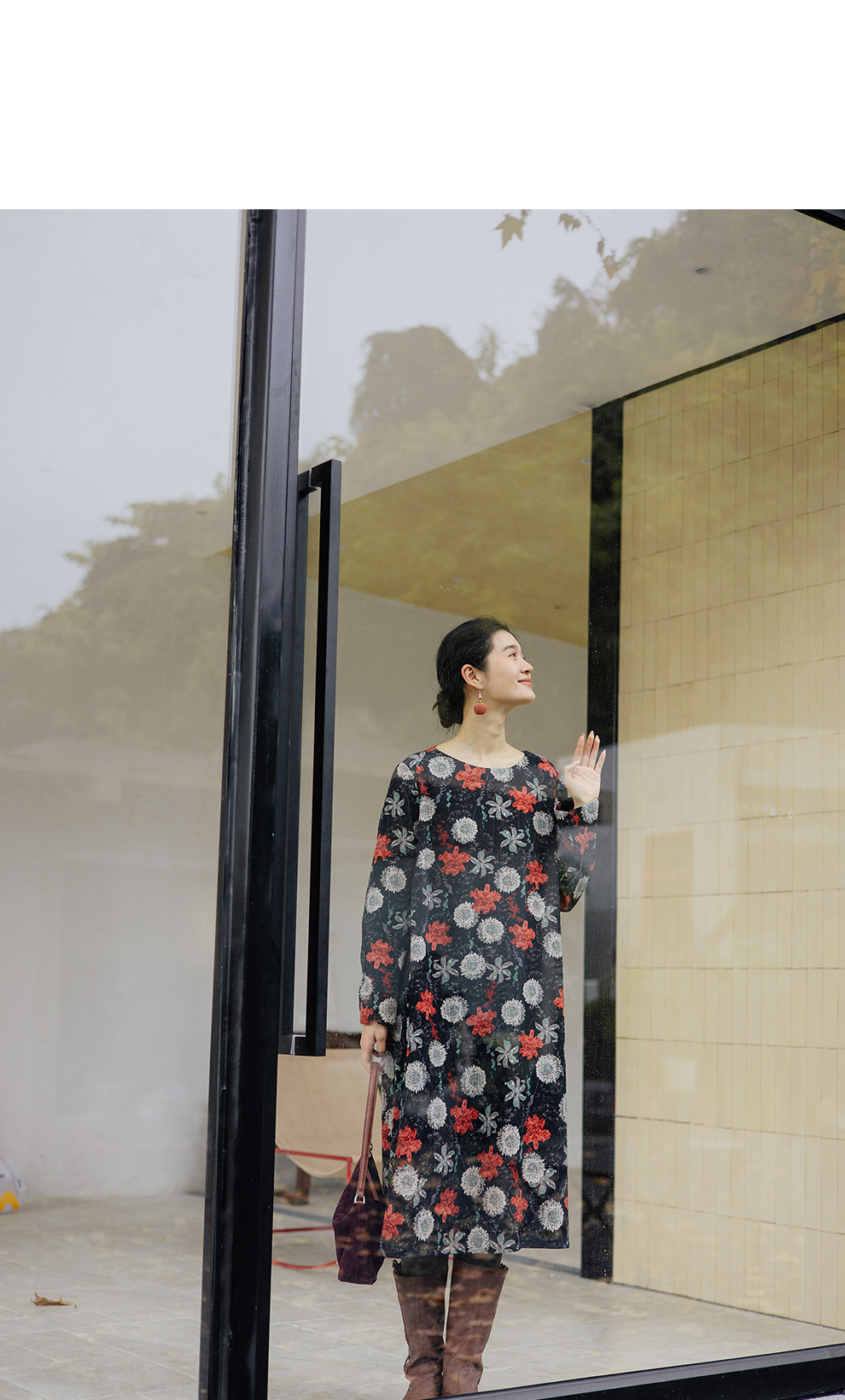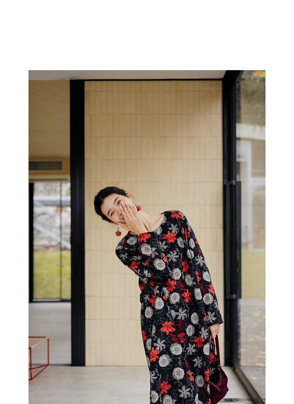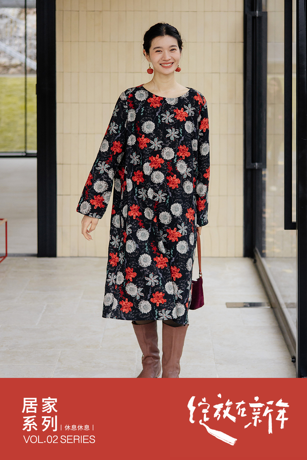 绽放旅行女装006朵/双层复合纯棉印花圆领正常肩长袖中长款连衣裙