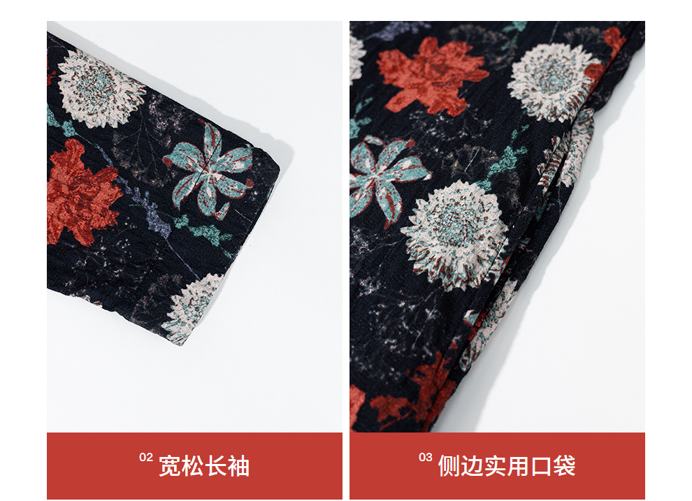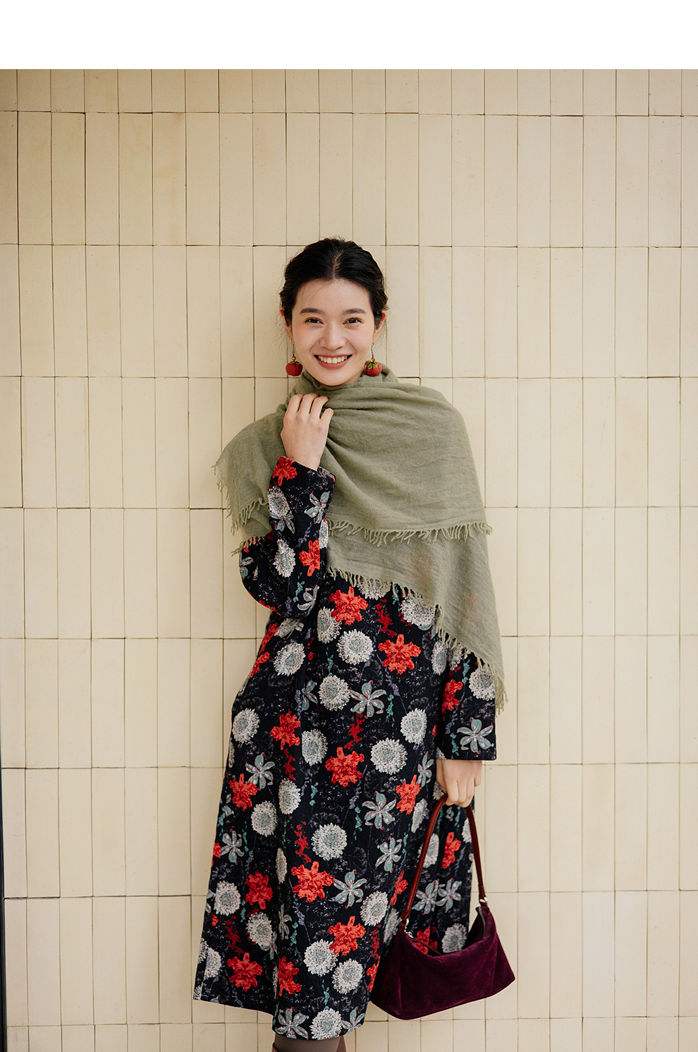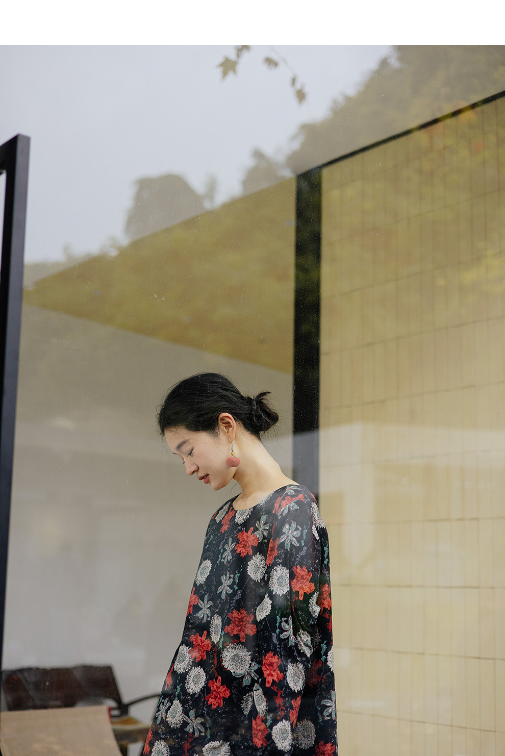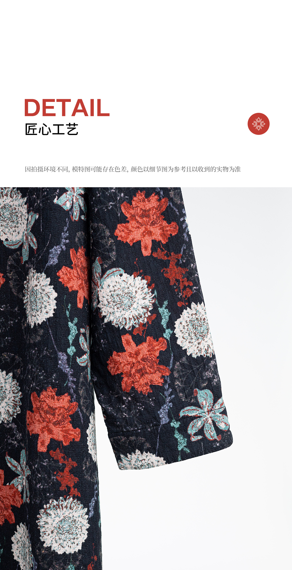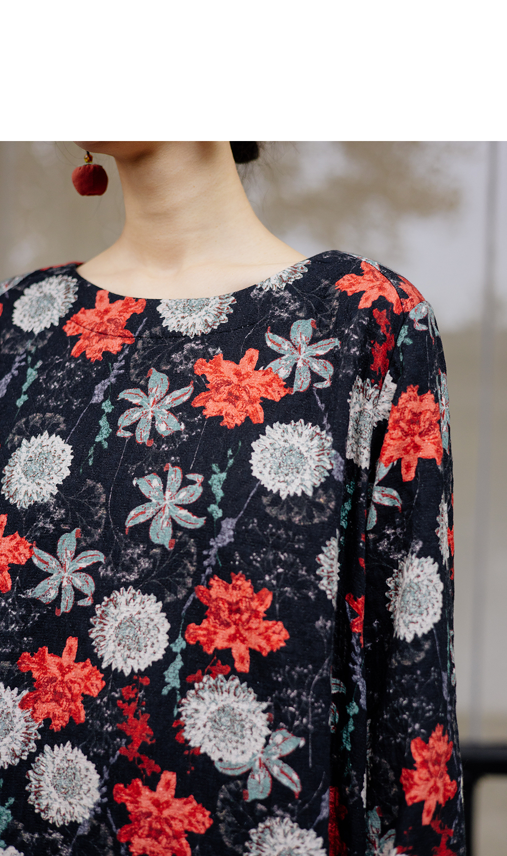 绽放旅行女装006朵/双层复合纯棉印花圆领正常肩长袖中长款连衣裙