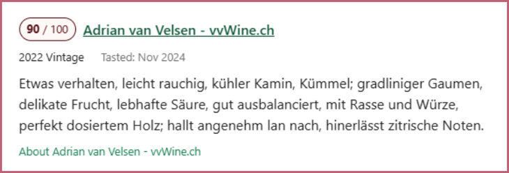 “轻微烟熏气息,凉爽的烤木材、胡椒气息,线性触感,口中活跃着细腻酸脆的果香,平衡良好,带着些许辣味,完美的木质,愉悦的回响,带有柠檬气息。”