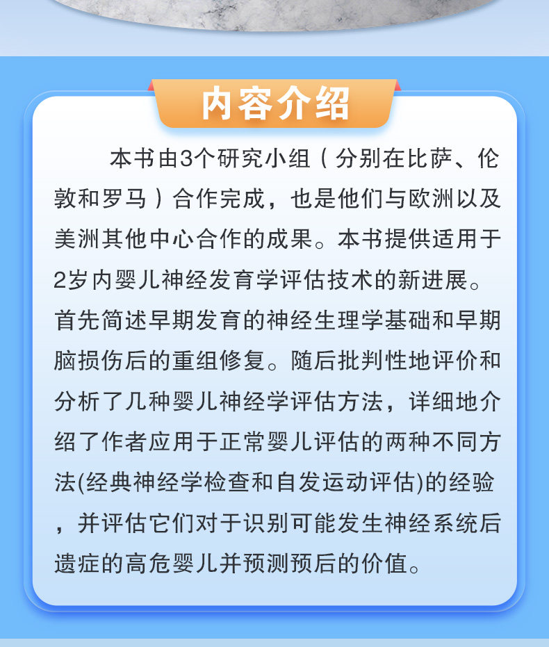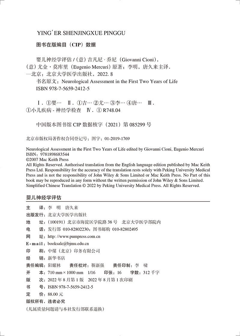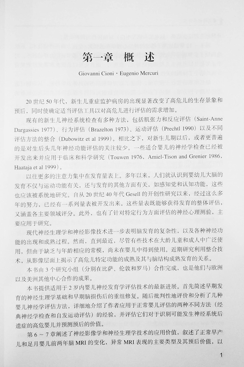 本书是对迄今为止对高危儿视听及精神运动发展障碍的早期识别的神经学检查与评估方法的系统介绍和评述。 章概要的介绍了发育的神经生理学基础。第二章详细介绍了HINE婴儿神经学检查方法,提供了完整的检查手册( 发布)。该方法在JIMA 发表的综述文章 为 为有效的早期脑瘫筛查方法。(其余两种方法,包括自发运动和头颅影像本书亦有专章介绍)。随后的章节分别介绍和评述了神经影像和神经电生理检查方法及认知、语言行为发育、视觉听觉等感知觉的检查方法,以及综合应用各种方法和技术在临床诊断中的应用。 一章介绍了早期发育障碍的识别对干预预后的重要价值。