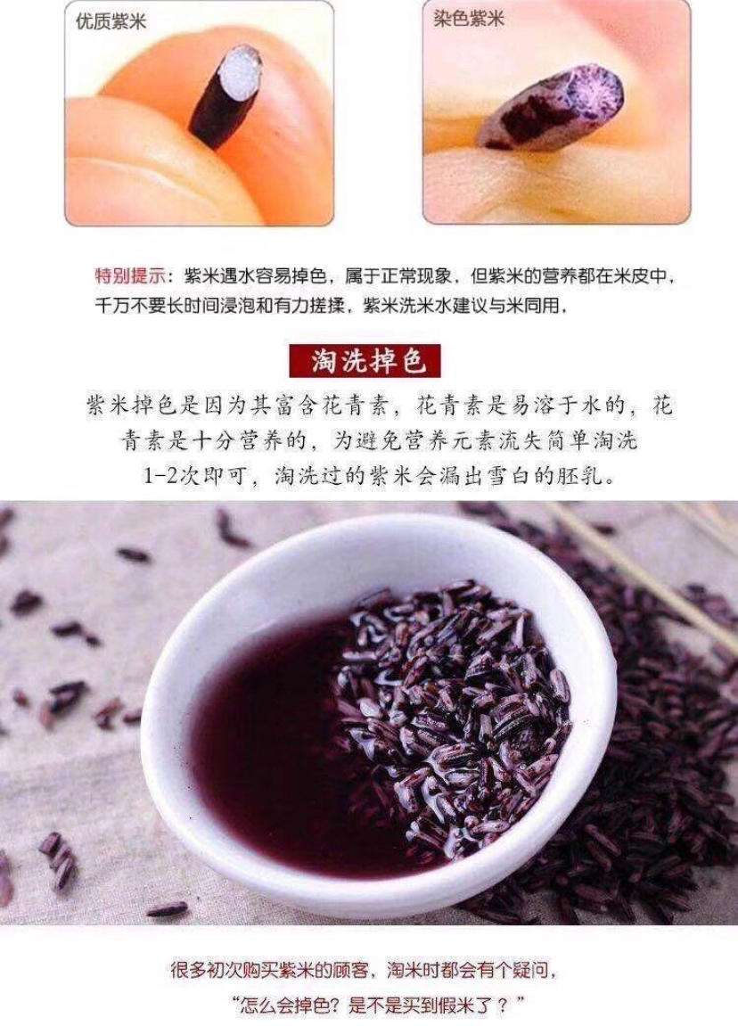 真紫米外紫里白,紫米表面附着一层胚芽,同时胚芽上面含有丰富的花青素,所以在清洗的时候会有掉色现象,而其中胚乳仍是白色的。染色米则不同,由于颜色的渗透,横断面也会附着紫色,这也是区分真假紫米的直接区分法。