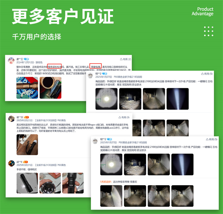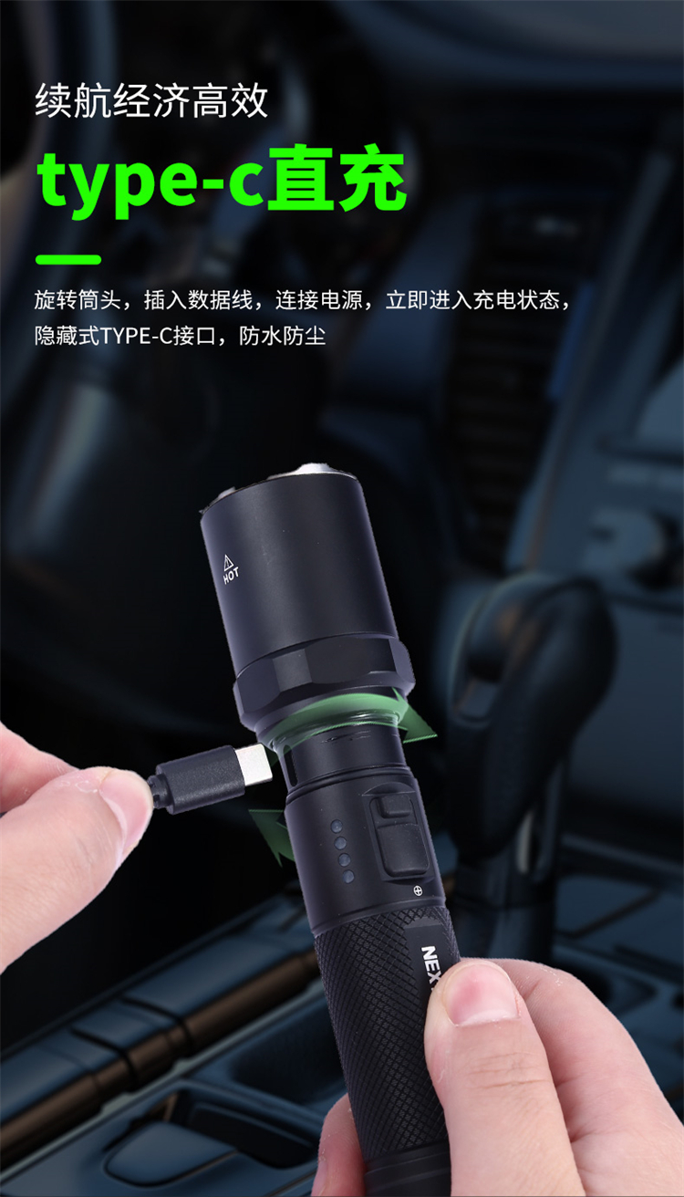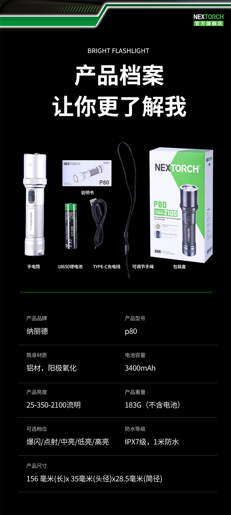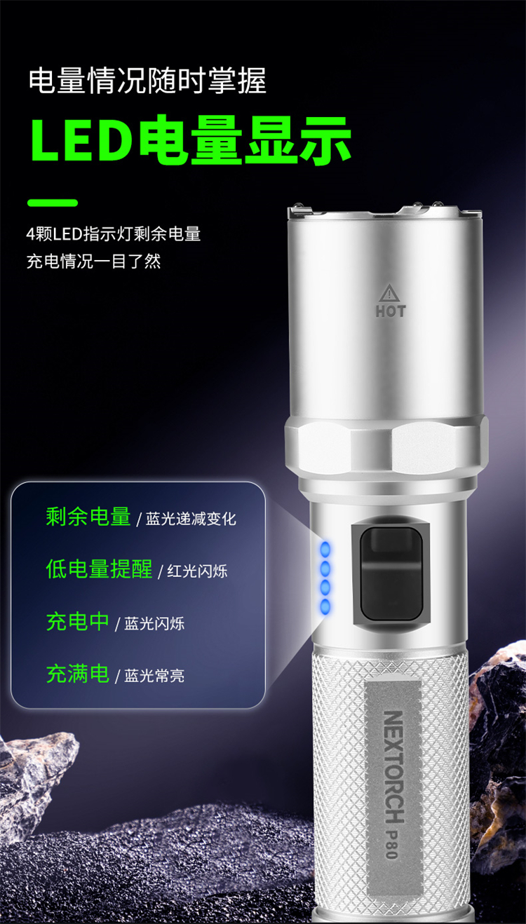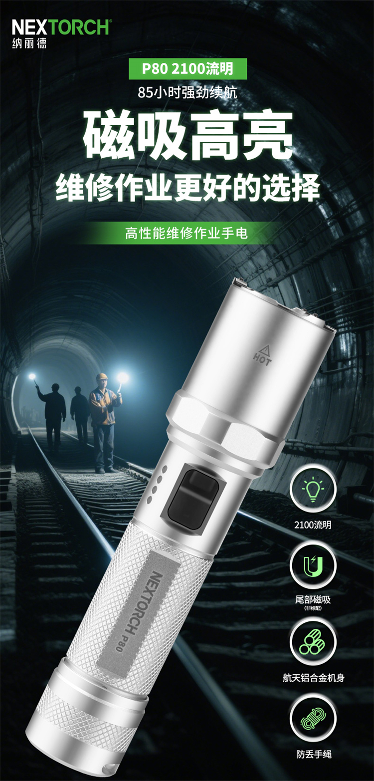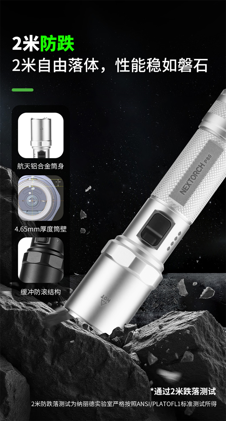 纳丽德【新品】P80银色,防身强光手电2100流明