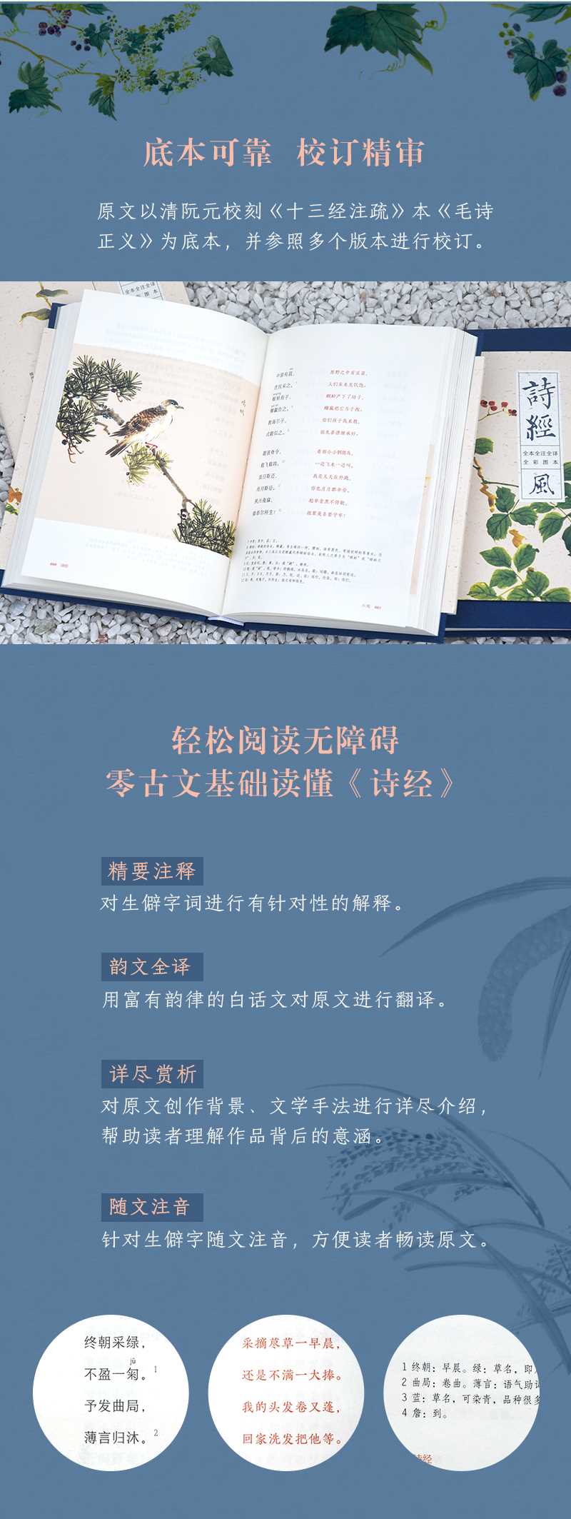 《诗经》是我国部诗歌总集,分为《风》《雅》《颂》三类。《风》是周初至春秋间各诸侯国的民间歌谣;《雅》是西周朝廷的正乐,分《小雅》和《大雅》;《颂》是周王室宗庙祭祀的乐歌,分《周颂》《鲁颂》和《商颂》三部分。该版本以阮元嘉庆刻本《毛诗正义》为底本,对每首诗进行了精要的注释、晓畅的翻译和详尽的赏析,生僻字词随文加注现代汉语拼音,全方位为读者提供阅读便利。同时配上南宋御前画师马和之《诗经图》和日本江户时期的儒学家细井徇《诗经名物图解》、橘国雄《毛诗品物图考》中的精美彩色插图,中日《诗经》绘画的经典搭配,为读者提供饶富美感的阅读体验。