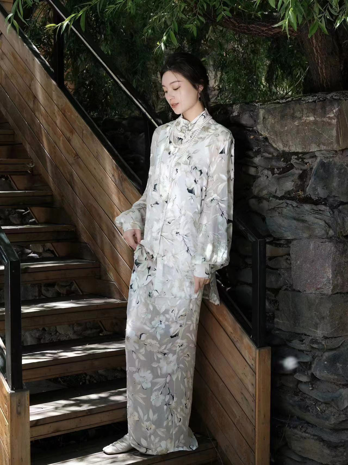 盛唐牡丹 | 粉色蝶恋花/紫色喜鹊缠枝真丝提花褶皱上衣