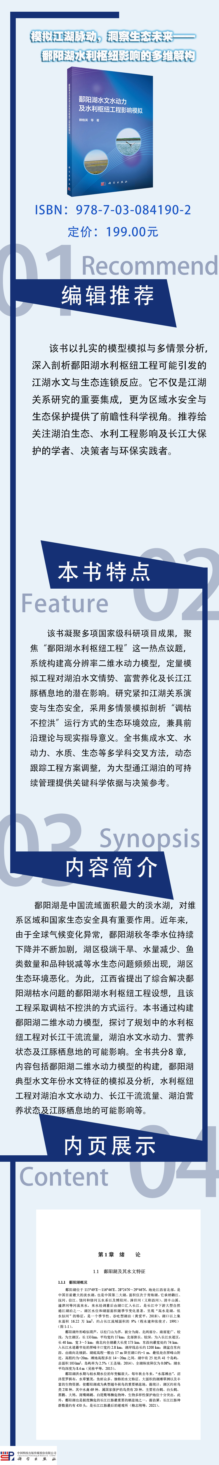 鄱阳湖是中国流域面积…的淡水湖,对维系区域和国家生态安全具有重要作用。近年来,由于全球气候变化异常,鄱阳湖秋冬季水位持续下降并不断加剧,湖区极端干旱、水量减少、鱼类数量和品种锐减等水生态问题频频出现,湖区生态环境恶化。为此,江西省提出了综合解决鄱阳湖枯水问题的鄱阳湖水利枢纽工程设想,且该工程采取调枯不控洪的方式运行。全书共分8章,通过构建鄱阳湖二维水动力模型,探讨了规划中的水利枢纽工程对湖泊水文水动力、长江干流流量、湖泊营养状态及江豚栖息地的可能影响等。