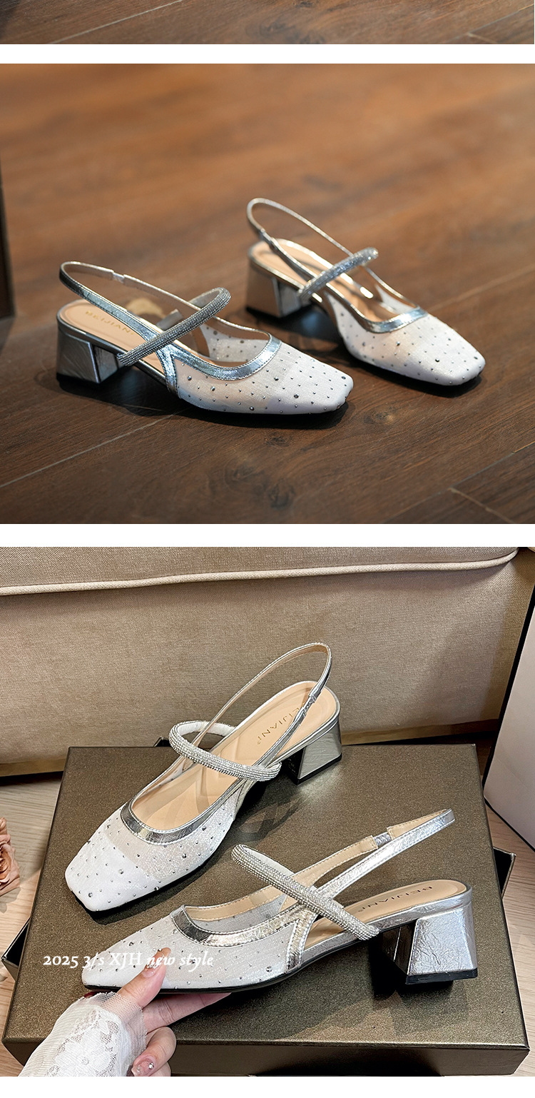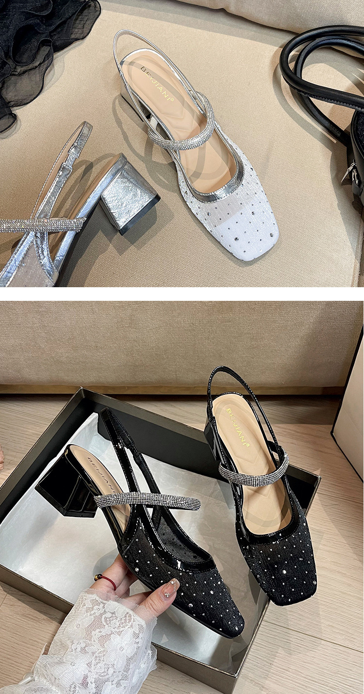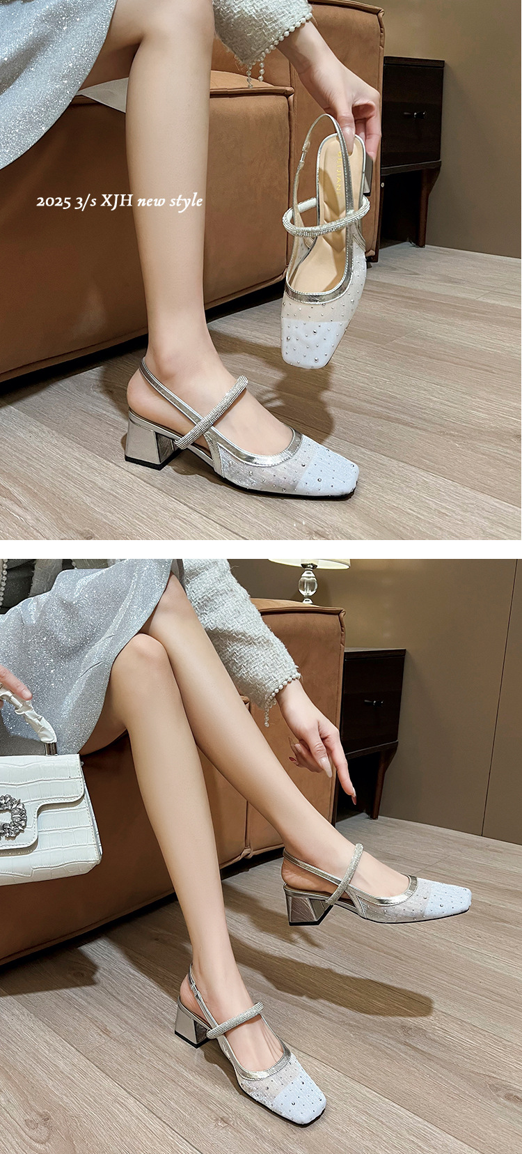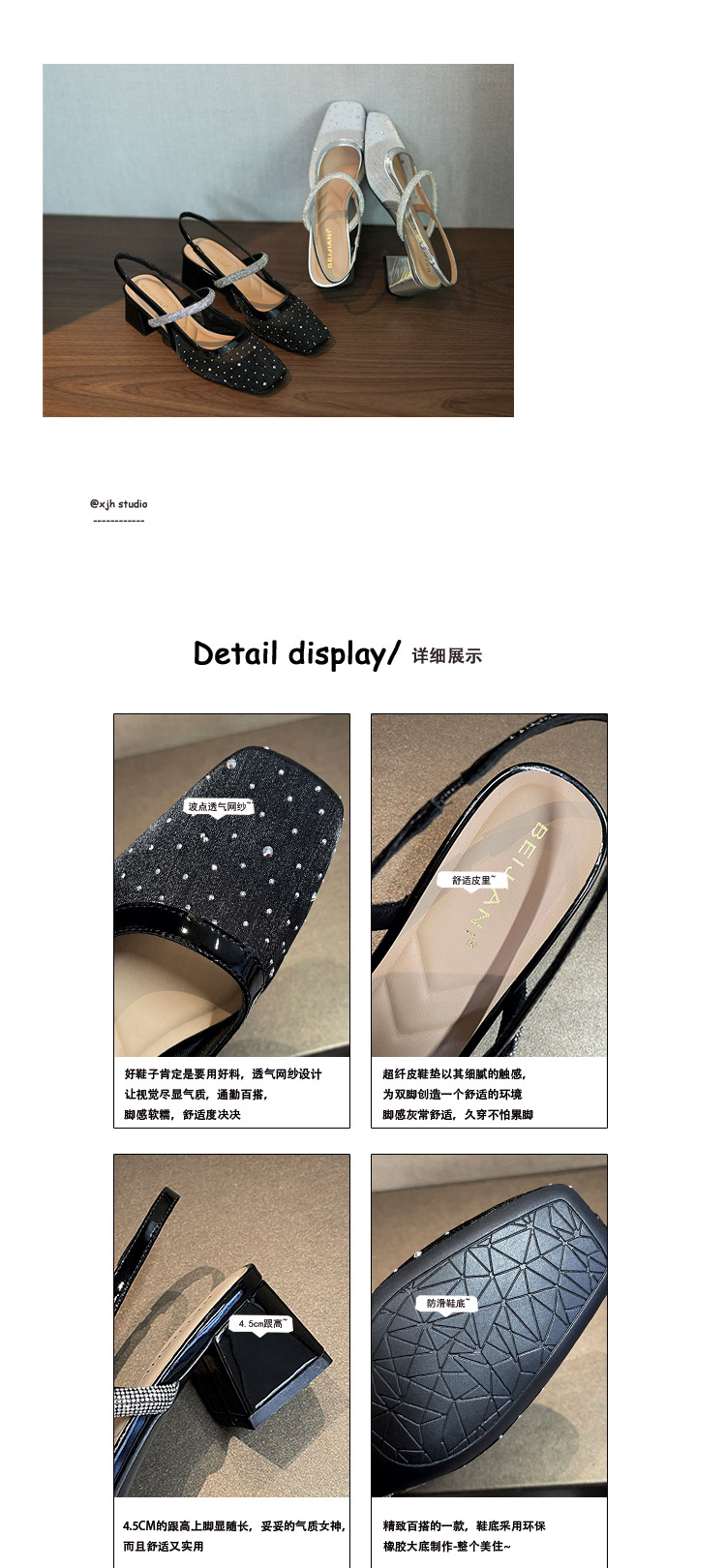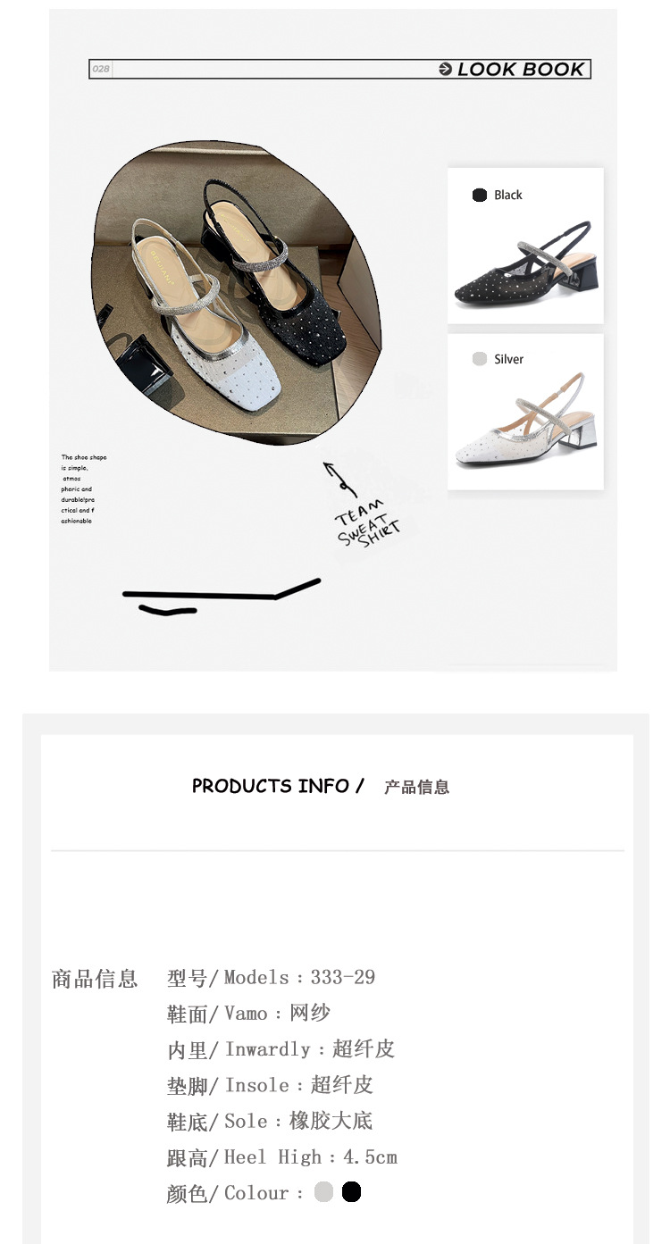 333-29 银色网纱镶钻波点包头玛丽珍鞋女外穿方头凉鞋粗跟一字带
