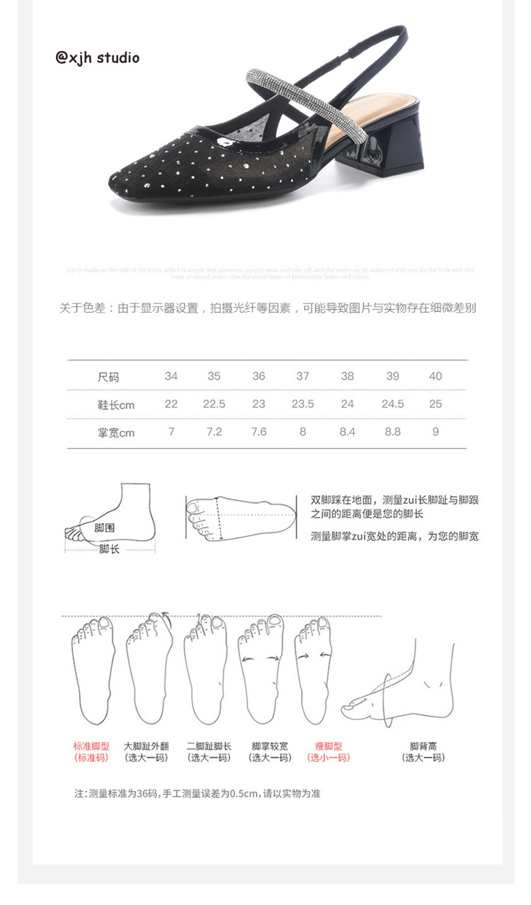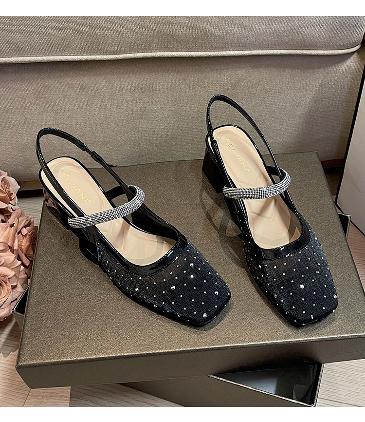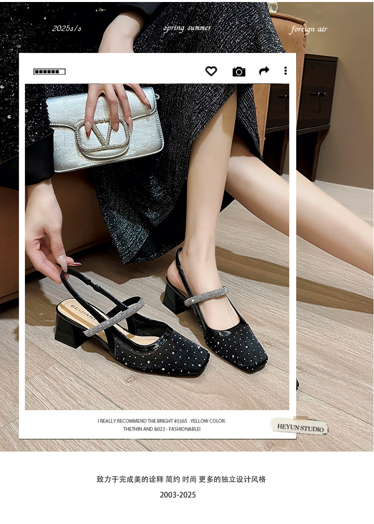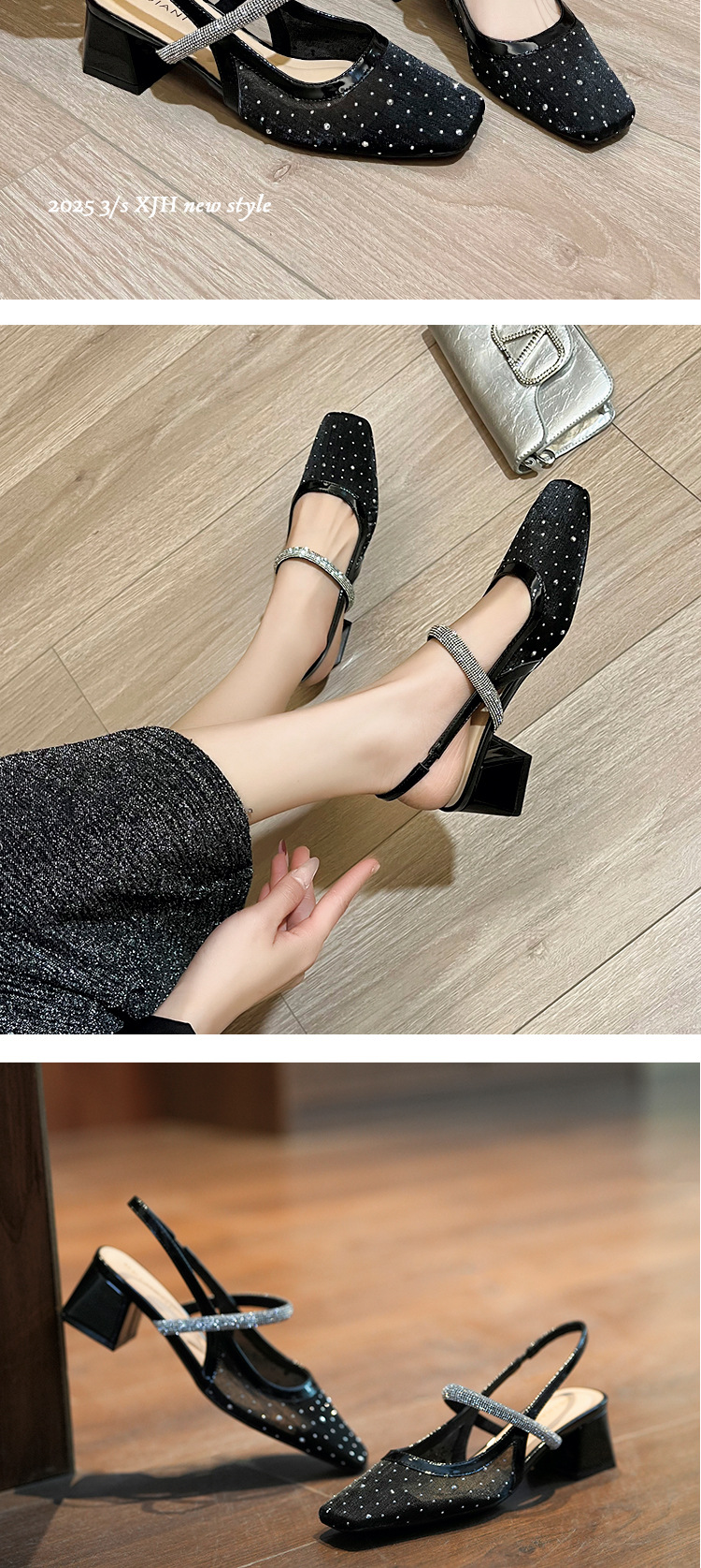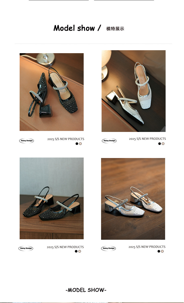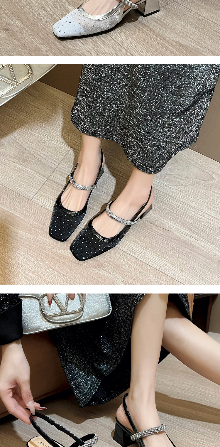 333-29 银色网纱镶钻波点包头玛丽珍鞋女外穿方头凉鞋粗跟一字带