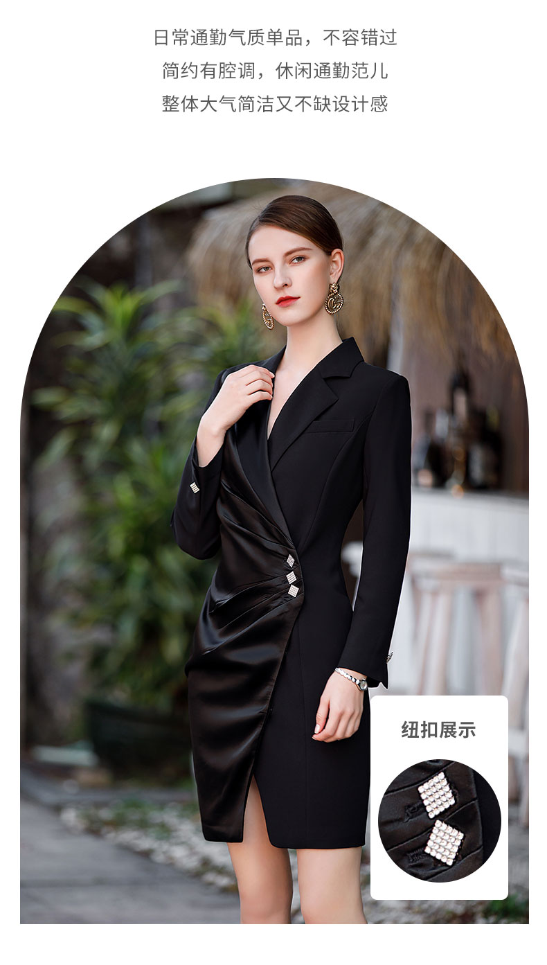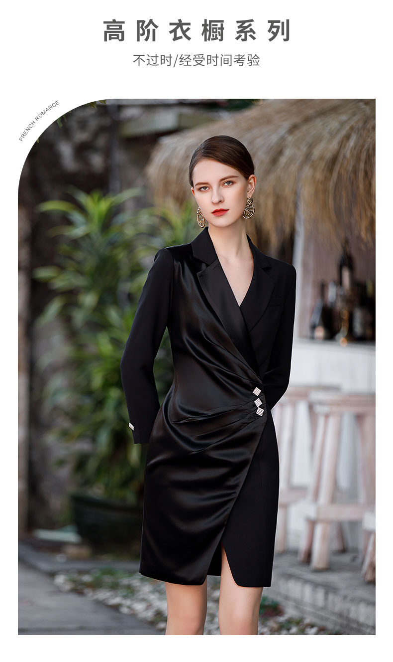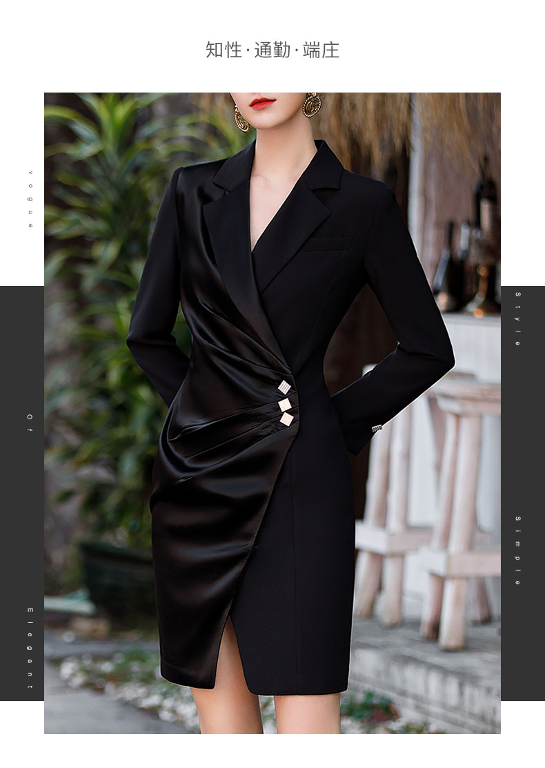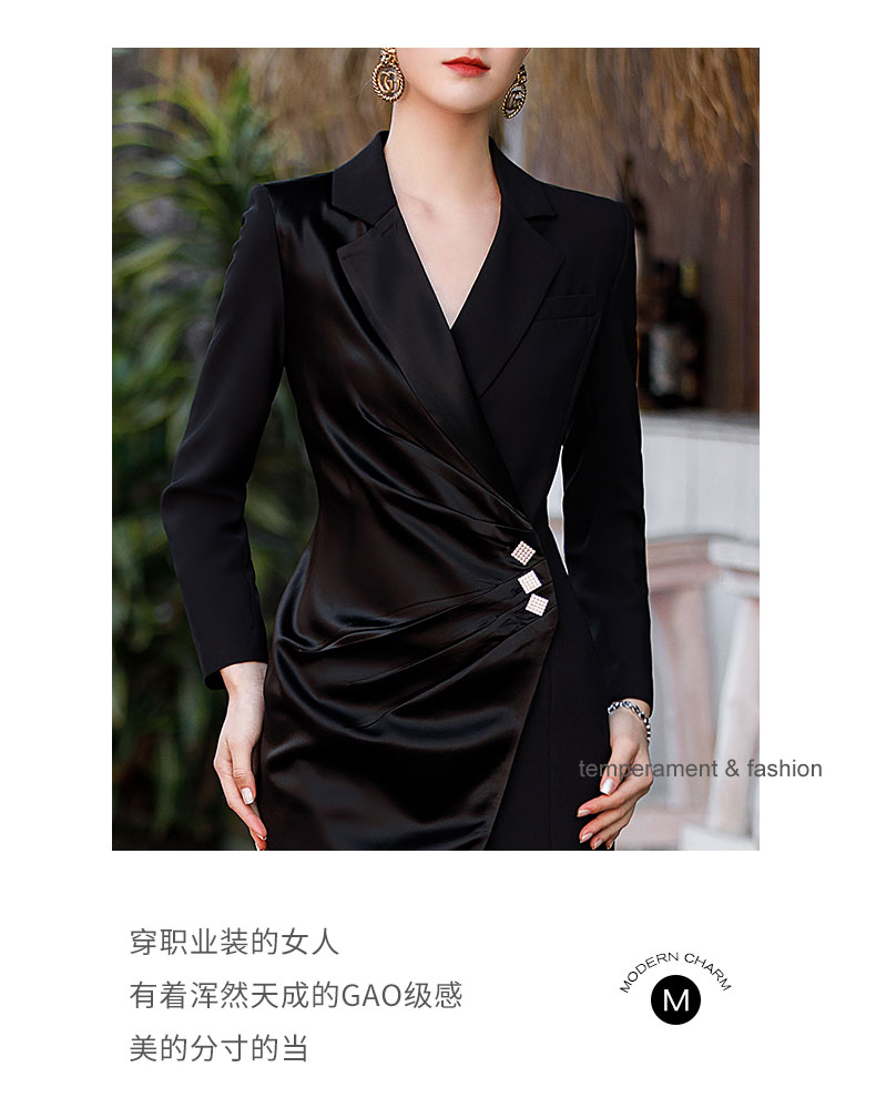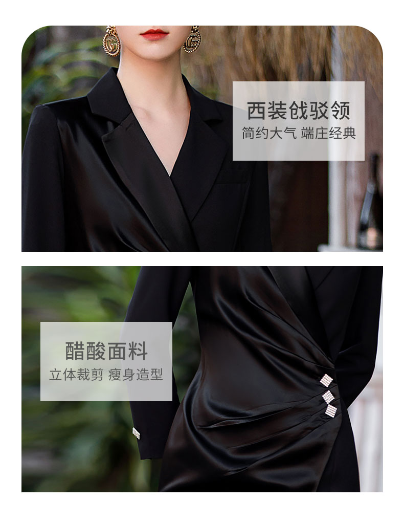 赫本风黑色连衣裙女春季长袖收腰褶皱西服裙子正式场合职业装