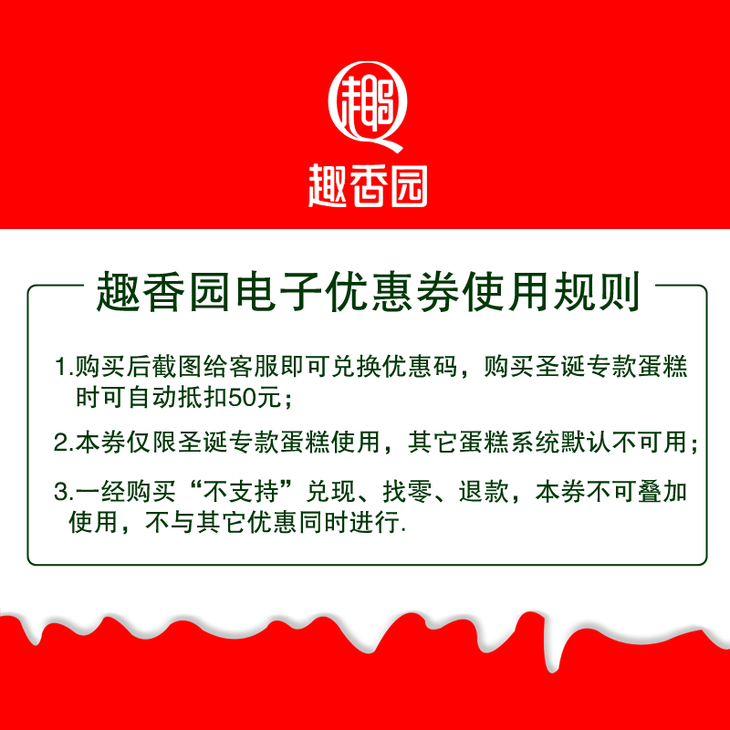 其他限制:仅限在有赞商城购买圣诞专款蛋糕时可用 不与其他优惠同时进行,不叠加使用优惠券