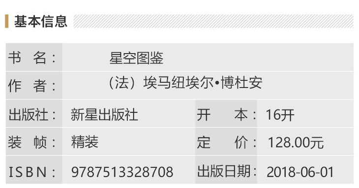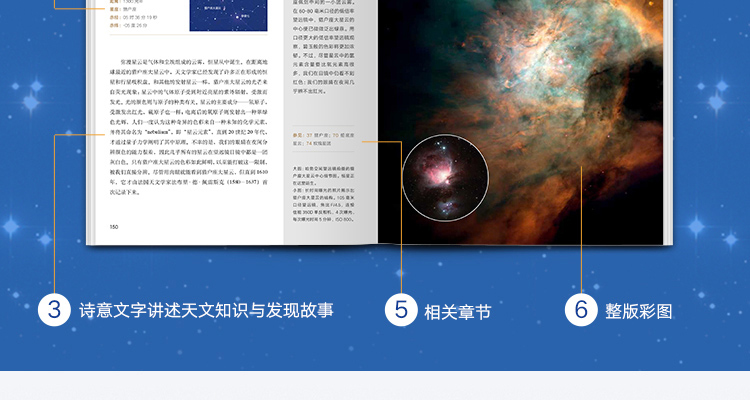 《星空图鉴》以令人沉醉的优美文字和余幅整版彩图,开启了一场从地平线到宇宙边缘的精彩旅程,从中可以尽情领略浩瀚而精致的宇宙之美。(中文版特别采用9 1印刷工艺,以质感呈现星空之美!)