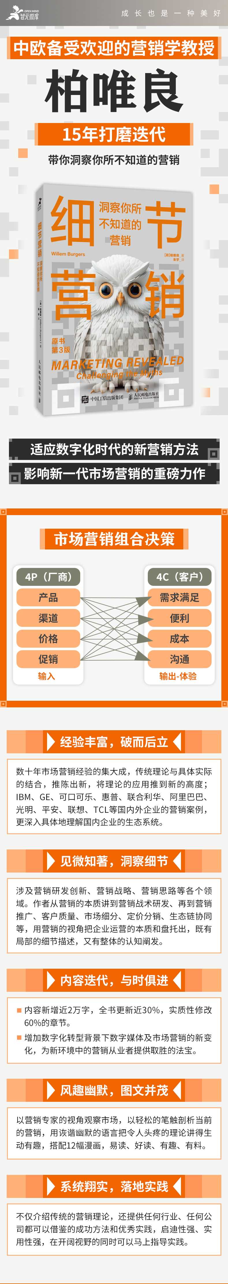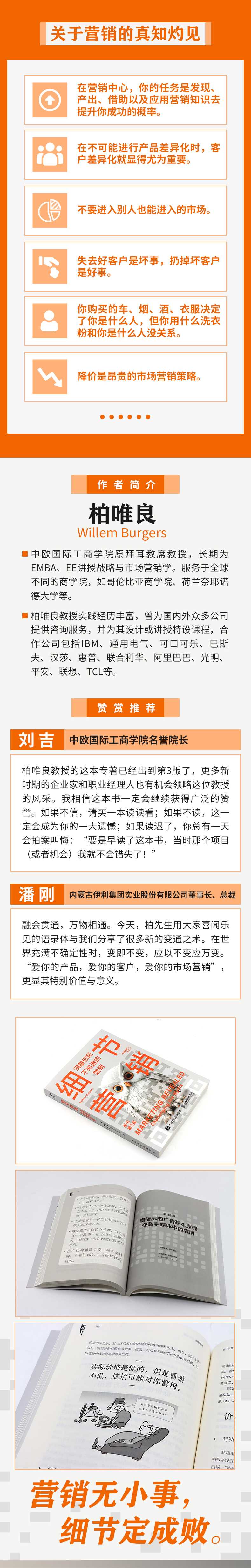 ★ 经验丰富,破而后立。柏唯良教授从事市场营销研究数十年,是中欧国际工商学院;备受欢迎的营销学教授之一,在本书中,柏教授将一些传统理论与具体实际相结合,推陈出新,将理论的应用推到新的高度;通过研习案例并实地观察企业真实经营状况,更深入具体地理解中国的企业生态系统。本书是一本营销用书,闪耀着经营的智慧。★ 见微知著,洞察细节。本书涉及营销研发创新、营销战略、营销思路等各个领域。作者从营销的本质讲到营销战术研发、再到营销推广、客户质量、市场细分、定价分销、生态链协同等,用营销的视角把企业运营的本质和盘托出,既有局部的细节描述,又有整体的认知阐发。不管是企业经营者、业务管理者,还是职场人士,都能从本书中获得不同视角的启发和心得。★ 内容迭代,与时俱进。内容新增近2万字,增加数字化转型背景下数字媒体及市场营销的新变化,为新环境中的营销从业者提供取胜的法宝。改变过去;从客户口袋里掏钱的理念,真正树立帮助客户成就自身的共赢模式。替换陈旧的案例,与时俱进分析新品牌的新方法,提供数字媒体广告的经验教训,全书内容更新近30%,实质性修改60%的章节。★ 风趣幽默,图文并茂。柏唯良教授以营销的视角带我们观察市场,以轻松的笔触剖析我们当前的营销,用诙谐幽默的语言把令人头疼的理论讲得生动有趣,用真实可感的案例切入,剖析市场营销中值得借鉴的方法和需要吸取的教训。全书搭配12幅漫画,是一本能易读、好读、有趣、有料的营销书。★ 系统翔实,落地实践。柏教授从多年的教学和实践中学习和思考,实践并迭代,本书不仅介绍传统的营销理论,还提供任何行业、任何公司都可以借鉴的成功方法和优秀实践,启迪性强、实用性强,在开阔视野的同时可以马上指导实践。
