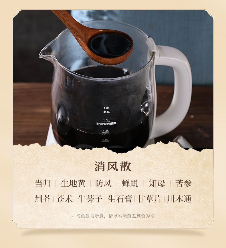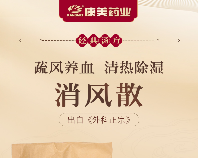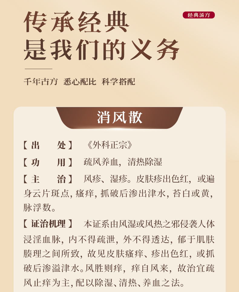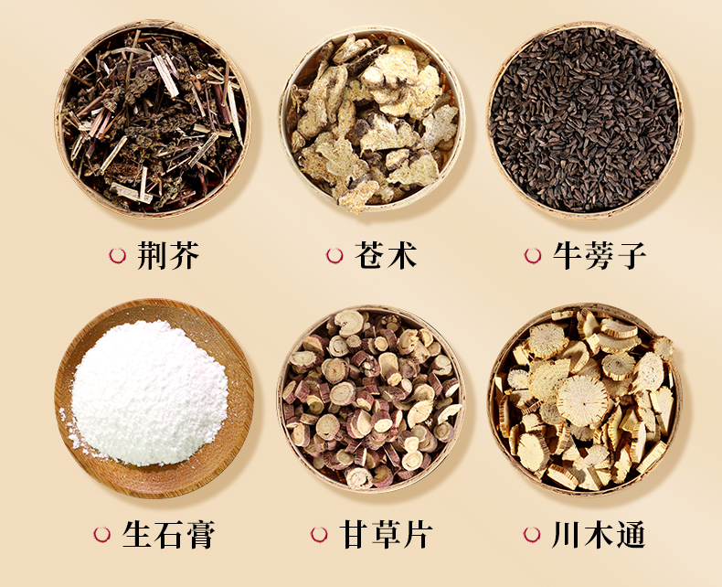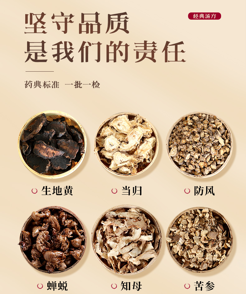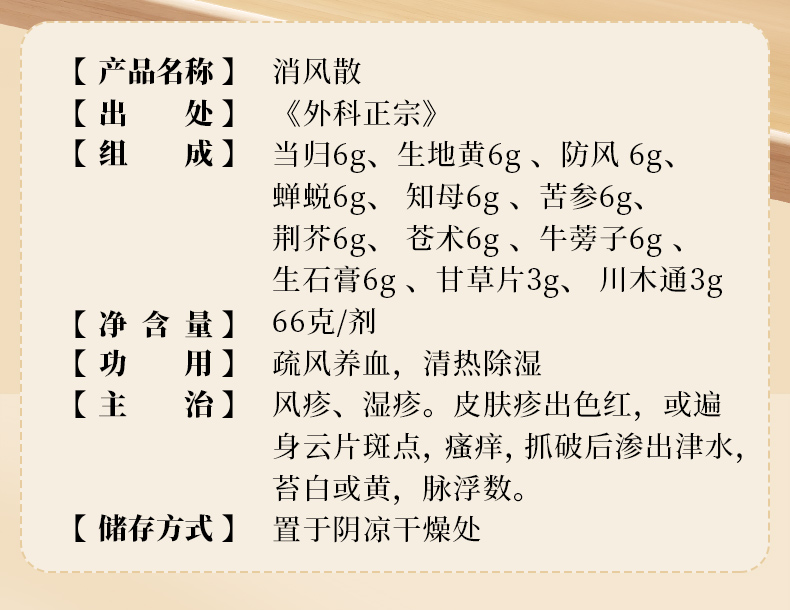消风散66g/剂(川木通/甘草片/苍术/蝉蜕/当归/防风/荆芥/苦参/牛蒡子/生地黄/生石膏/知母) 出自《外科正宗》