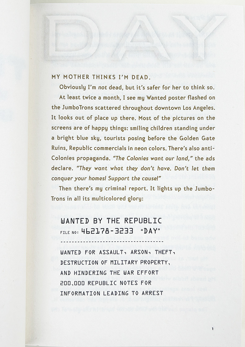 What was once the western United States is now home to the Republic, a nation perpetually at war with its neighbors. Born into an elite family in one of the Republics wealthiest districts, fifteen-year-old June is a prodigy being groomed for success in the Republics highest military circles. Born into the slums, fifteen-year-old Day is the countrys most wanted criminal. But his motives may not be as malicious as they seem.