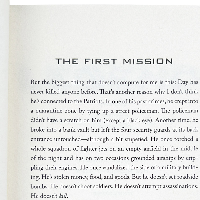 From very different worlds, June and Day have no reason to cross paths - until the day Junes brother, Metias, is murdered and Day becomes the prime suspect. Caught in the ultimate game of cat and mouse, Day is in a race for his familys survival, while June seeks to avenge Metiass death. But in a shocking turn of events, the two uncover the truth of what has really brought them together, and the sinister lengths their country will go to keep its secrets.