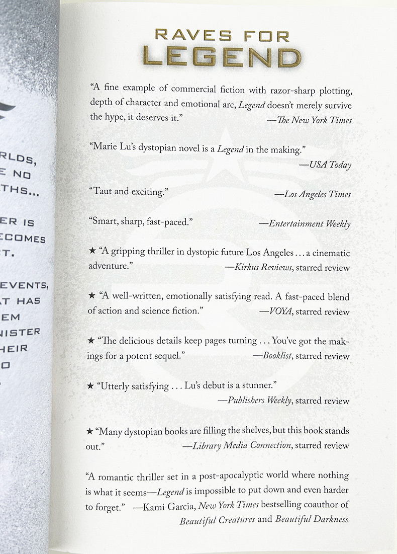 "A fast-paced blend of action and science fiction (with only a hint of potential romance) means that this one will likely appeal to male and female readers alike. Debut author Lu has managed a great feat--emulating a highly successful young adult series while staying true to her own voice. Legend will give Hunger Games fans something worthwhile to read."