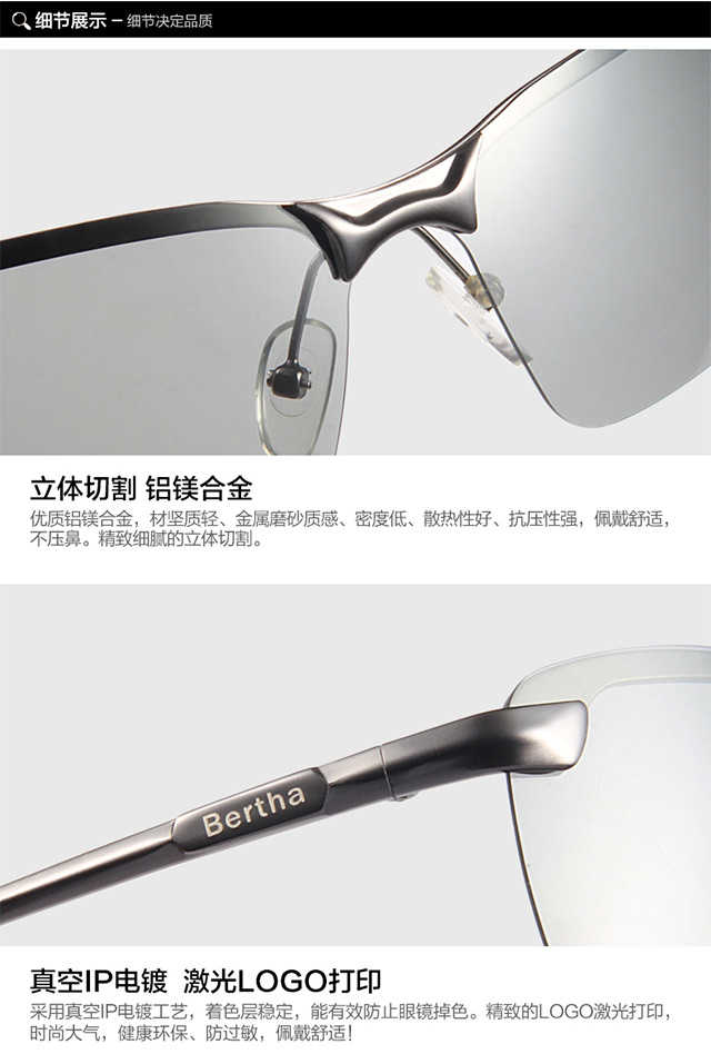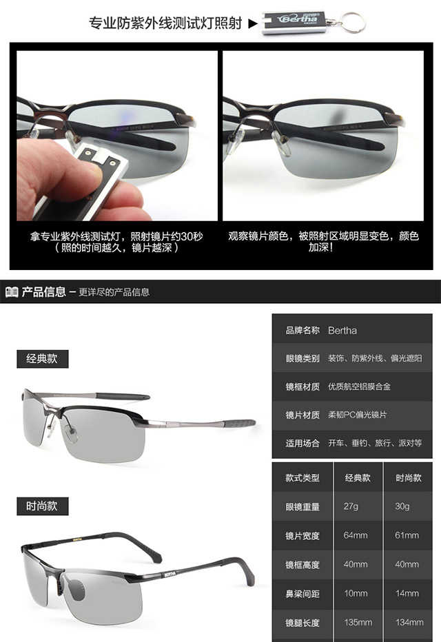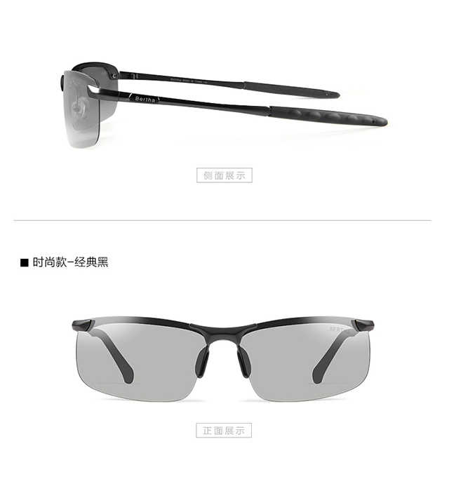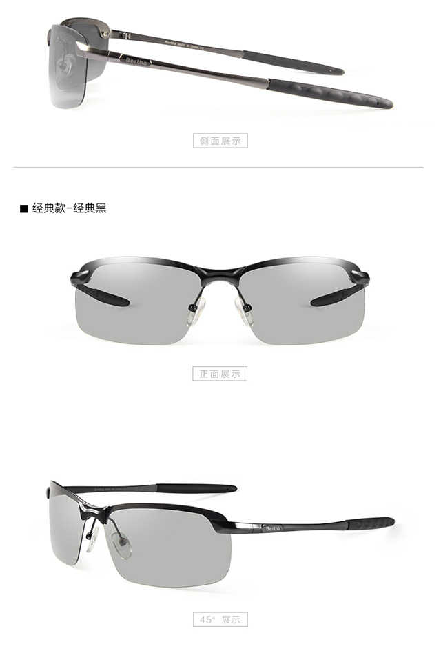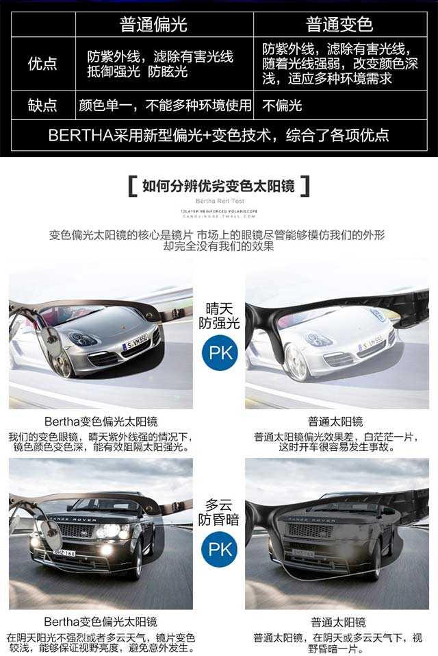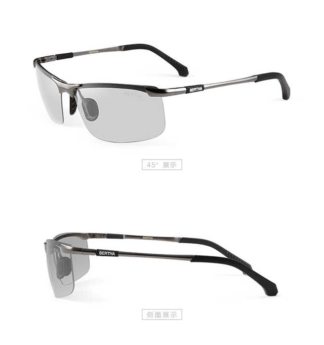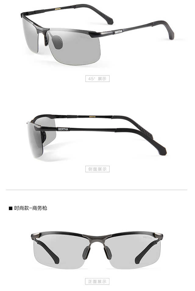 Bertha官方正品保证!适合任何脸型。智能自动变色防紫外线安全驾驶偏光防强光。个性气质,型男首选。适应多种环境使用!~~不同阳光强度下颜色深度适应变化,阳光越强颜色越深!!航空铝镁材质,优质弹簧铰链,可以达到适合任何大小脸型,不夹脸设计!!快递默认发圆通或者中通EMS。