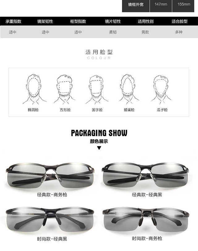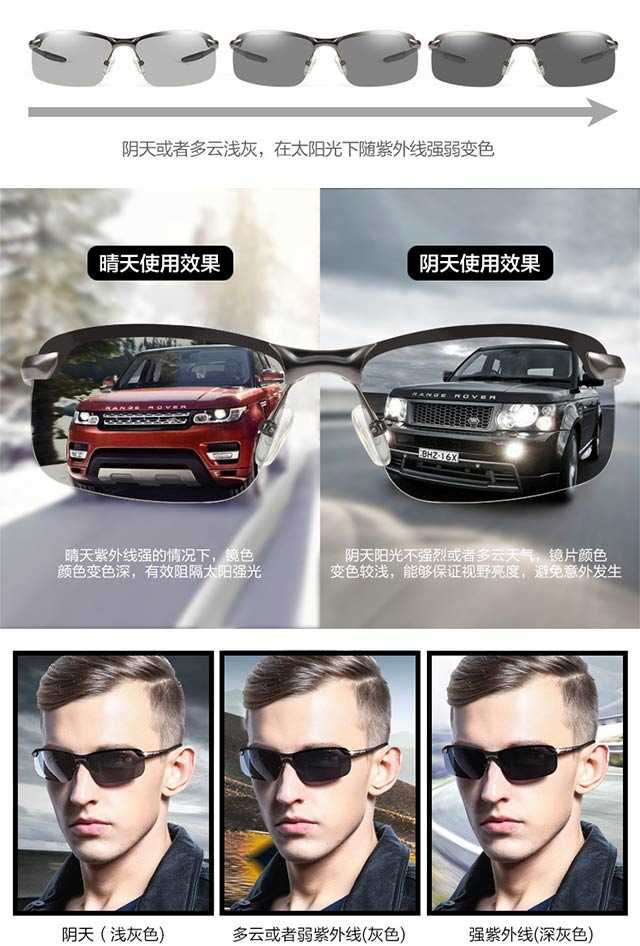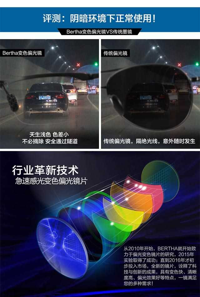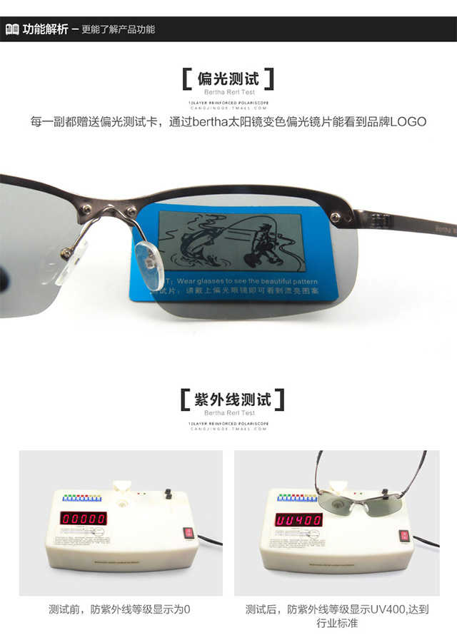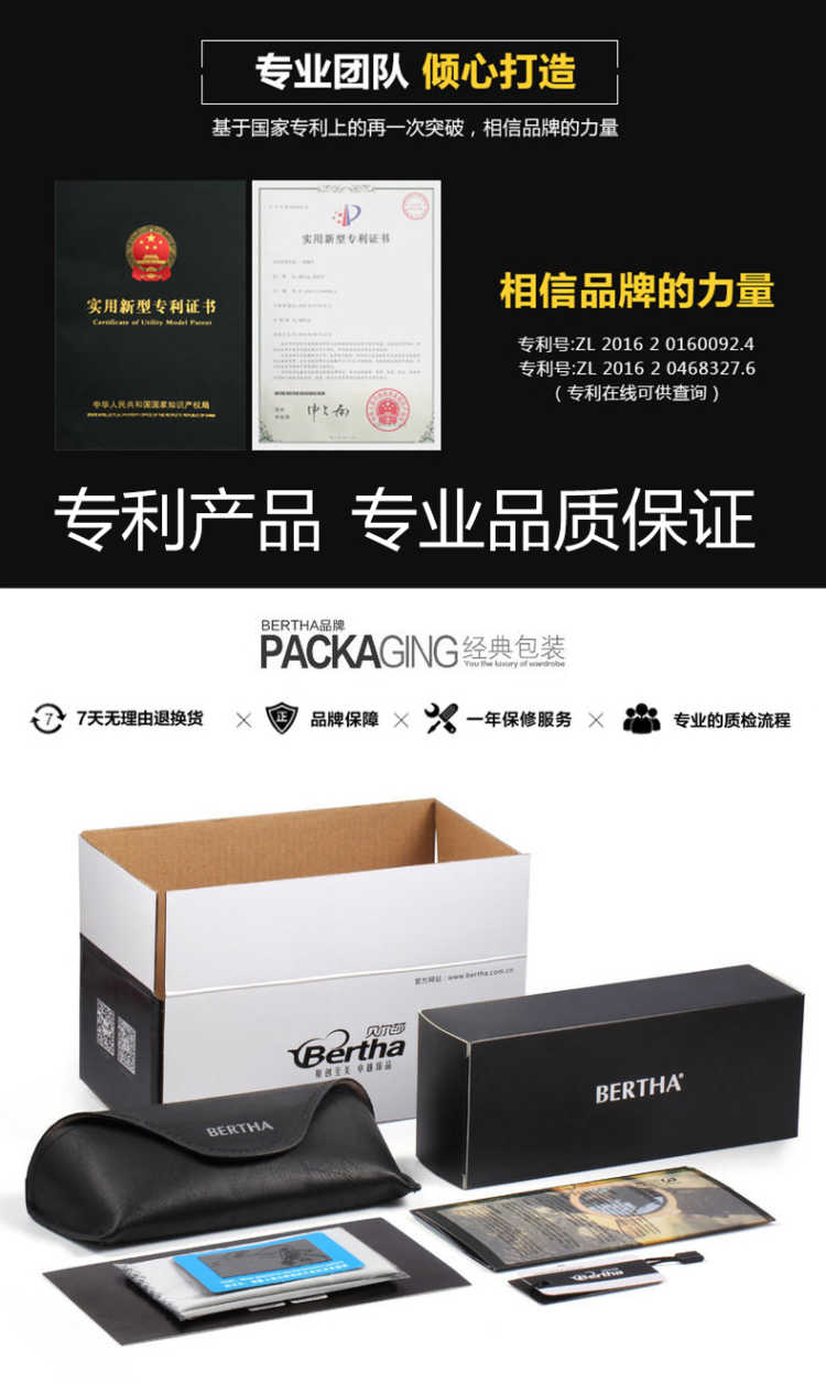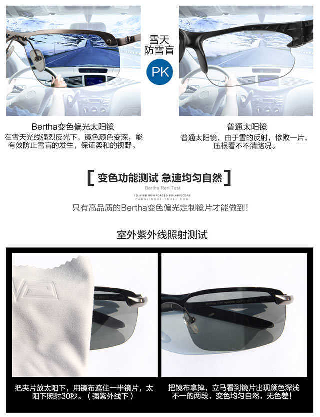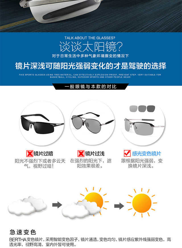 Bertha官方正品保证!适合任何脸型。智能自动变色防紫外线安全驾驶偏光防强光。个性气质,型男首选。适应多种环境使用!~~不同阳光强度下颜色深度适应变化,阳光越强颜色越深!!航空铝镁材质,优质弹簧铰链,可以达到适合任何大小脸型,不夹脸设计!!快递默认发圆通或者中通EMS。