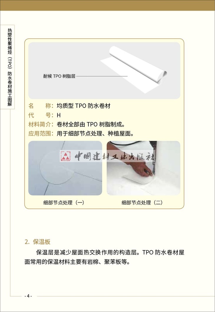 《热塑性聚烯烃(TPO)防水卷材施工图解》全书由6个部分组成,包括热塑性聚烯烃(TPO)防水卷材施工工法中的主辅材及工器具、新建项目施工工法、维修项目施工工法详解、细部节点处理详解、常见质量问题及处理方式、经典案例。本书可供防水施工技术人员及防水施工工人作为工具书使用。