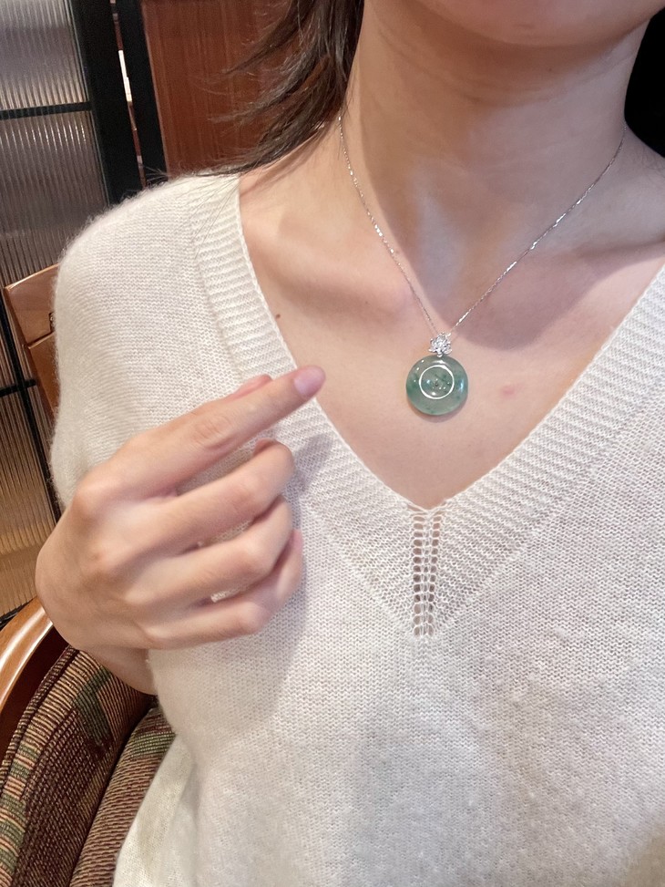 这款路路通吊坠项链,高冰种飘花阳绿或满绿,每一颗珠子都独一无二,色泽鲜艳。