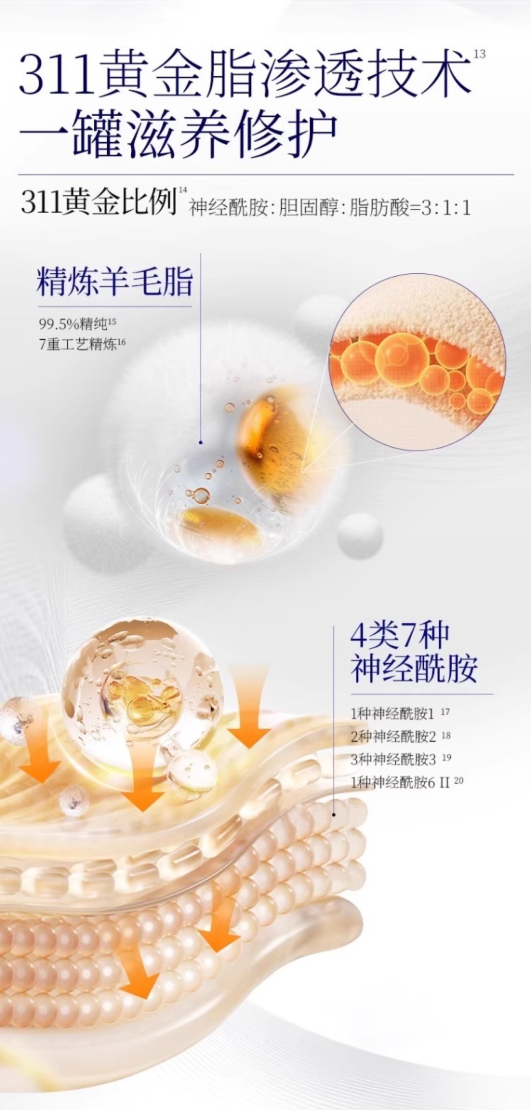 它能媲美千元护肤品的底气,源于实打实的硬核黑科技。升级后的311黄金脂渗透技术精准复刻皮肤屏障天然结构,以神经酰胺、胆固醇、脂肪酸3:1:1的黄金比例,打通养分渗透通道,让滋润成分直达肌底,而非仅停留在表面。搭配99.5%精纯羊毛脂形成锁水保护膜,再加上4类7种神经酰胺协同修护受损屏障,补水与锁水一步到位;更难得的是,它还添加了高端面霜才有的三重重组胶原蛋白——Ⅰ型让皮肤细腻有光泽,Ⅲ型赋予肌肤弹嫩质感,ⅩⅦ型强化紧致度。
