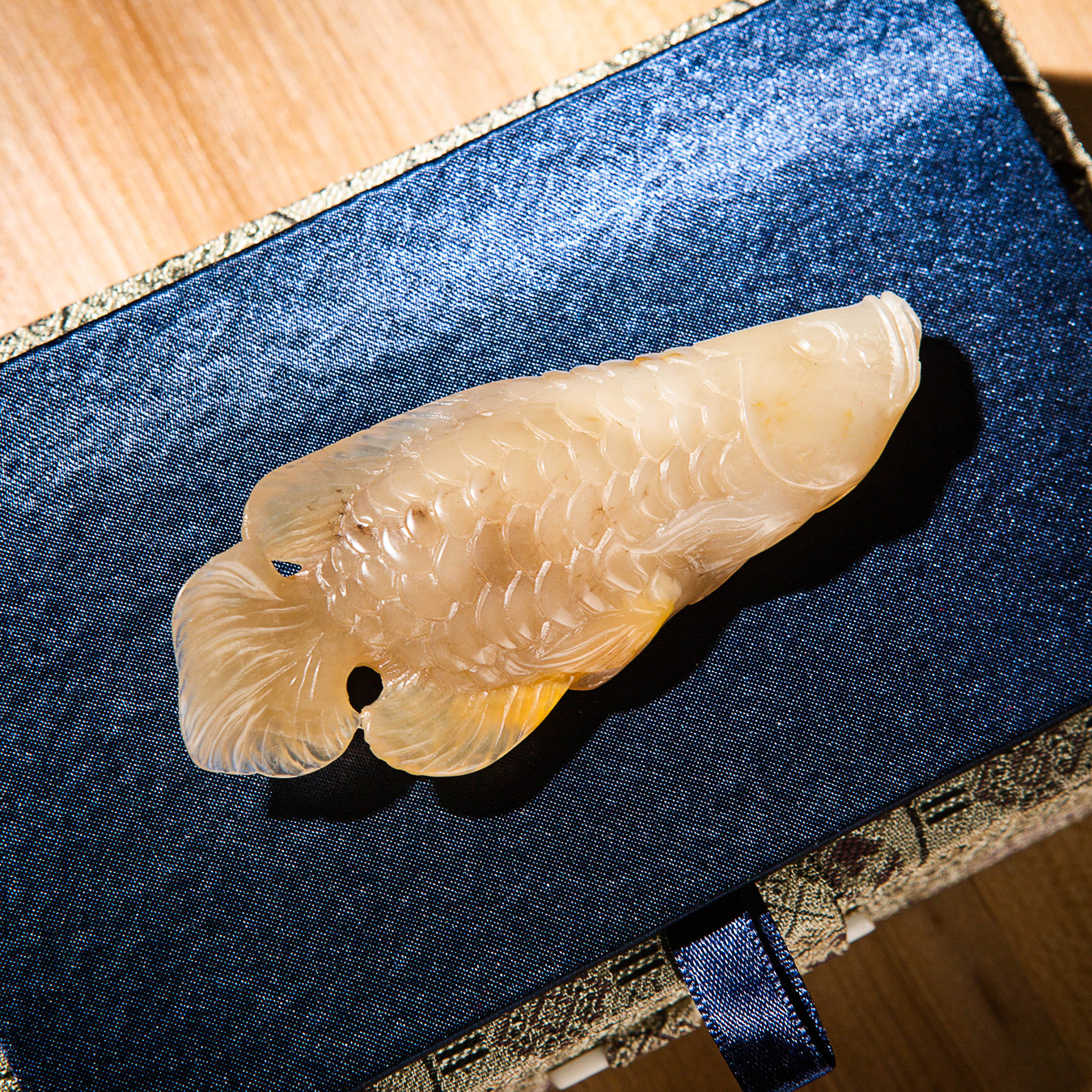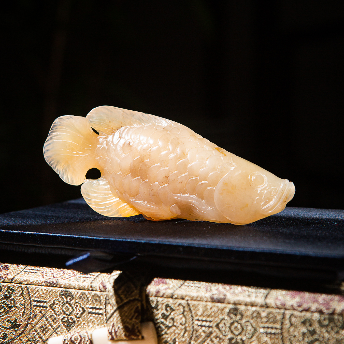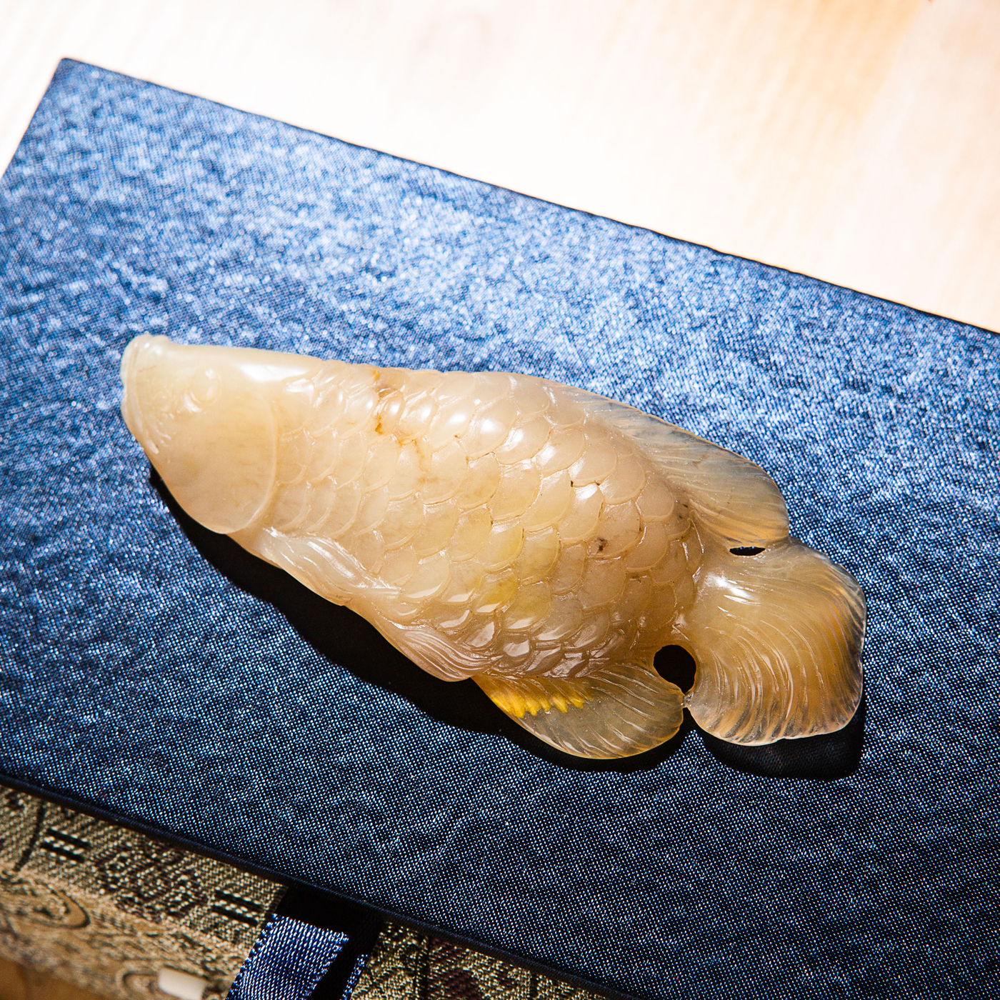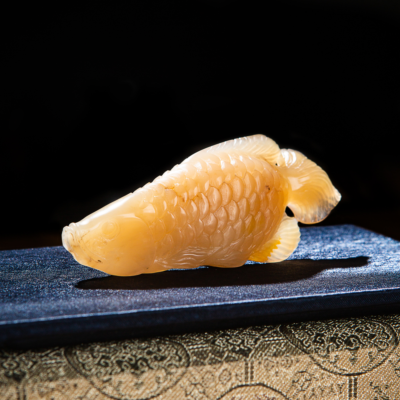 寿山石老料雕“鱼”手把件,选料为存放几十年之老料,料质极佳。其雕工精细,题材刻画生动,极具艺术效果和实用性。