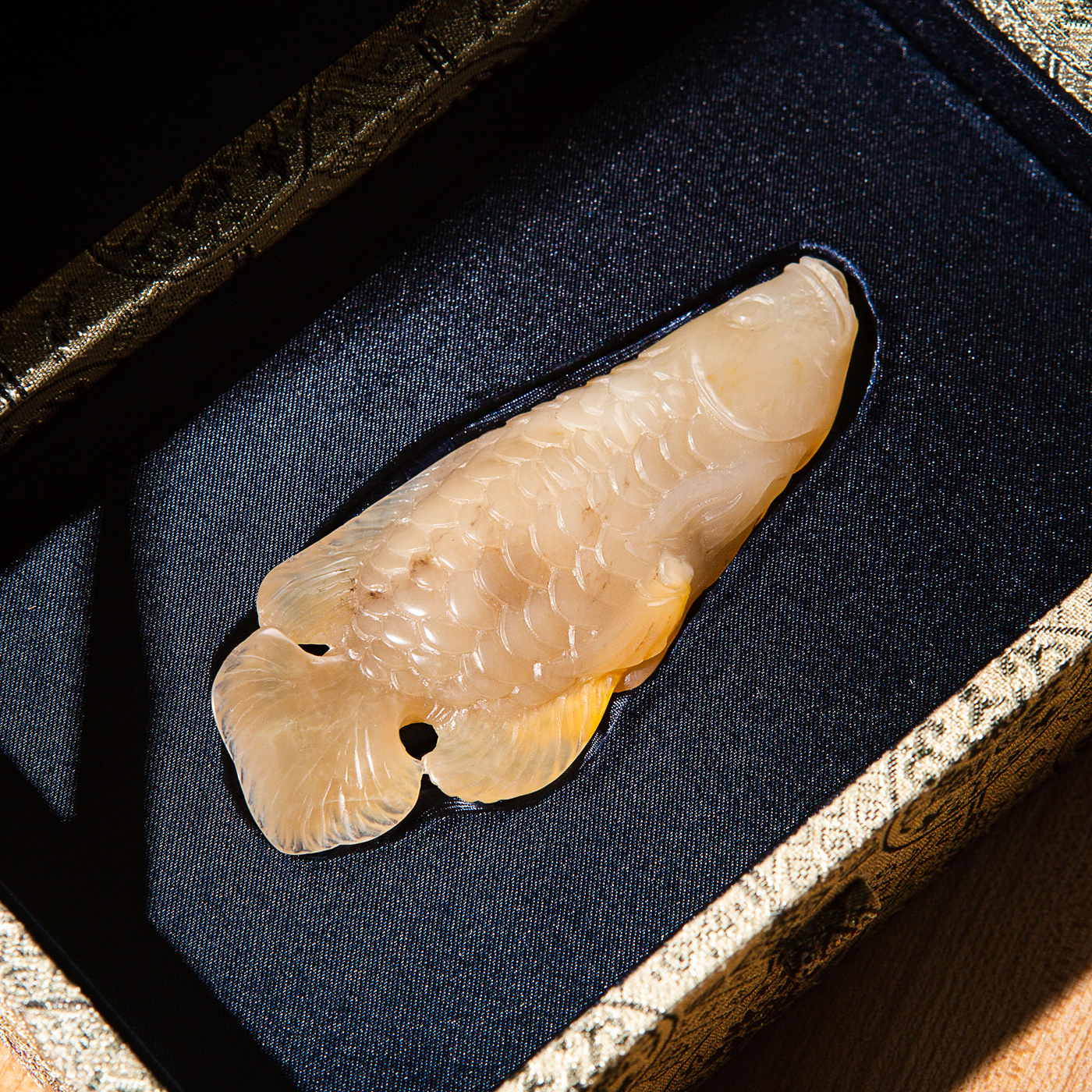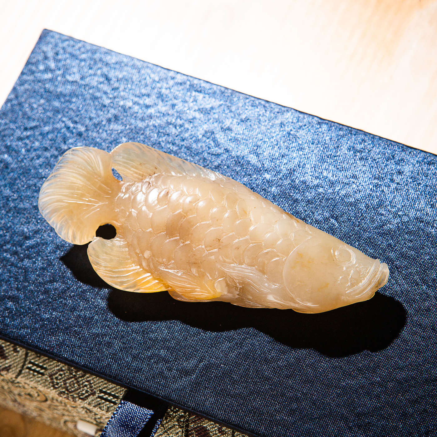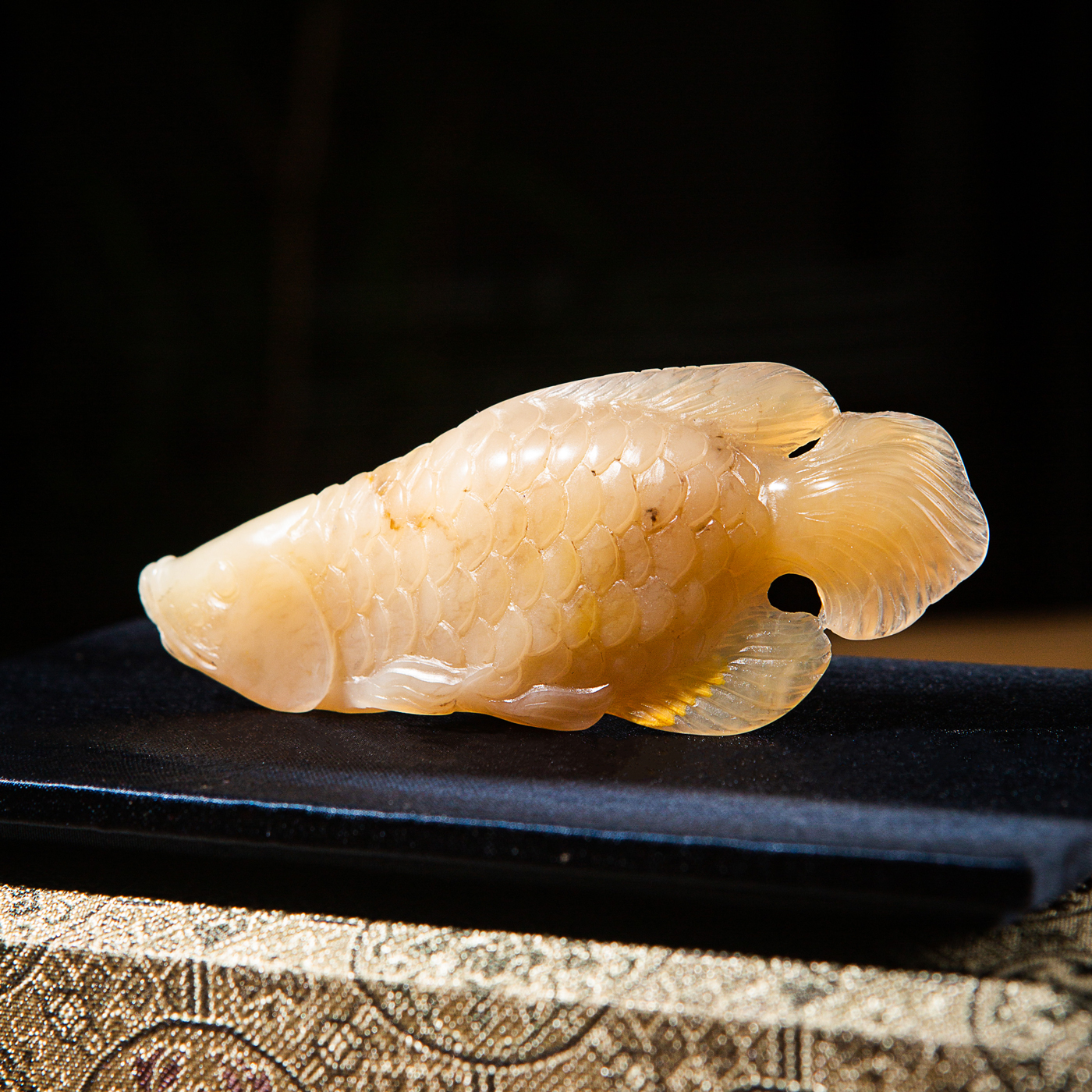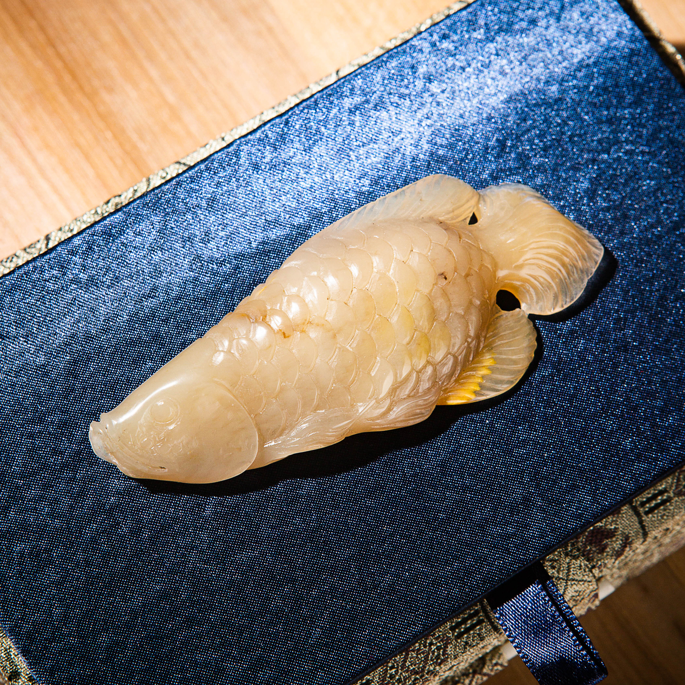 寿山石老料雕“鱼”手把件,选料为存放几十年之老料,料质极佳。其雕工精细,题材刻画生动,极具艺术效果和实用性。