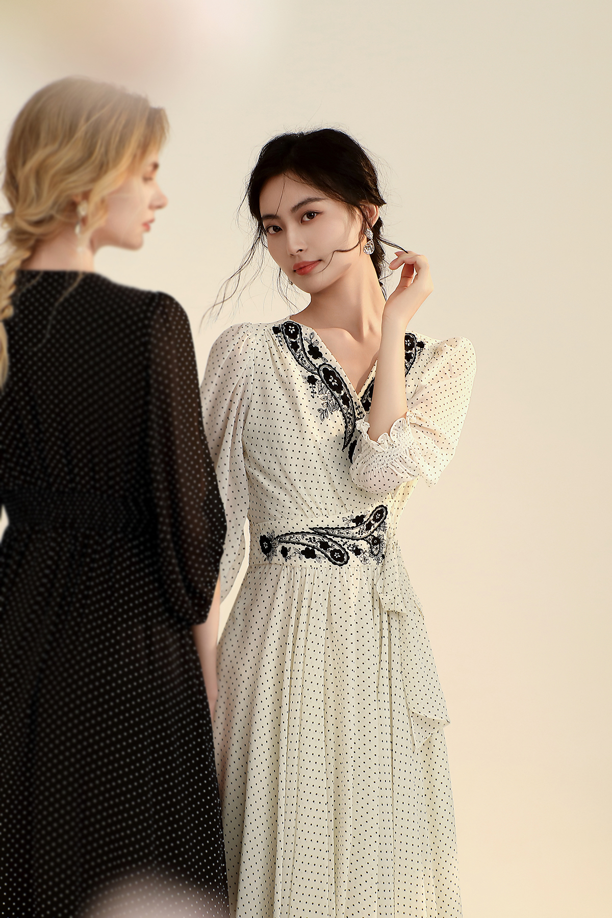 HJ2S78_皓色/漆黑色_连衣裙_夏季_显高百搭波点刺绣 V 领收腰系带 A 字中长裙_高级女装_BERNIEELEN 伯妮斯茵