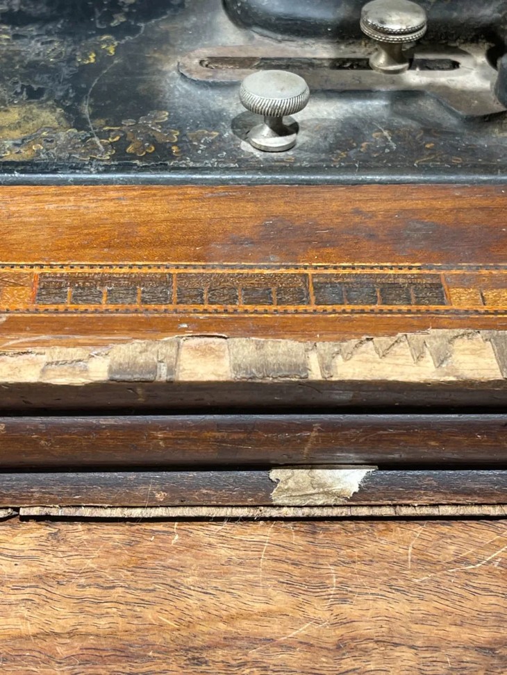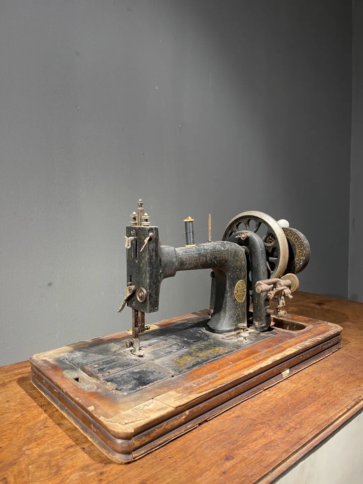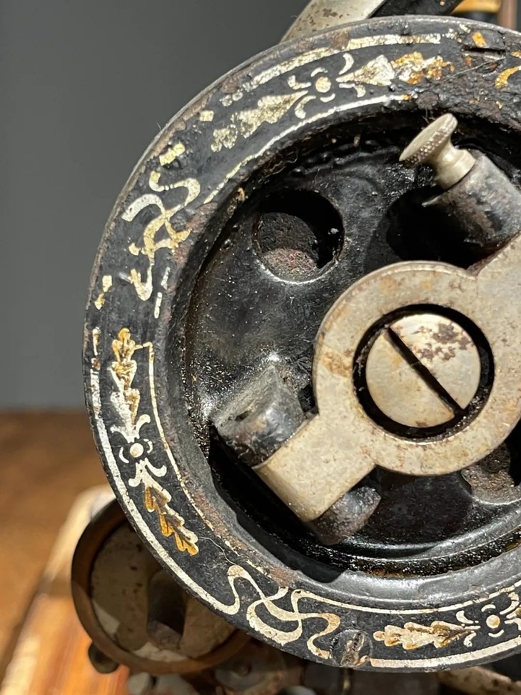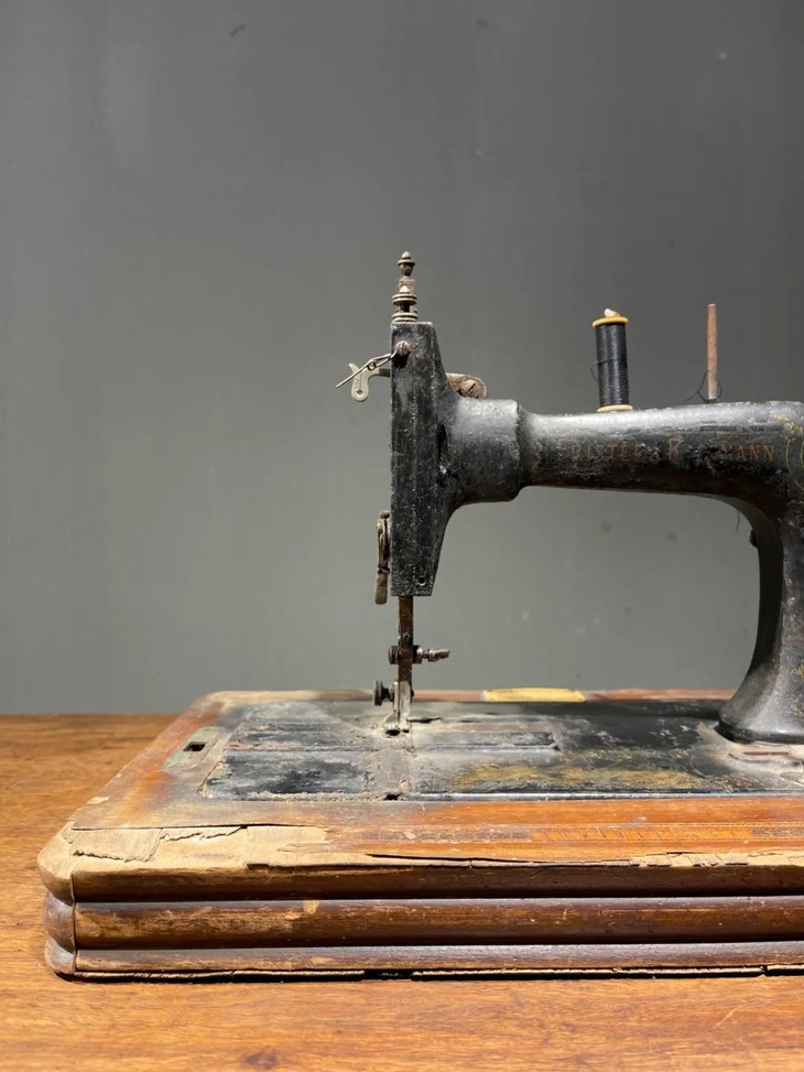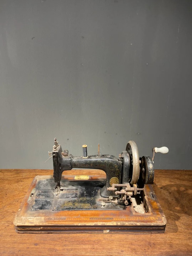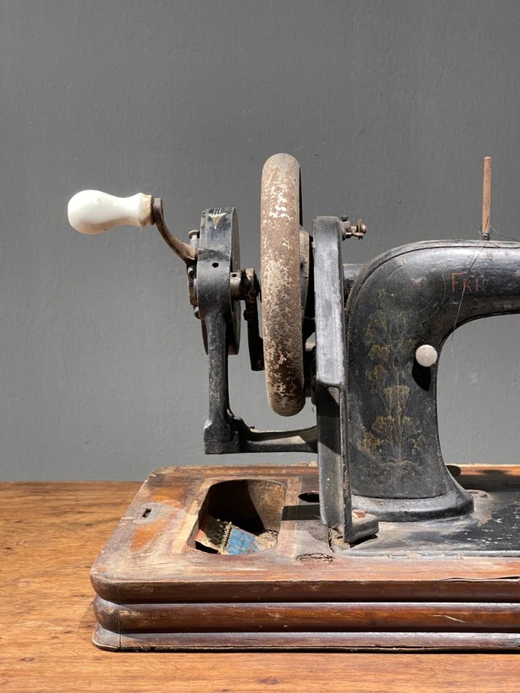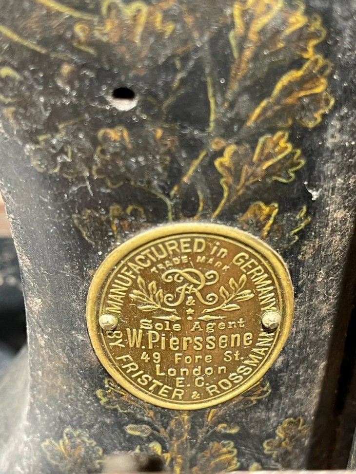 这是一件制作严谨的德国知名品牌 Frister & Rossmann精密专业老缝纫机,是1900年前后制作于德国的老手动缝纫机,此德国精密机械设计精巧,造型美观,绘画、书法与金属錾工裝饰华丽典雅,是一件非常难得的德国二十世纪初期精密机械,也是经典的收藏级佳作。此手动式德国知名品牌老缝纫机整体设计精巧,造型工业风格简约大气,手工绘商标纹饰与金属錾工裝饰图案,整体贵气华丽,历经逾百年仍然保存完整,非常难得。此手动式1900年左右制造的德国知名品牌老缝纫机,制作严谨,具备德国工业产品之精良与优雅高贵气质,逾百年历史有如一件艺术品般的完美动人,尽显德国机械制造科技的经典之作,如图所示,除正常使用痕迹与局部大漆剥落与木板损伤外,基本保持完整。是一件的收藏级老德国缝纫机。未经测试是否仍然可以正常使用。尺寸:长:48.8厘米,宽:26.2厘米,高:27.7厘米,重量:11.2千克。