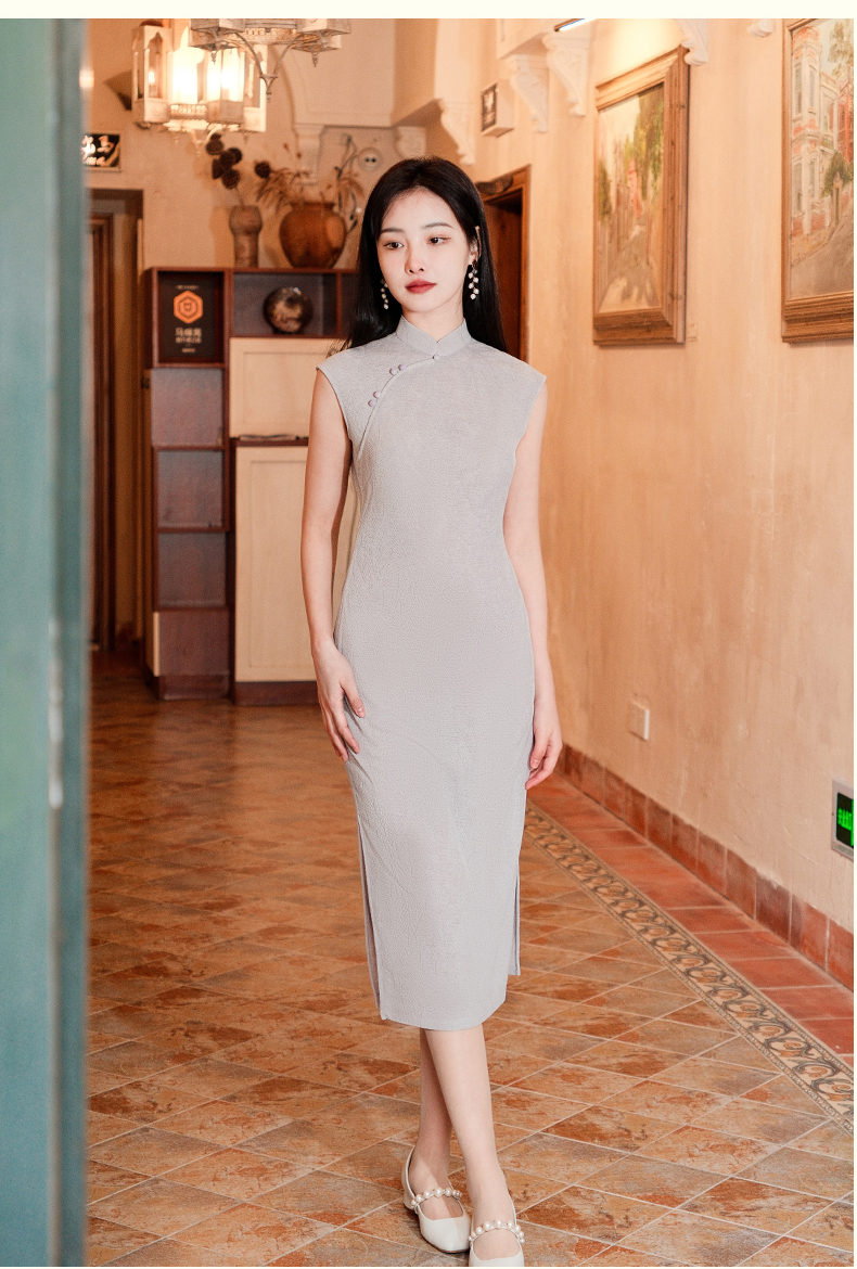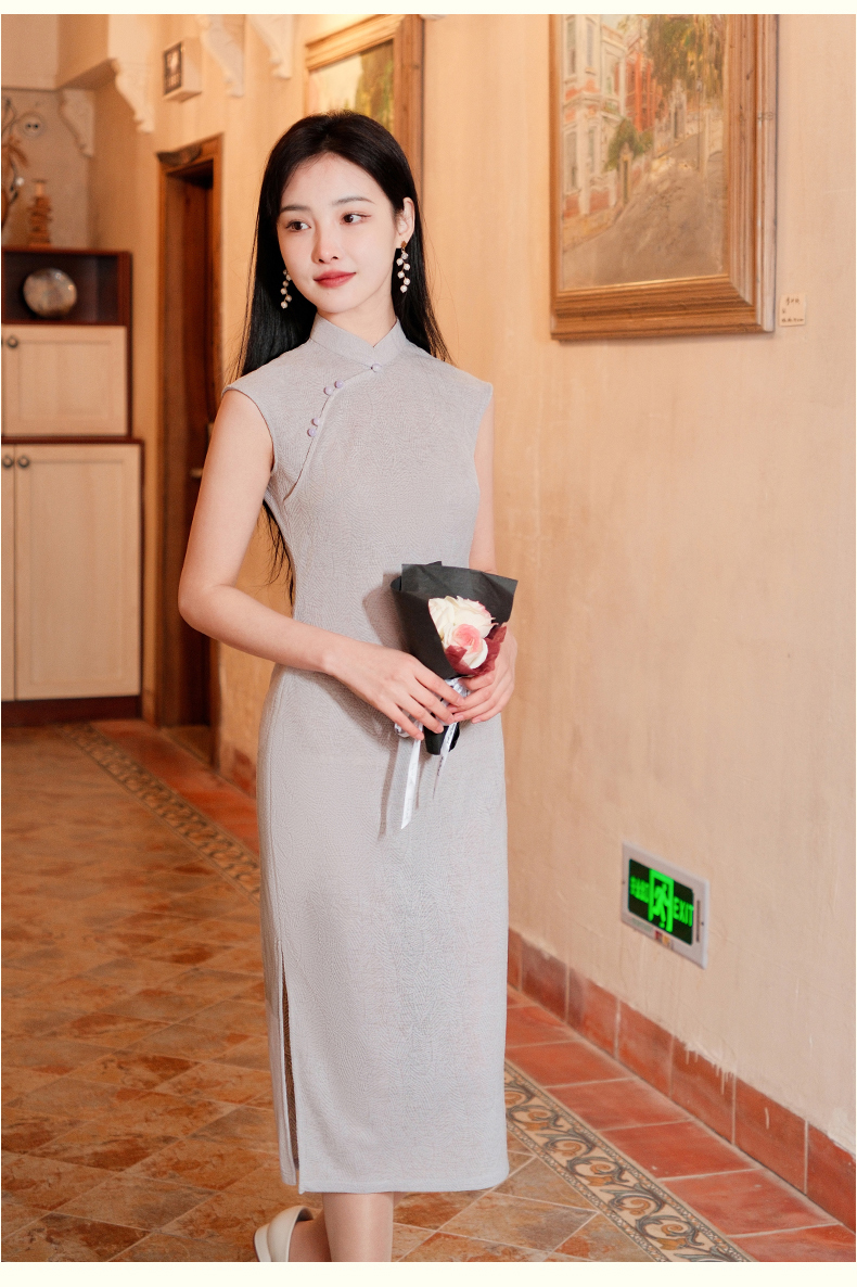 上海逸红颜紫翎2025夏新款弹力针织肌理感提花修身两件套文艺旗袍