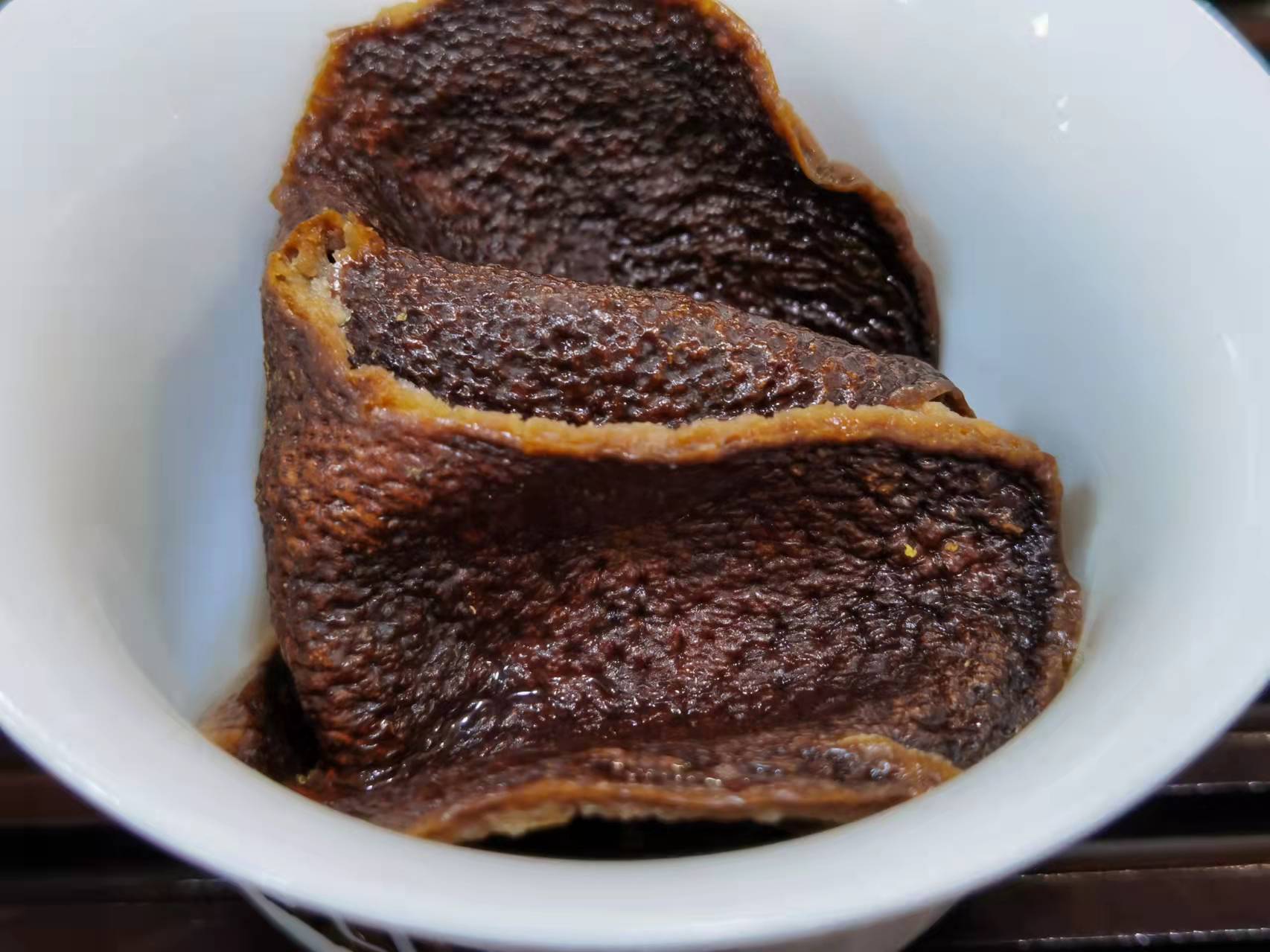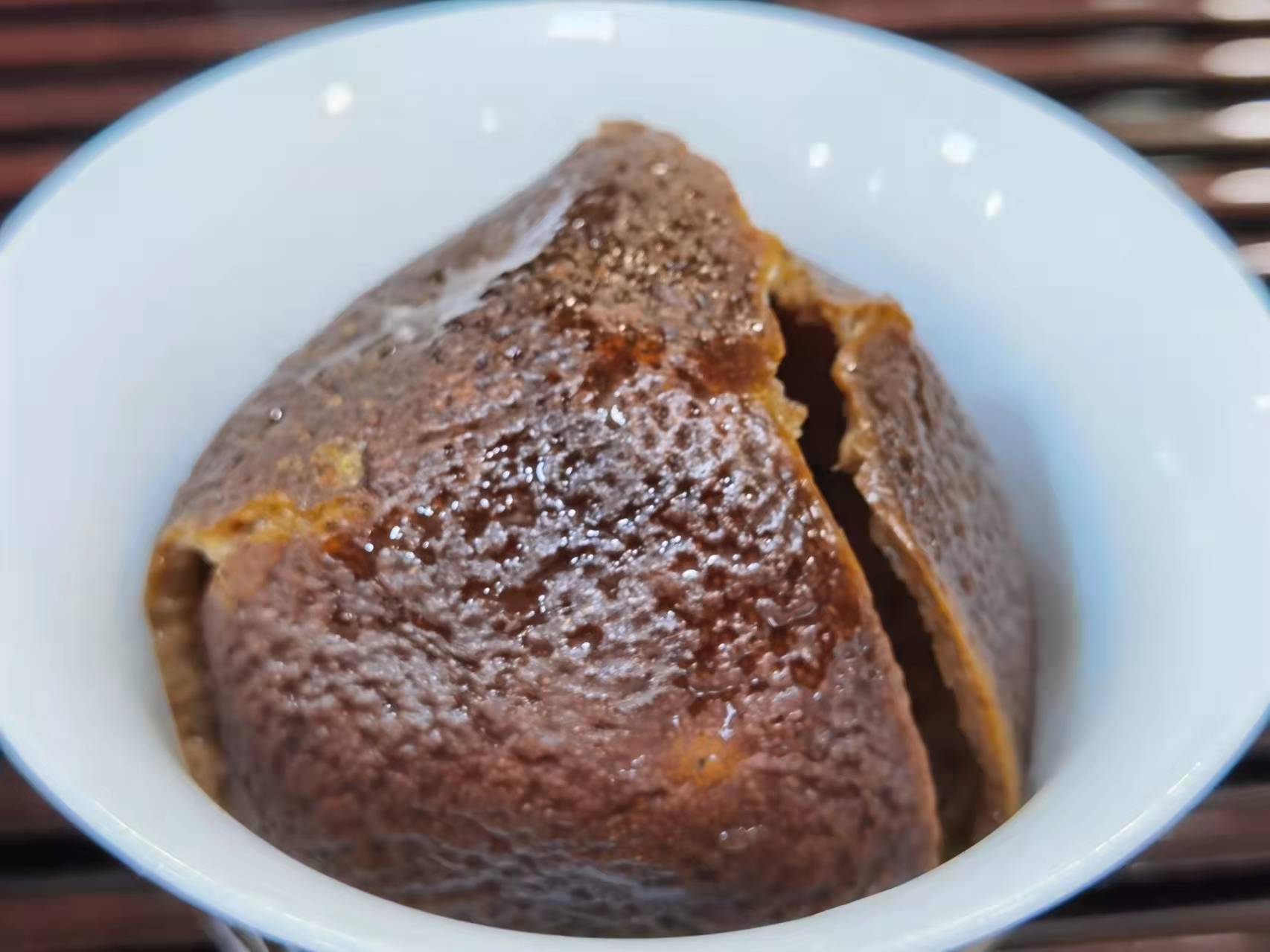 闻皮,有很好的陈香、柑香、扣开表层,香气更浓郁。