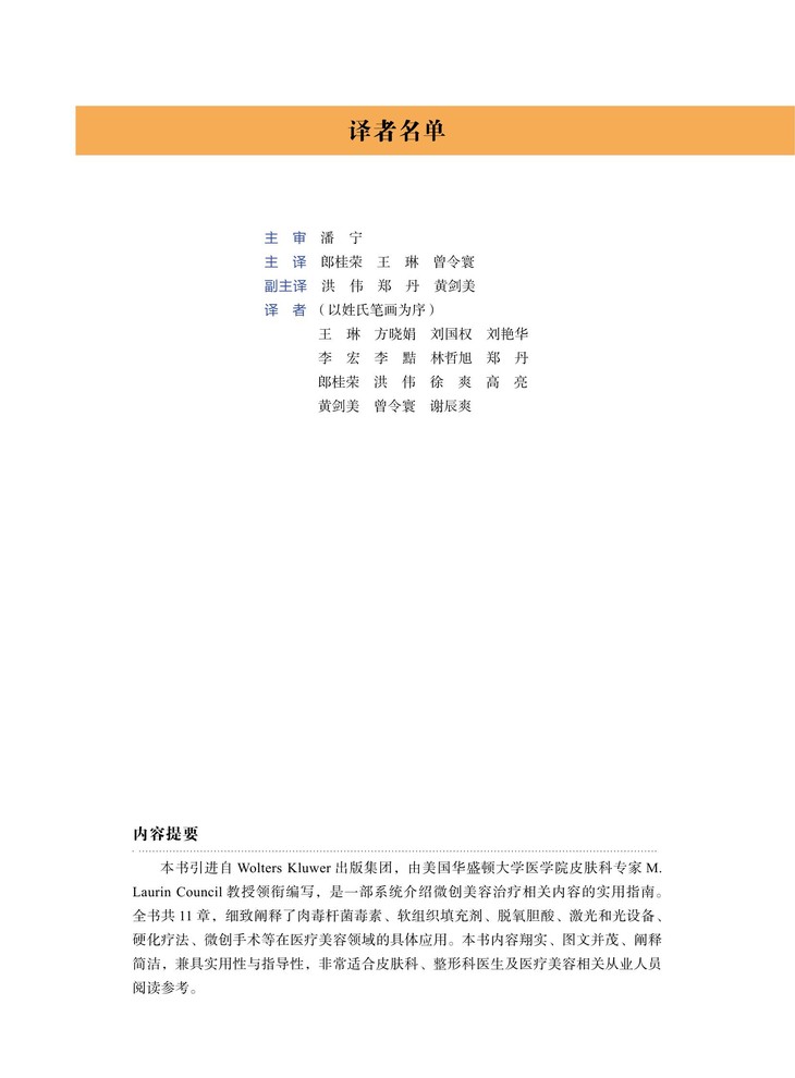 本书引进自 Wolters Kluwer 出版集团,由美国华盛顿大学医学院皮肤科专家 M. Laurin Council 教授领衔编写,是一部系统介绍微创美容治疗相关内容的实用指南。全书共 11 章,细致阐释了肉毒杆菌毒素、软组织填充剂、脱氧胆酸、激光和光设备、硬化疗法、微创手术等在医疗美容领域的具体应用。本书内容翔实、图文并茂、阐释简洁,兼具实用性与指导性,非常适合皮肤科、整形科医生及医疗美容相关从业人员阅读参考。