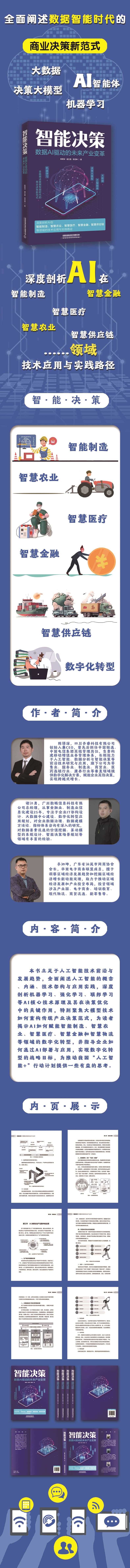 本书立足于AI技术前沿与发展趋势,全面阐述智能决策系统的概念内涵、关键技术与产业实践,深度剖析数据分析、深度学习、大模型等技术在智能决策领域的应用,分别从智能制造、智慧农业、智慧医疗、智慧金融、智慧供应链等多个维度,展现了智能决策技术在各产业领域的落地路径,并指导企业如何通过AI部署与应用,实现数字化转型的战略目标。本书适合ICT产业从业者、技术研发人员、AI产业投资者、企业决策者与创业者阅读参考,也可以作为智能科学与技术、电子与计算机工程等相关专业的高校师生教材参考。