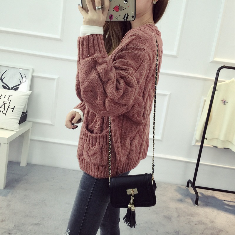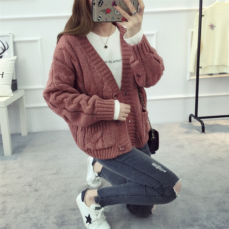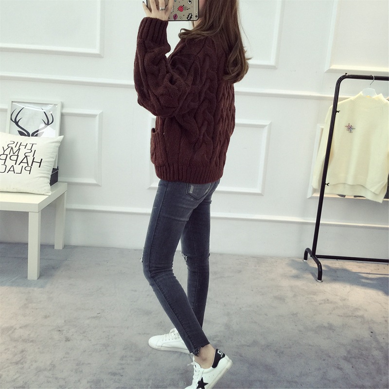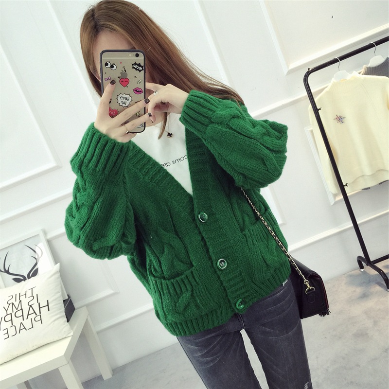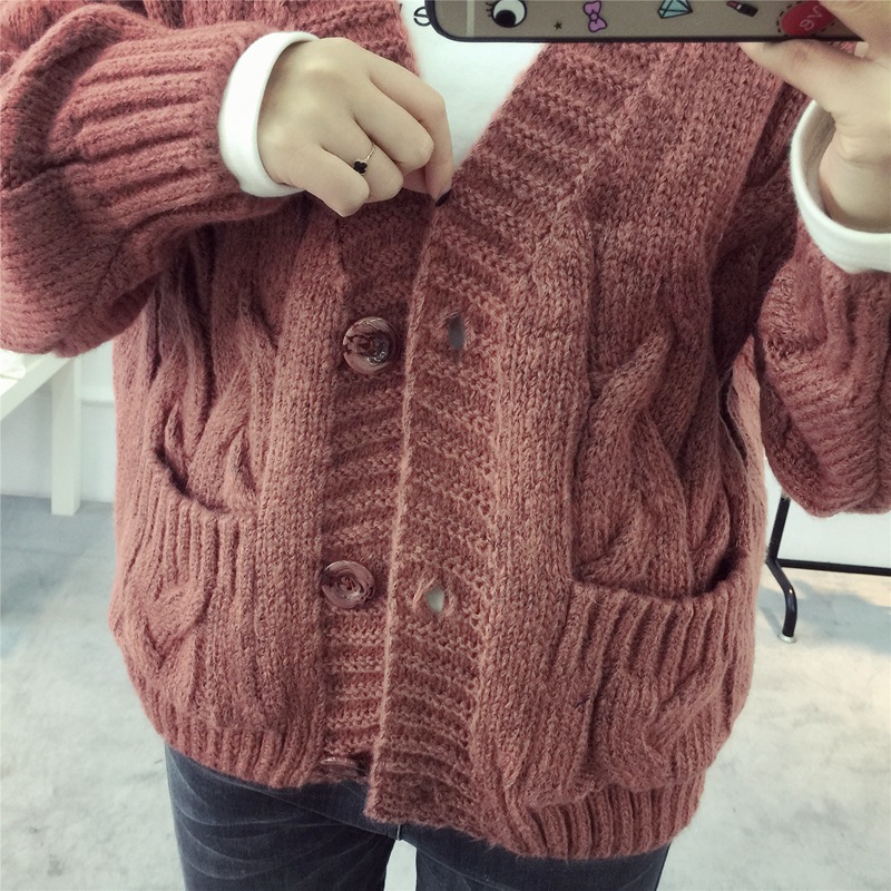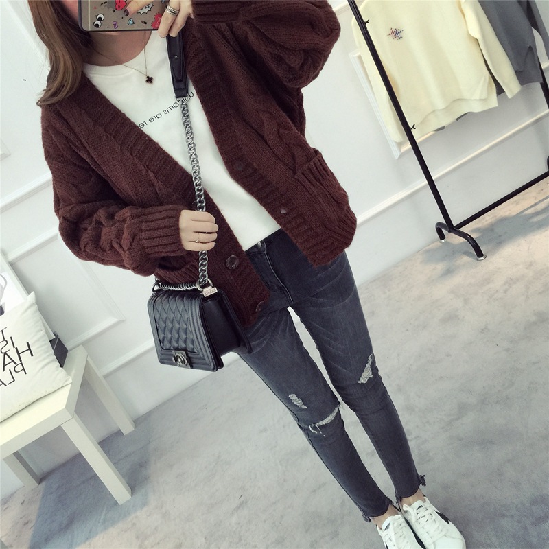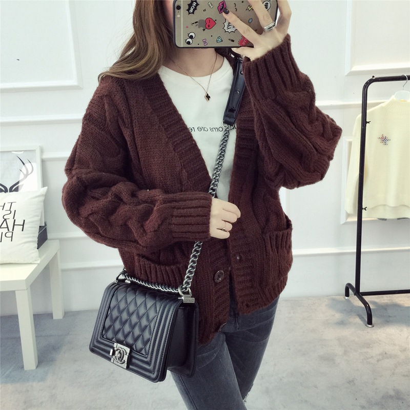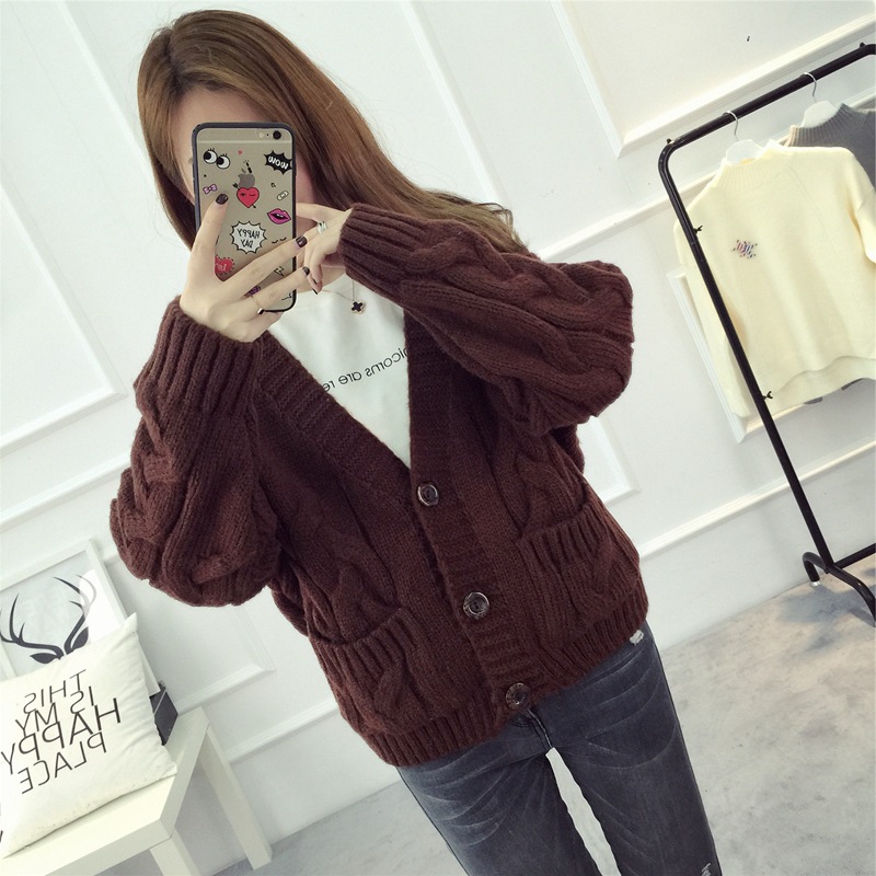 【服饰鞋包】毛衣 女春秋短款韩版女装潮宽松麻花新款V领开衫针织衫厚外套