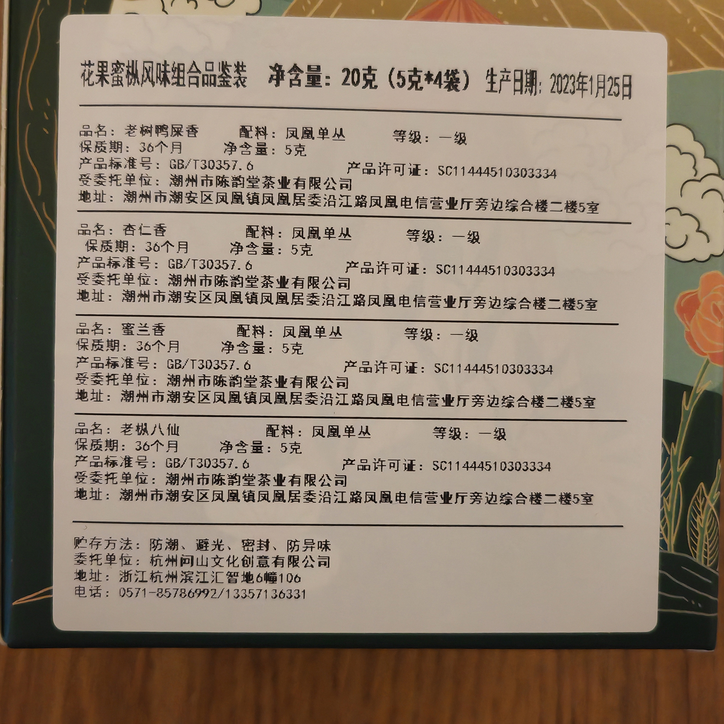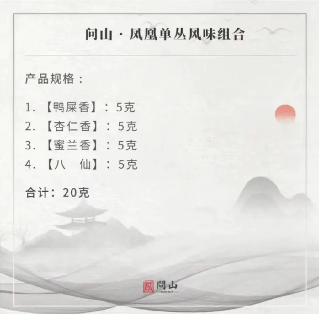 花果蜜枞组合,精选了鸭屎香、杏仁香、蜜兰香、八仙四款茶品,一次尝遍四种代表性香型。
