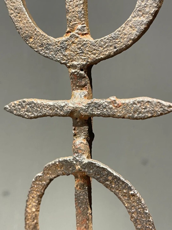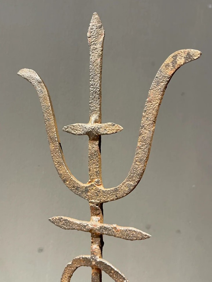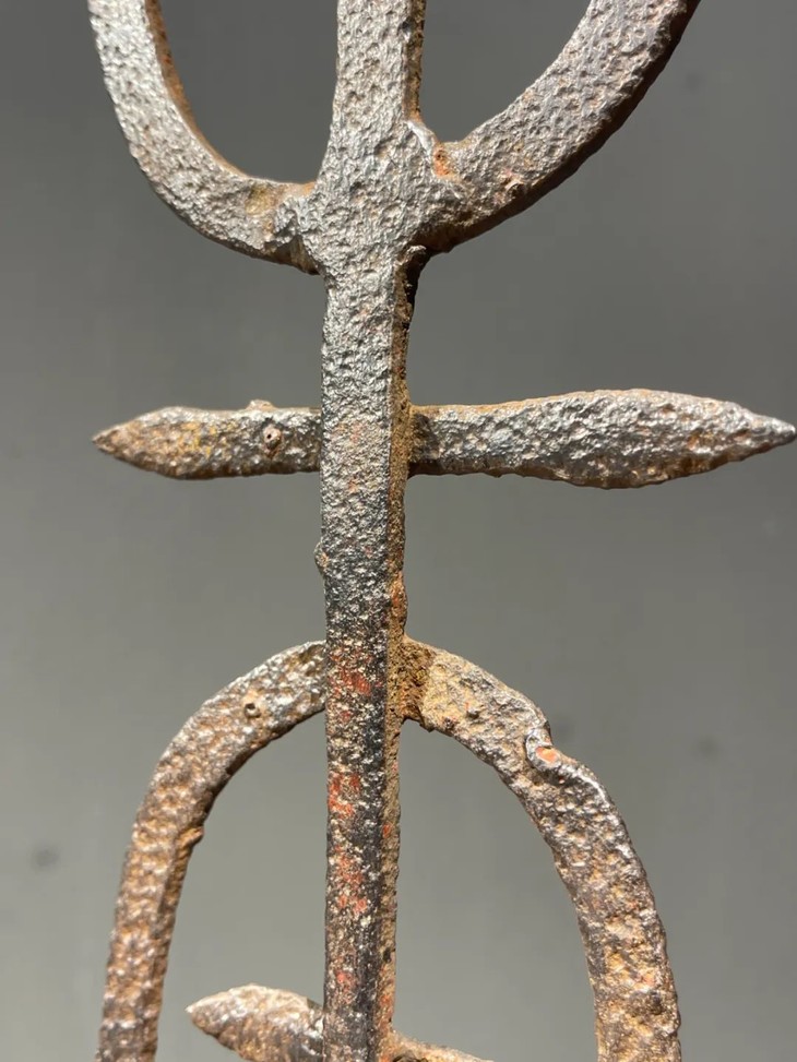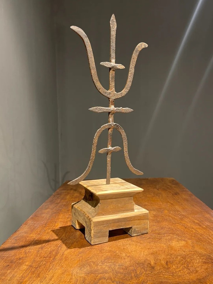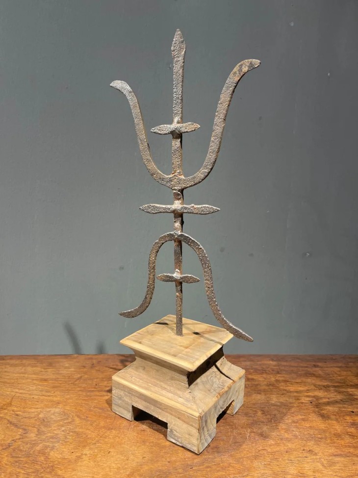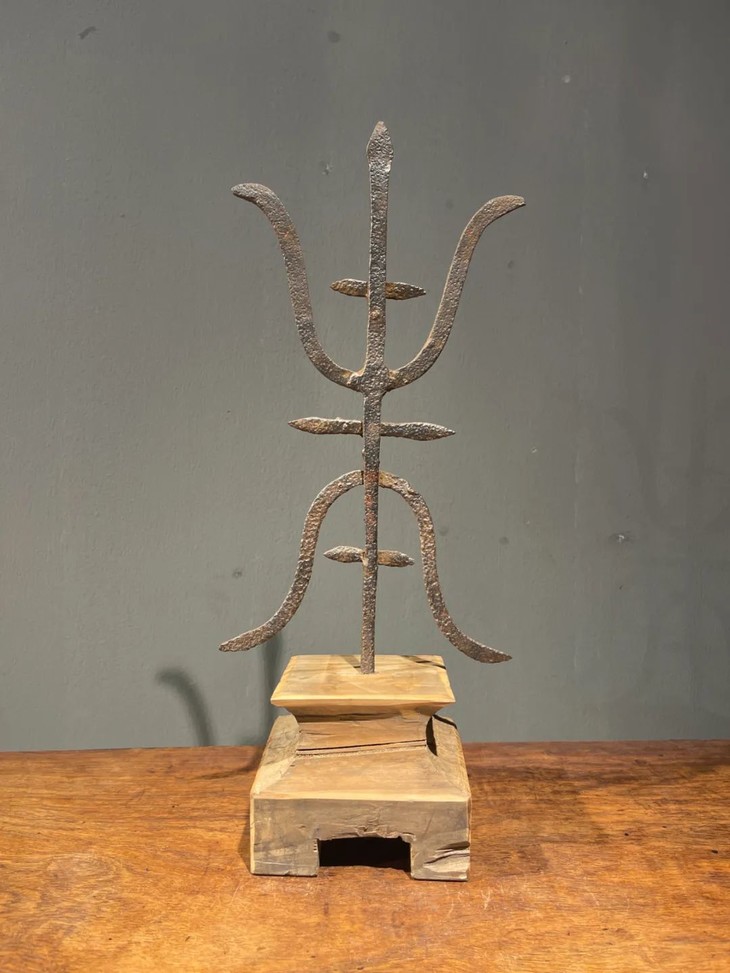 这是一件历史久的铁质”壽”字型烛台,手工铸造捶打成铁片状篆体壽字笔划组合而成的烛台,高逾四十厘米的烛台形式简约、制作严谨,是经典庙宇佛前供奉烛台。
