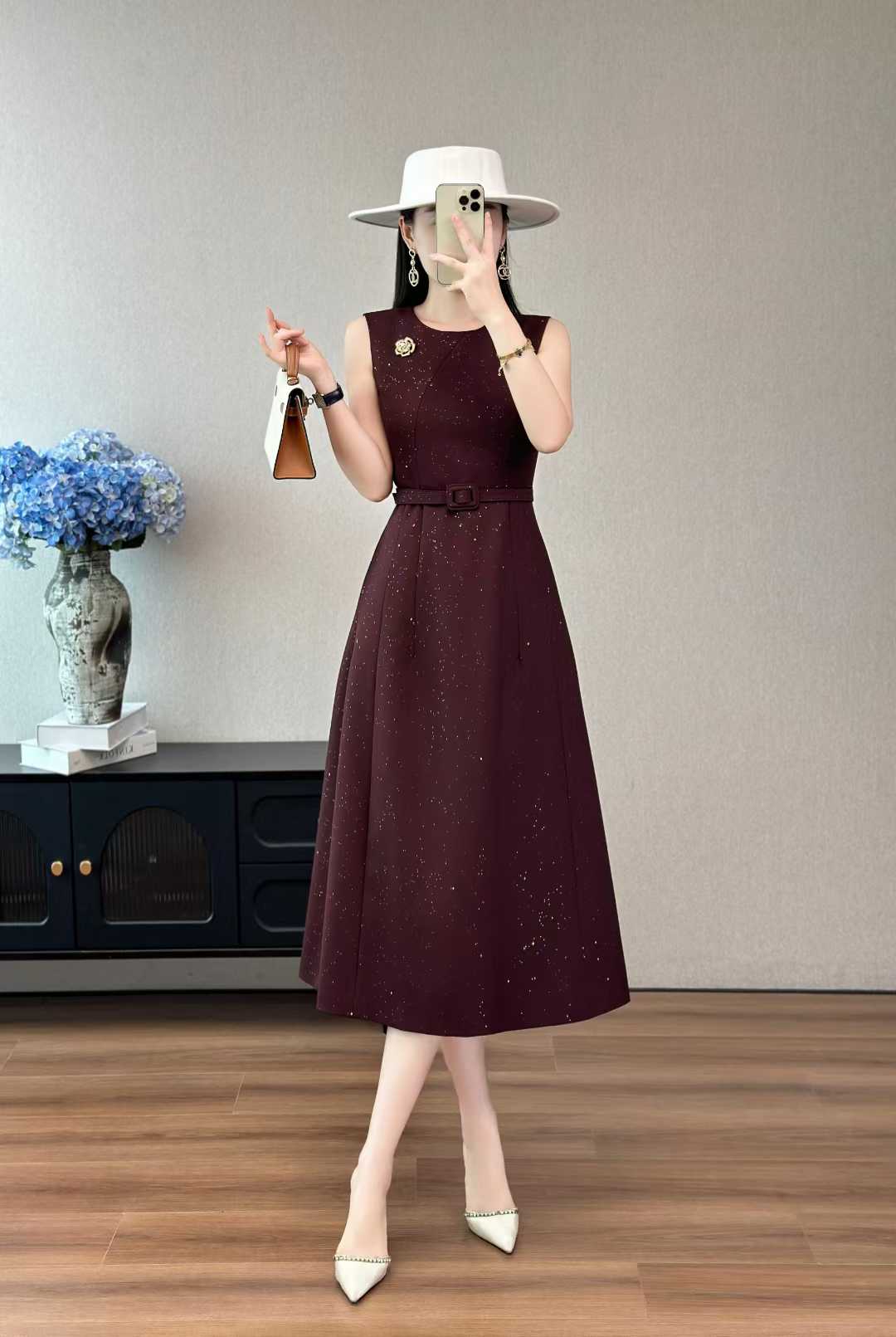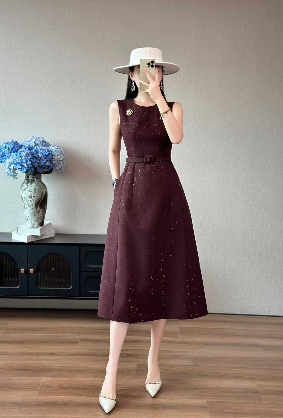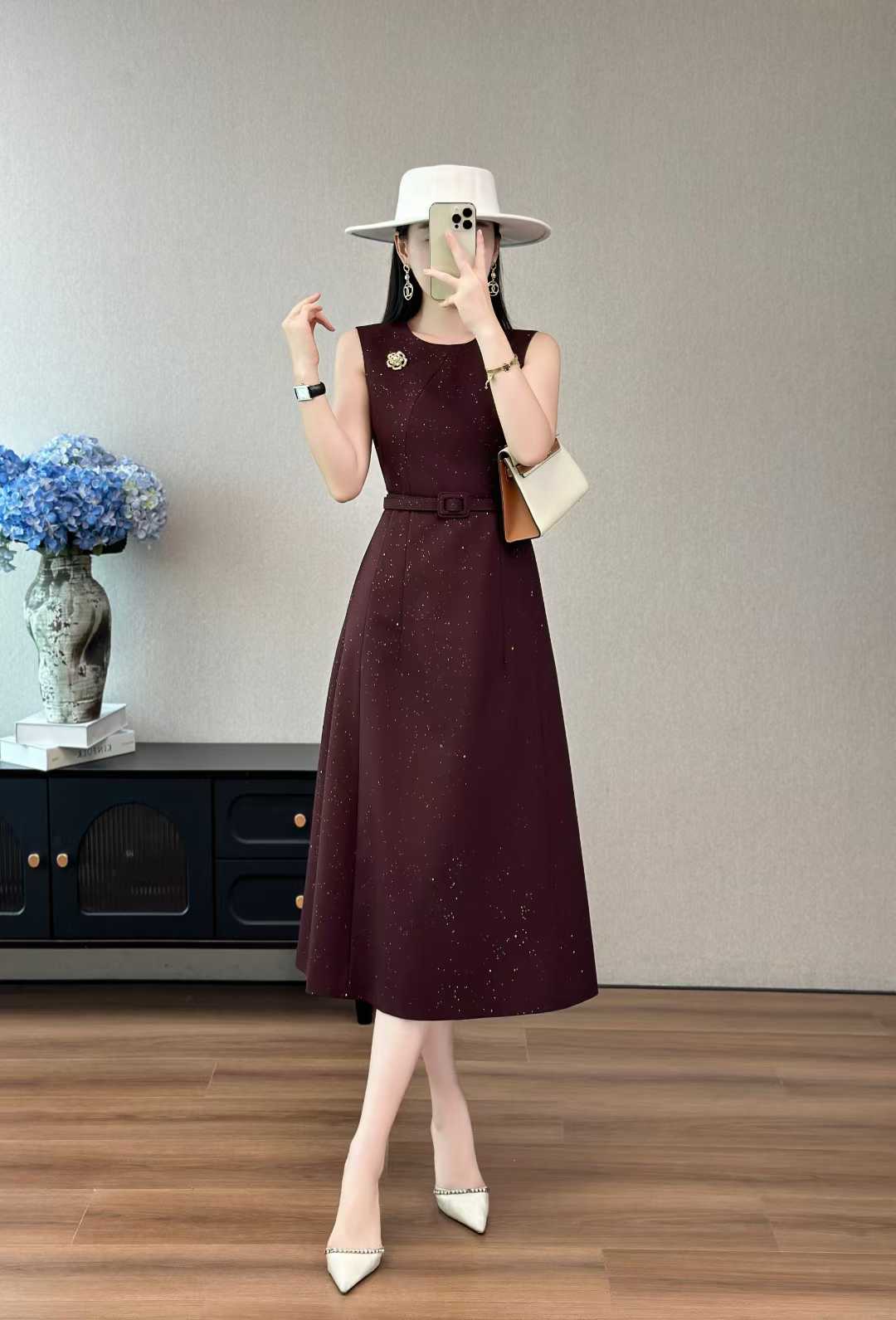 SZ3S67 酒红色 背心连衣裙 细斜纹TR料 手感柔软有质感 版型显瘦 酒红色底洒满细闪,像把银河穿在身上! 无袖设计露出肩颈线 圆领简约又大气 胸口的小金花胸针是点睛之笔 精致感拉满!