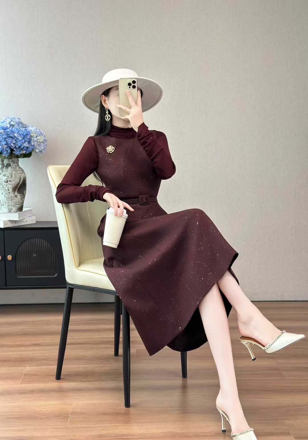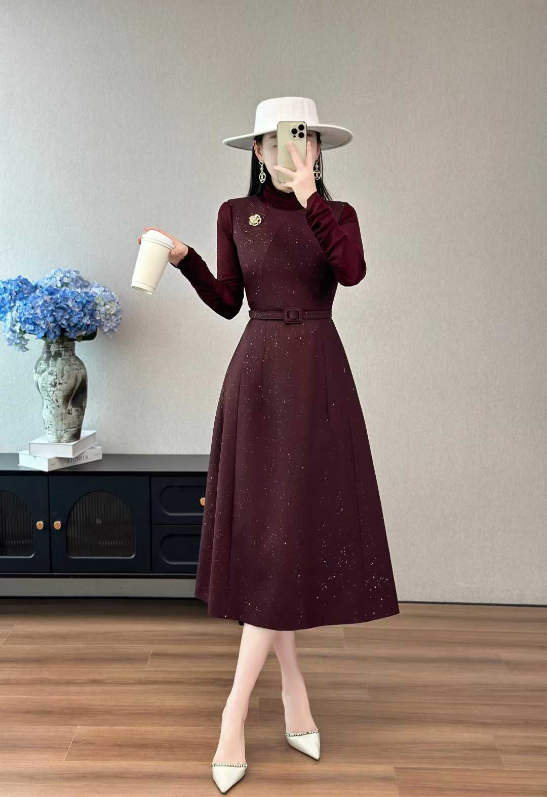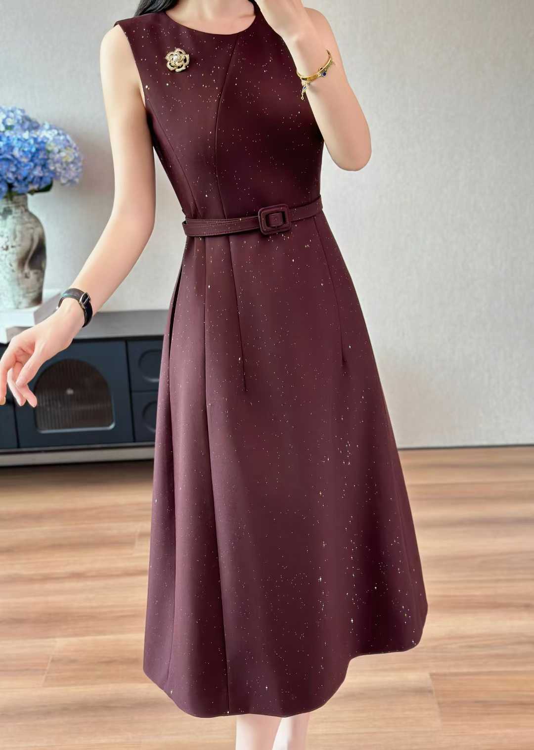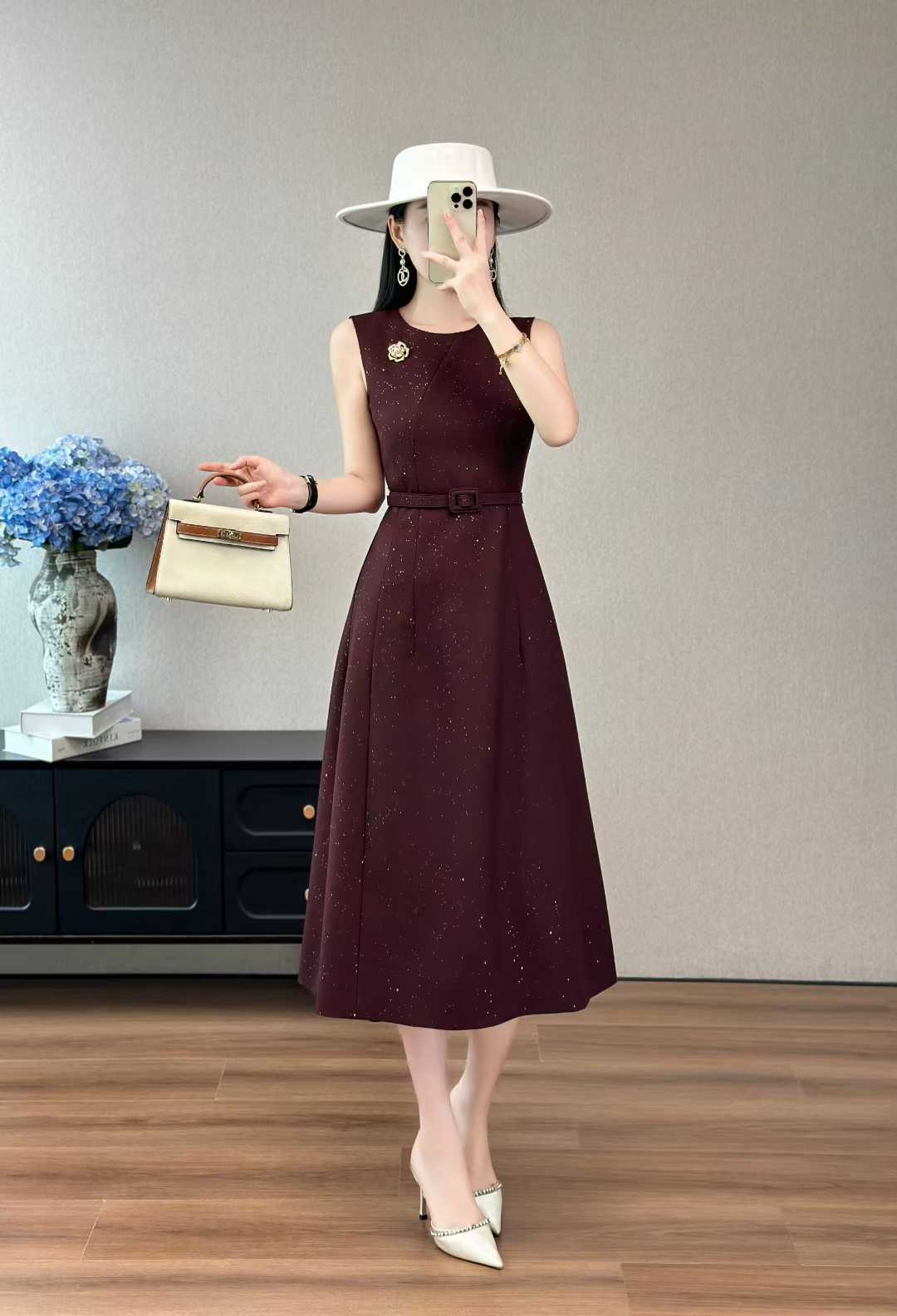 SZ3S67 酒红色 背心连衣裙 细斜纹TR料 手感柔软有质感 版型显瘦 酒红色底洒满细闪,像把银河穿在身上! 无袖设计露出肩颈线 圆领简约又大气 胸口的小金花胸针是点睛之笔 精致感拉满!