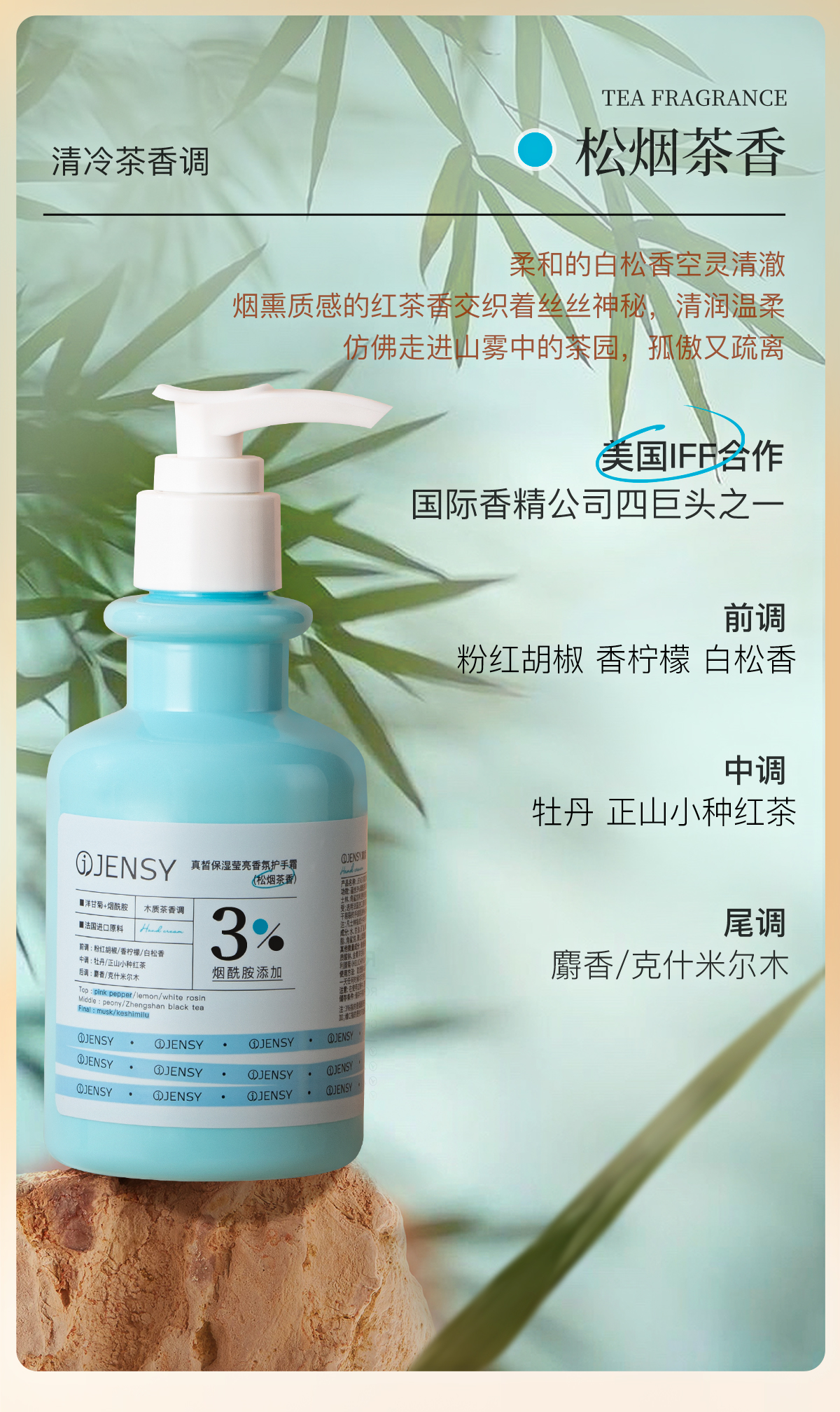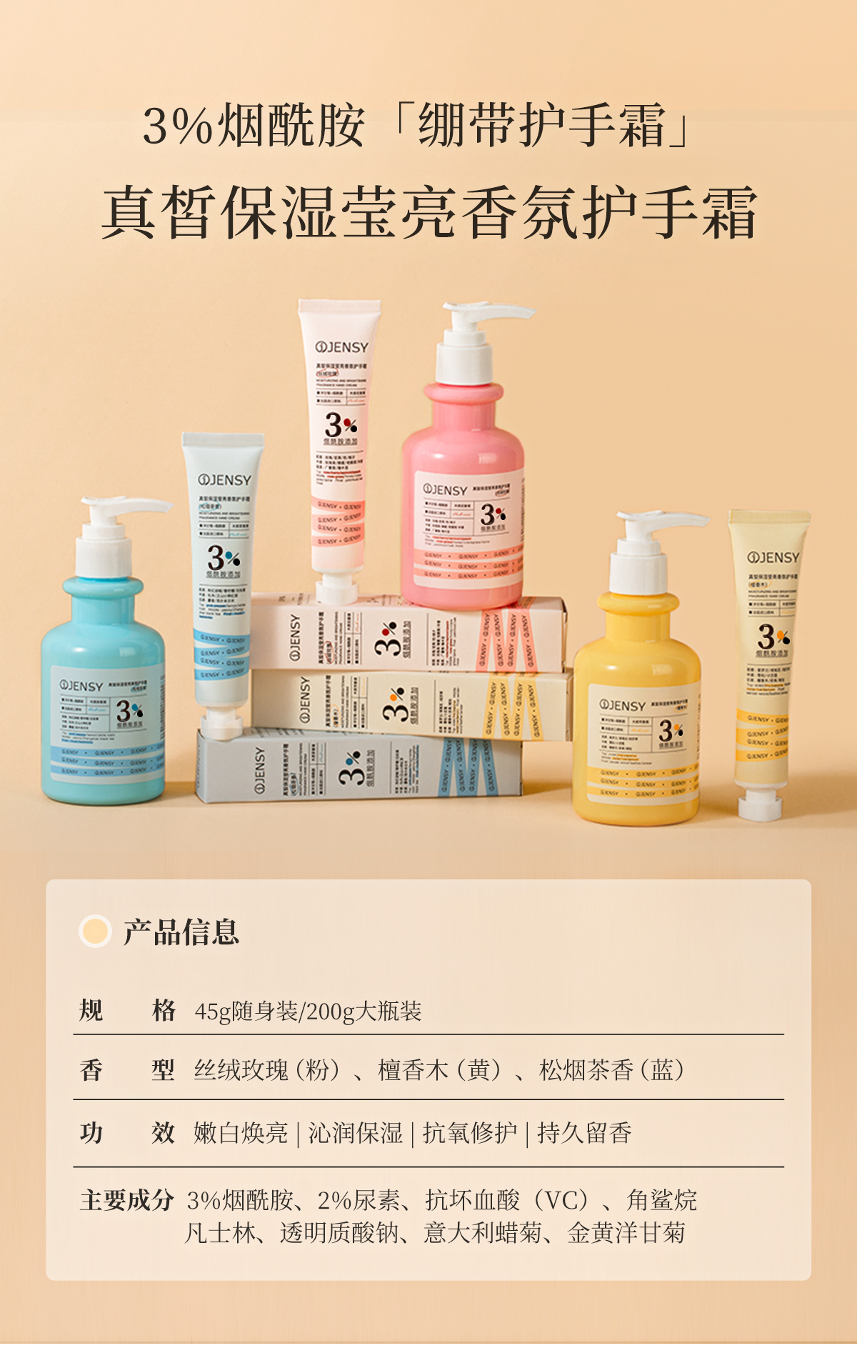| 【品名】真皙Jensy 3%烟酰胺香氛护手霜 持久留香 200g/瓶 【规格】200g/瓶 丝绒玫瑰,松烟茶香,檀香木 【产地】国内 【保质期】3年 【发货包装】独立包装瓶 【发货地】广东 【发货快递】韵达 【不发货区域】新疆、西藏、港澳台 【发货时效】48-72小时,周末节假日顺延 |