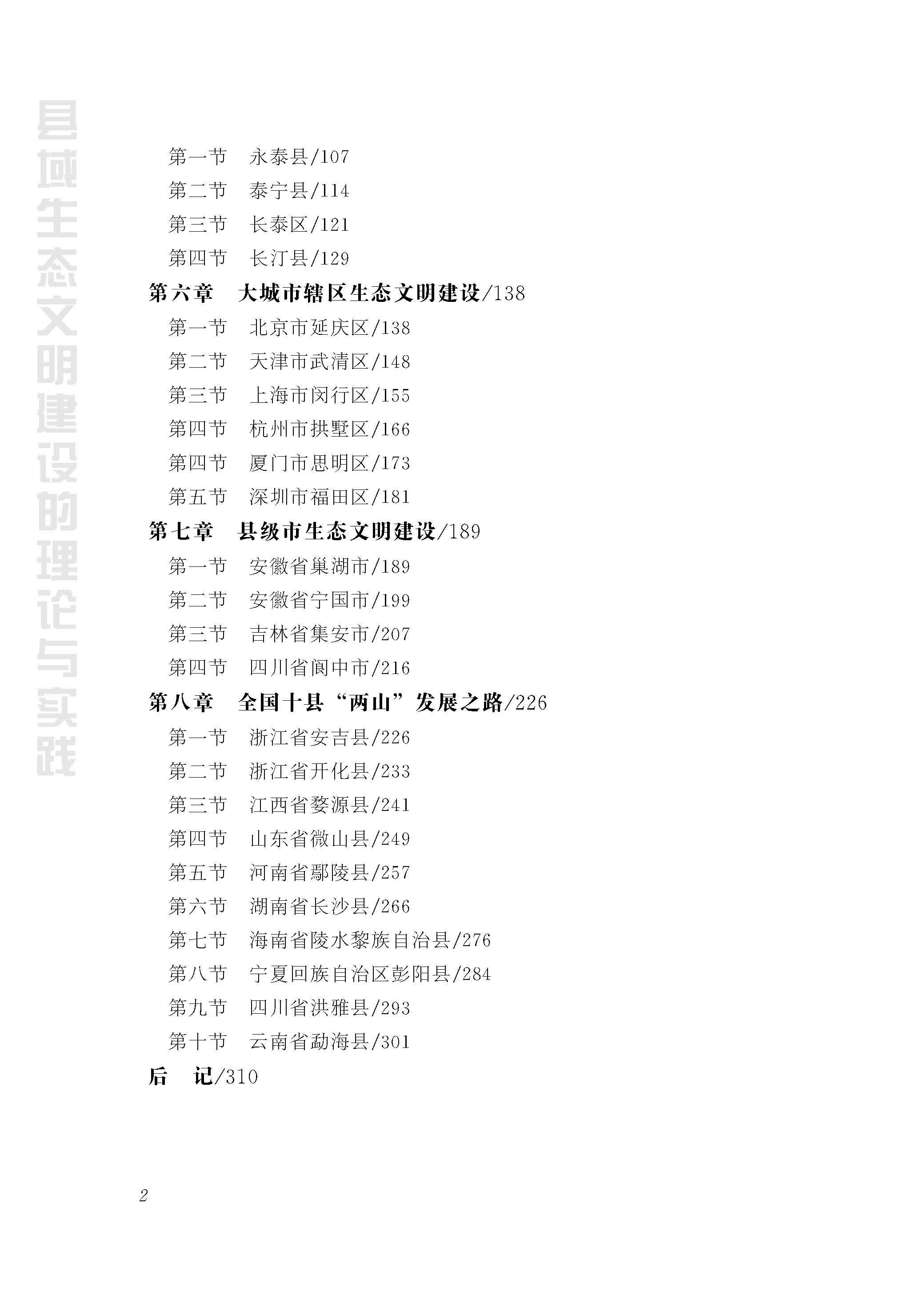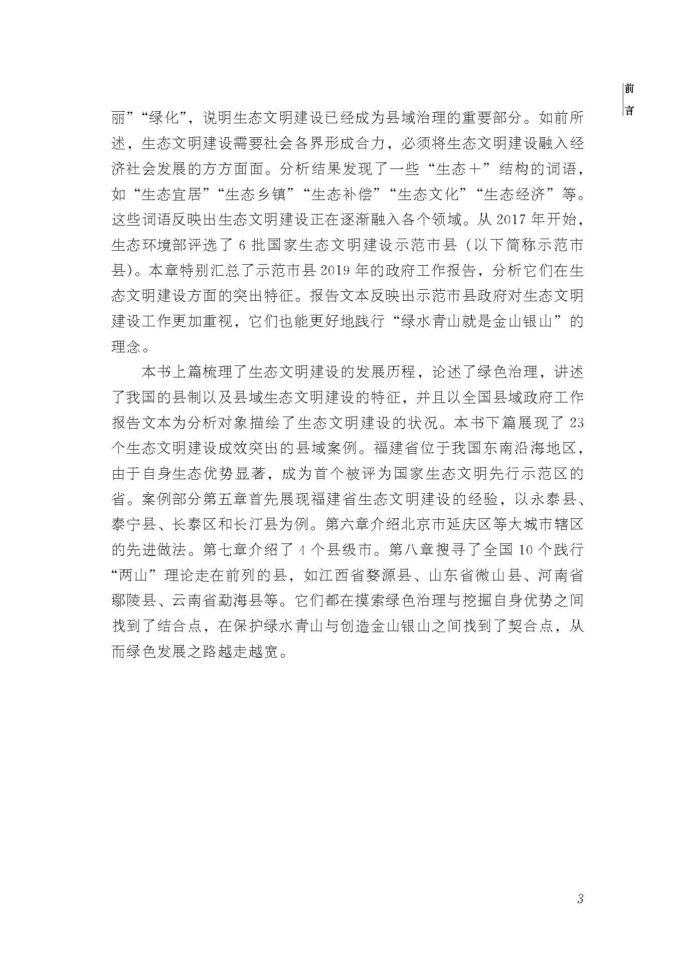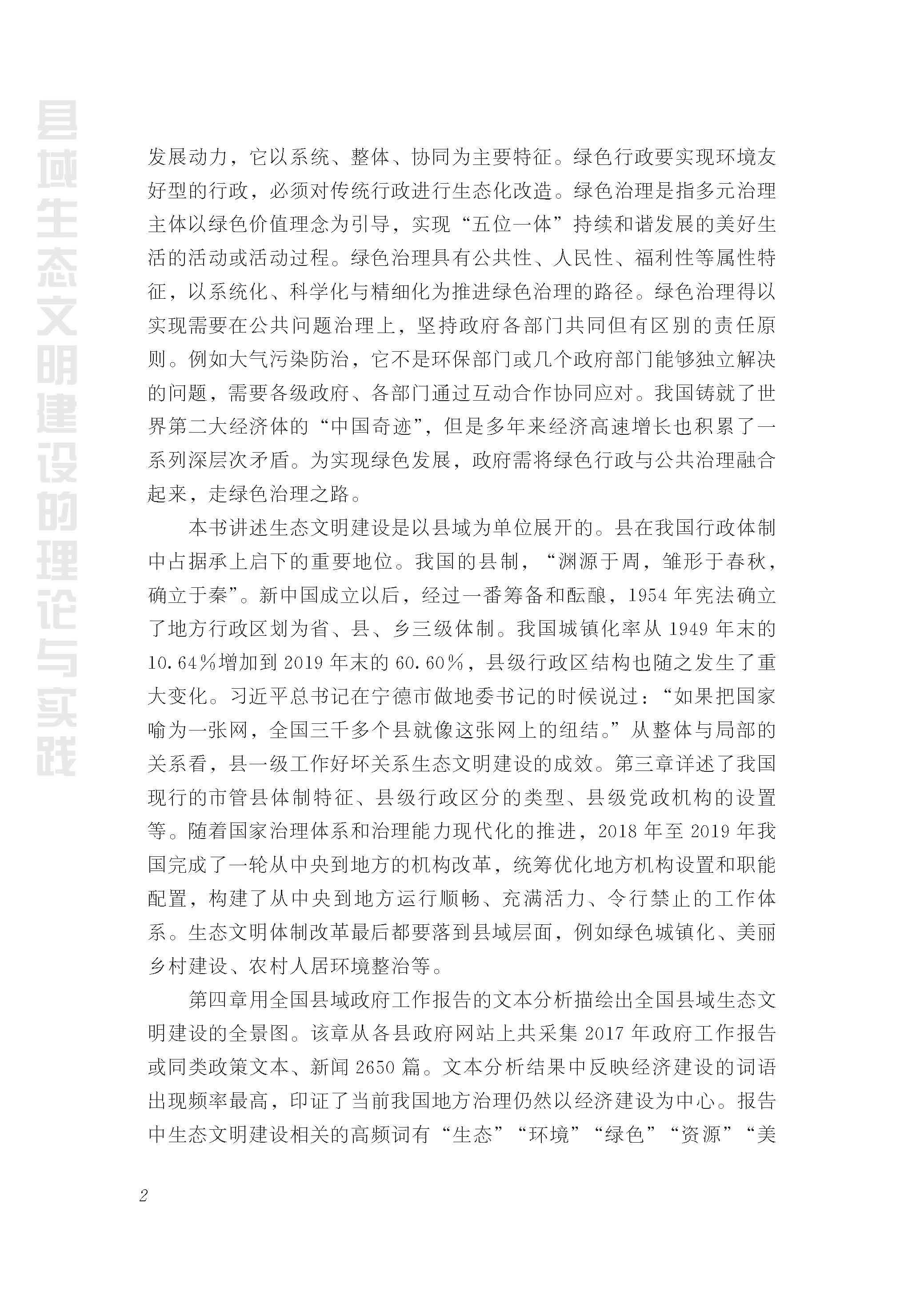 本书分理论篇和案例篇两部分。理论篇论述了中国生态文明建设的历程、生态文明体系与制度的建立,以及从传统行政到绿色治理的转变过程。在此基础上,重点阐述了县域生态文明治理现代化及县域生态文明建设的基本情况。案例篇则聚焦生态文明建设的典型案例,总结了我国生态文明试验区(福建)、大城市辖区、县级市和全国十县绿色治理和生态文明建设的生动实践和丰富经验,反映了近年来在习近平生态文明思想指引下,我国县域生态文明建设取得的一系列成就。