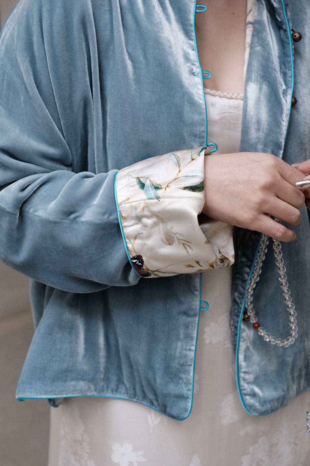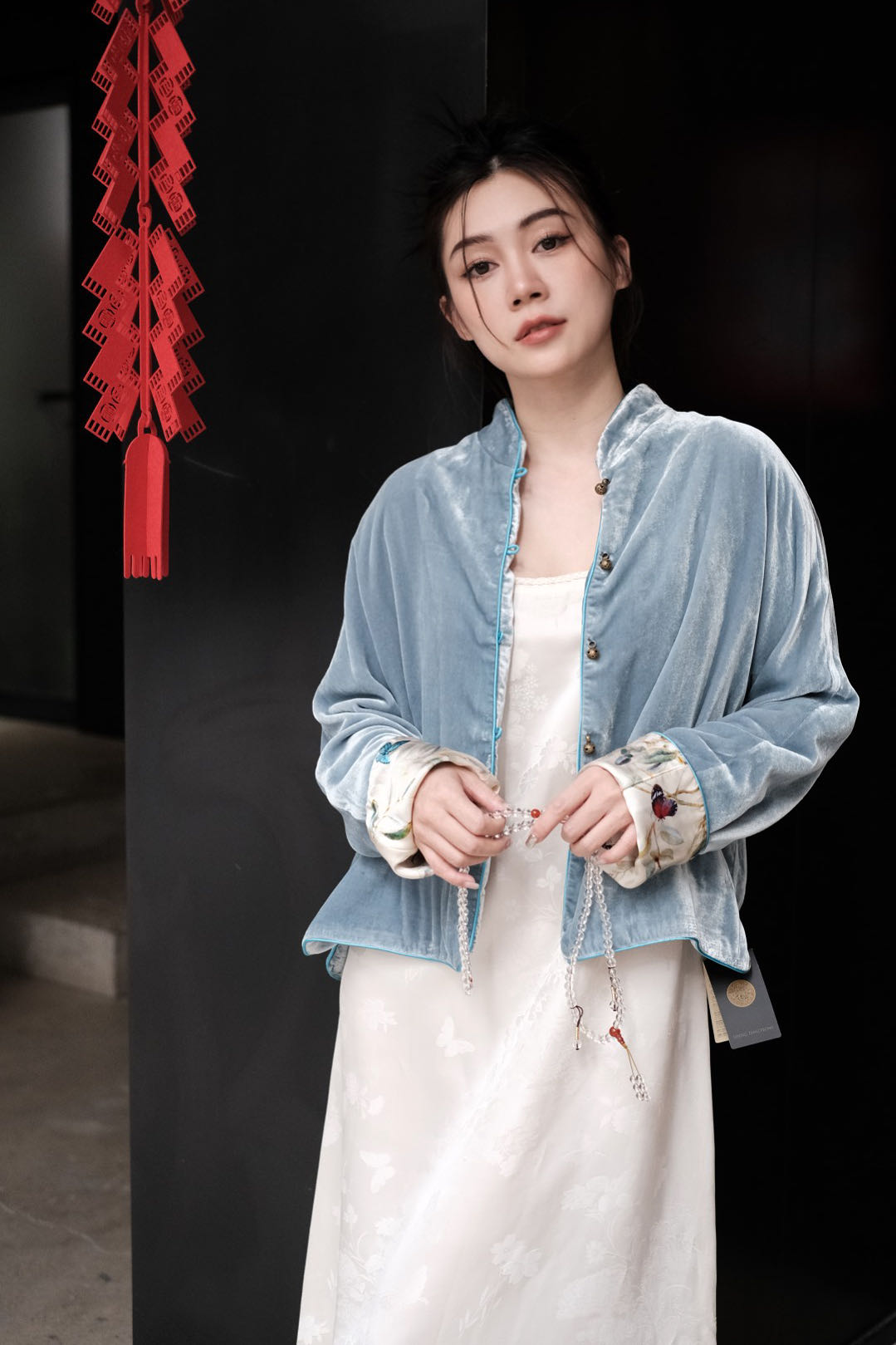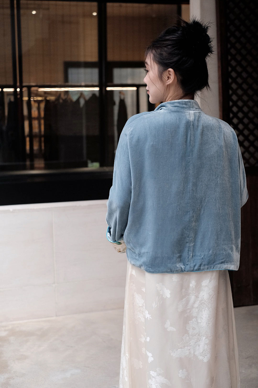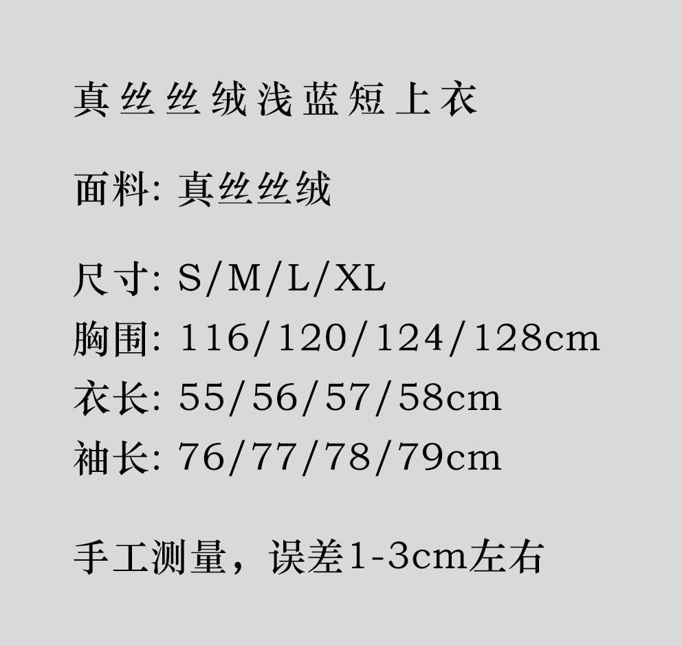 微瑕秒杀| 盛唐牡丹 |真丝丝绒浅蓝短上衣[特价品](特殊商品不退不换)
