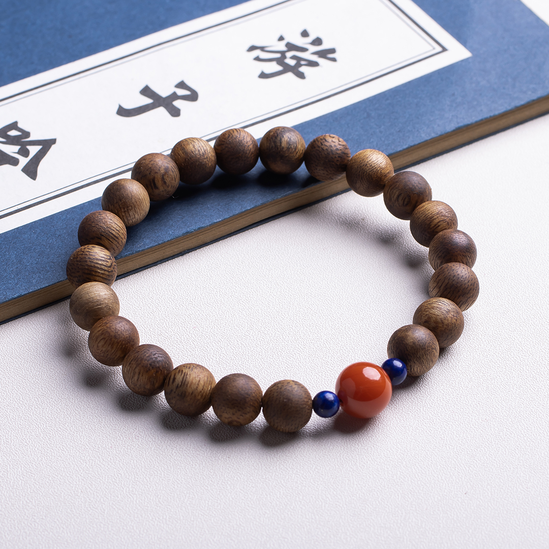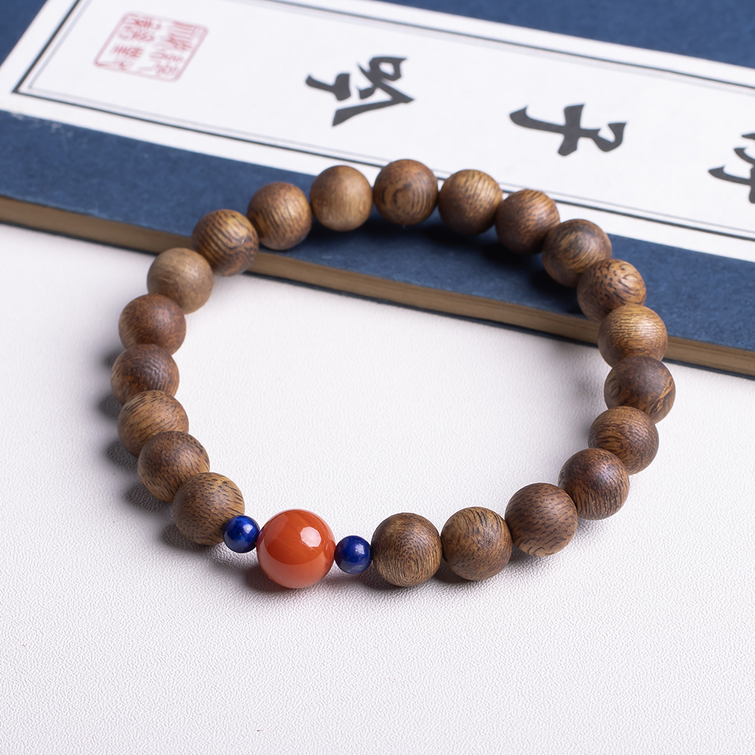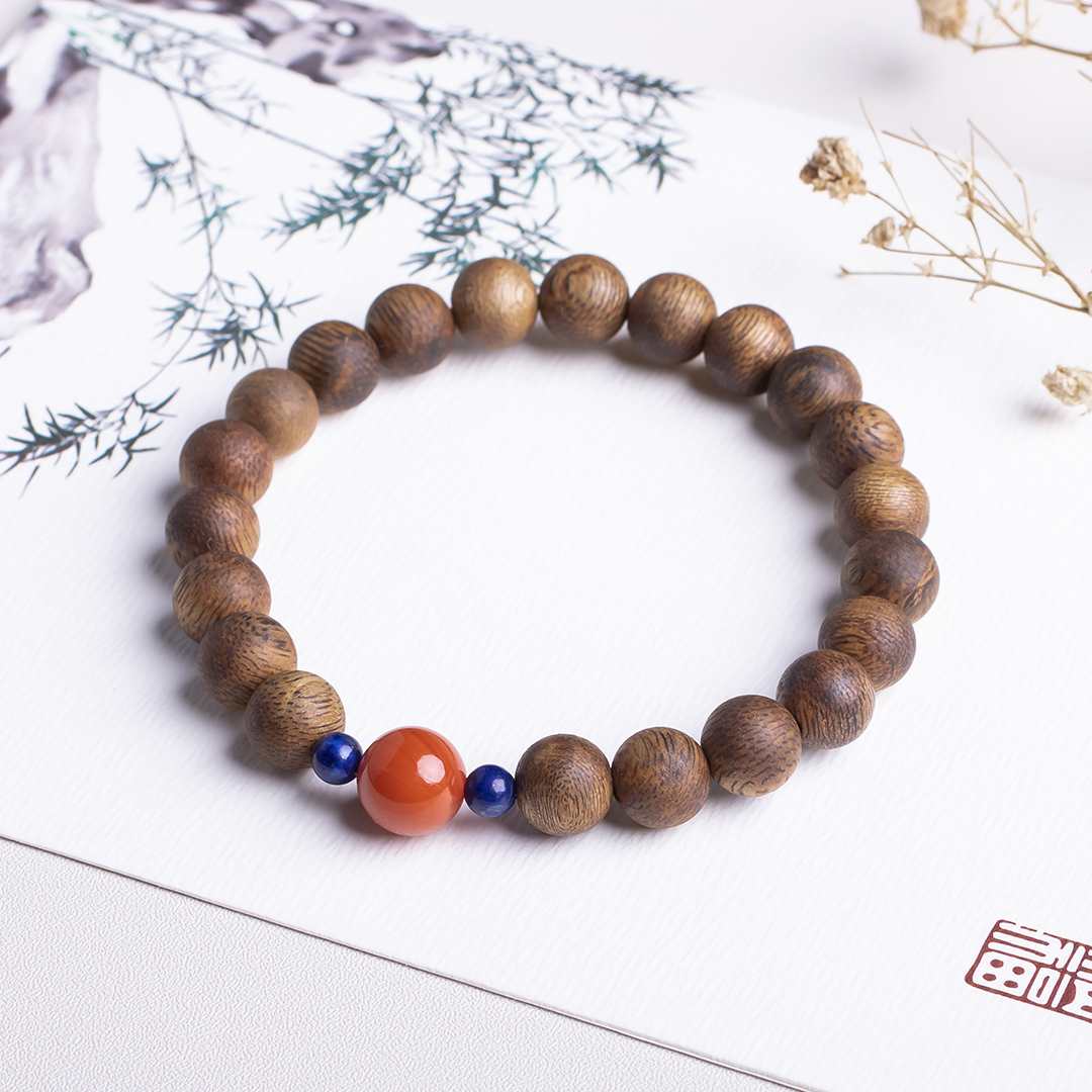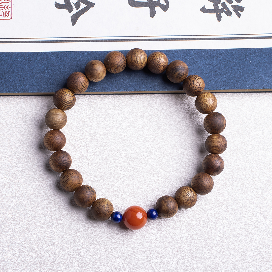 xy0412沉香+志红青金石手串,天然沉香约8.3mm,原色原味,香味自然清甜,一颗满色肉南红两颗青金石相衬,古典中的经典,上手典雅大方,吉祥和顺。