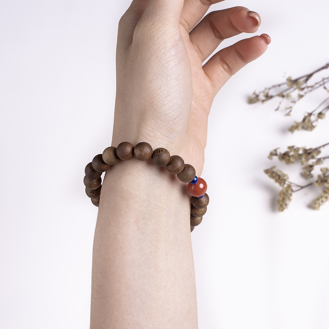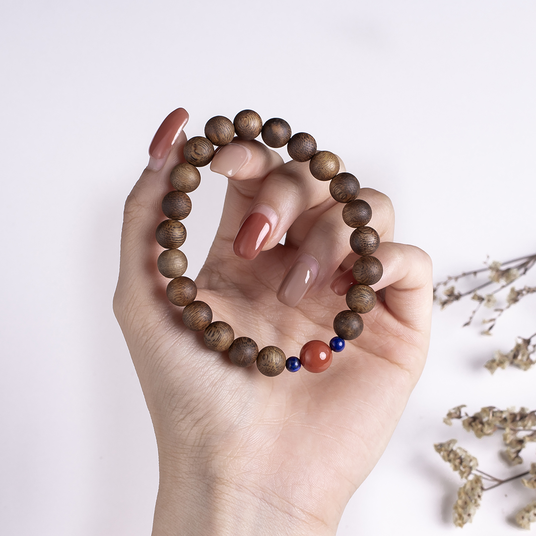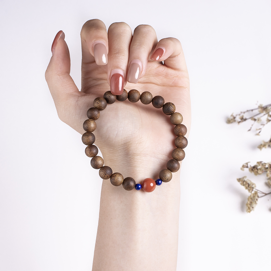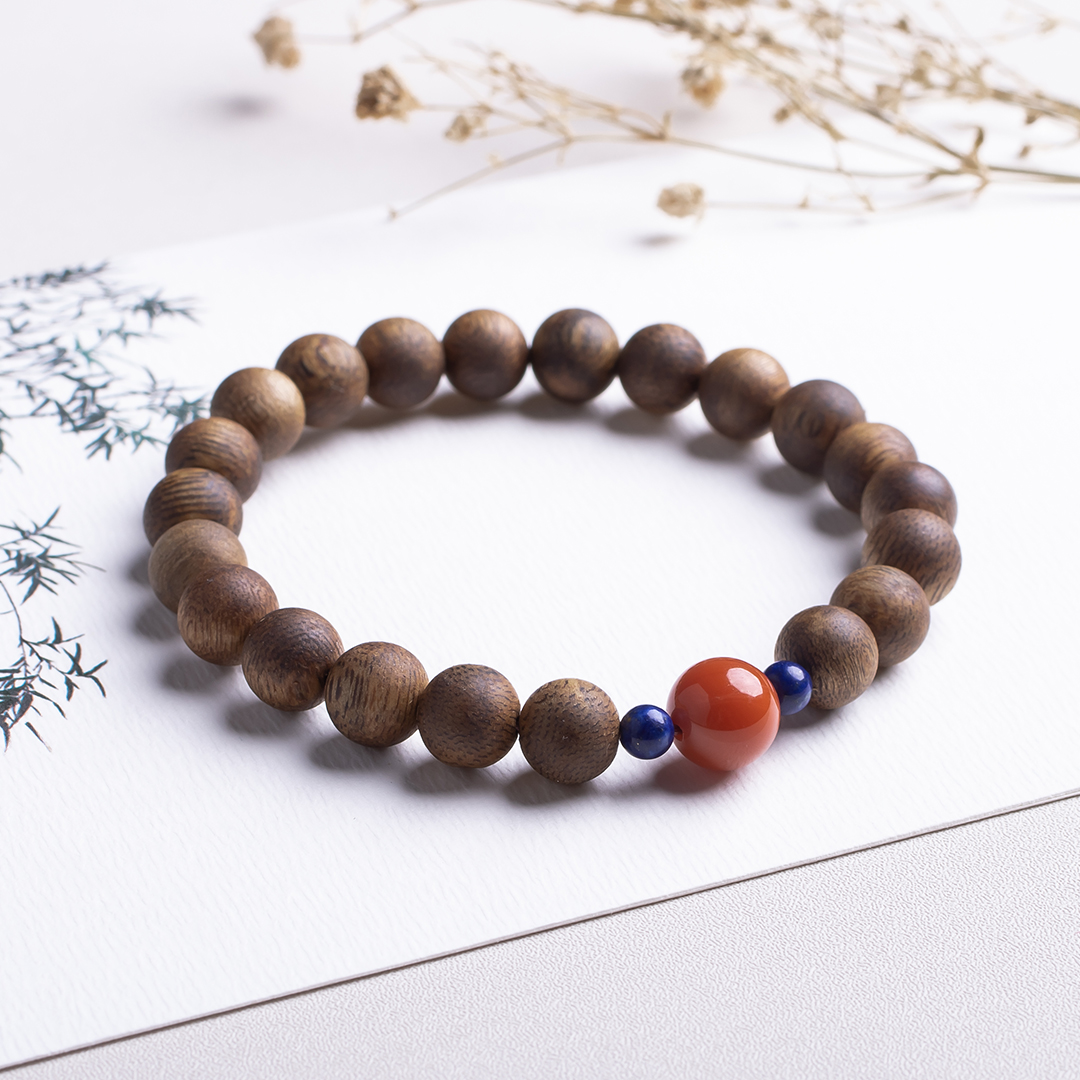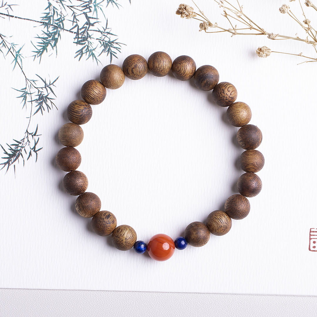 xy0412沉香+志红青金石手串,天然沉香约8.3mm,原色原味,香味自然清甜,一颗满色肉南红两颗青金石相衬,古典中的经典,上手典雅大方,吉祥和顺。