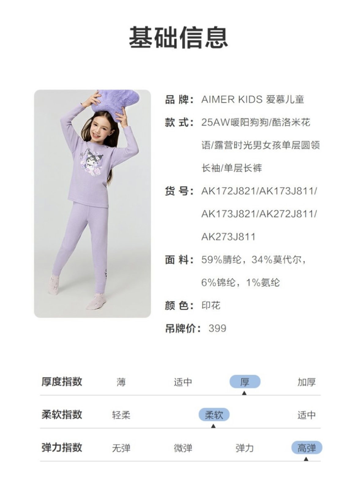 【春上新】8楼爱慕儿童Aimer Kids女孩25AW暖阳酷洛米花语单层圆领长袖AK172J821,吊牌价399元