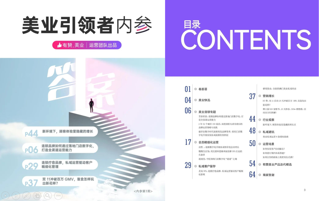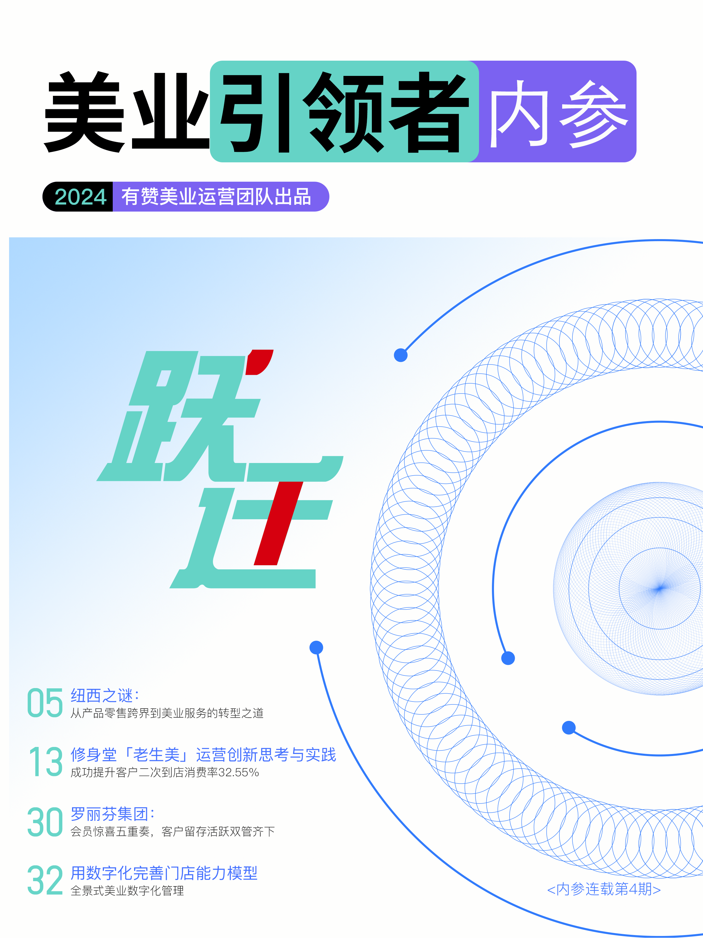 通过大量不同细分行业项目的交付,以及对品牌创始人和操盘手的持续高频拜访,我们积累并萃取了众多运营方法和最佳实践。作为美业连锁经营的好伙伴和商家最佳实践的推广者,我们特别希望这些运营方法和最佳实践能够帮助更多品牌解决经营问题,并带来业绩增长。2024年2月26日,我们正式推出《有赞美业引领者内参》第1期。