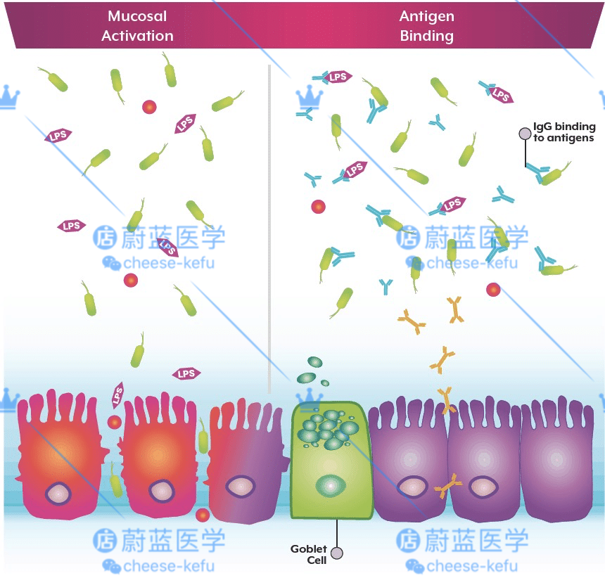 右侧:IgG抗体可结合并中和这些抗原,然后才能触发粘膜和肠道炎症。